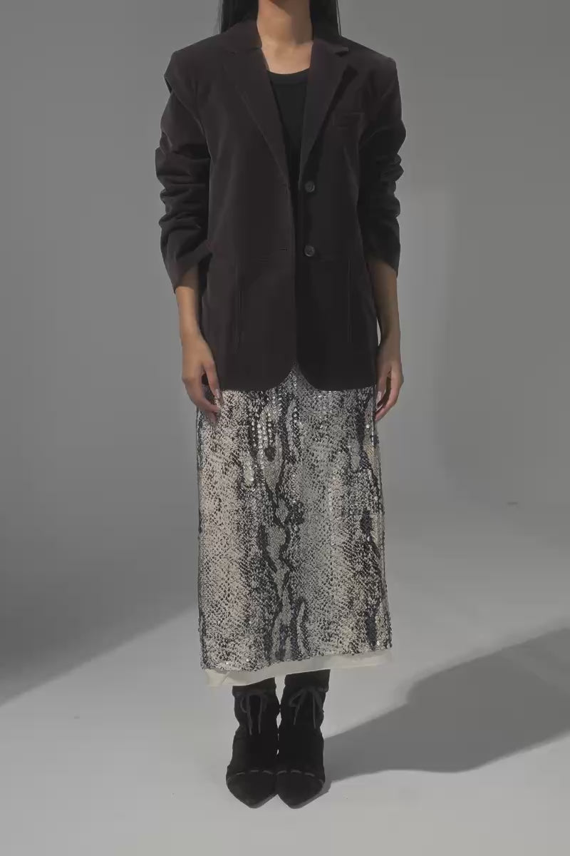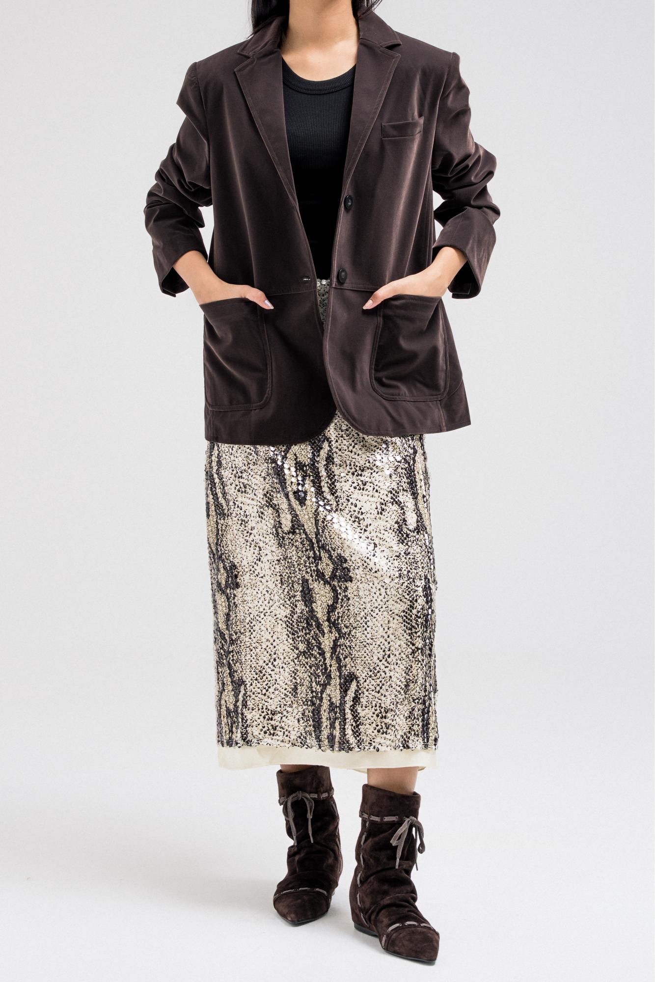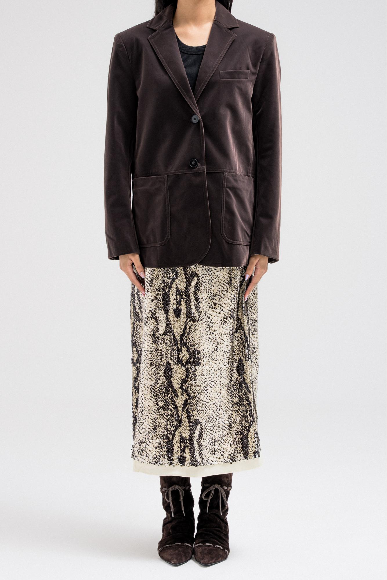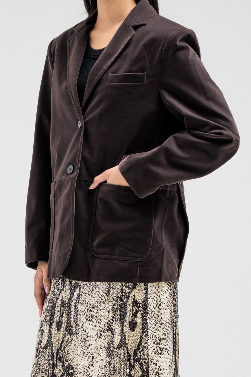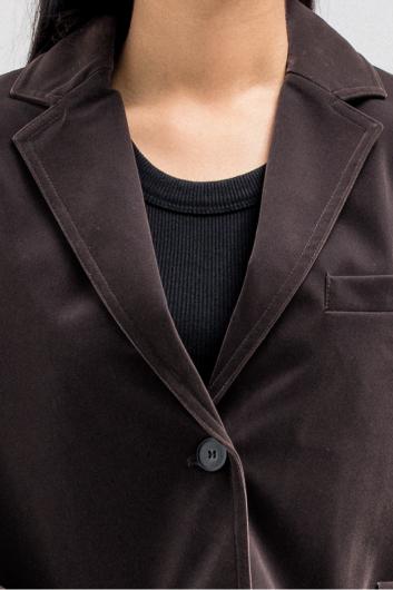 A soft velvet-finish blazer that adds a touch of luxury to any outfit. It features front button closure, a classic lapel collar, and clean front pockets.