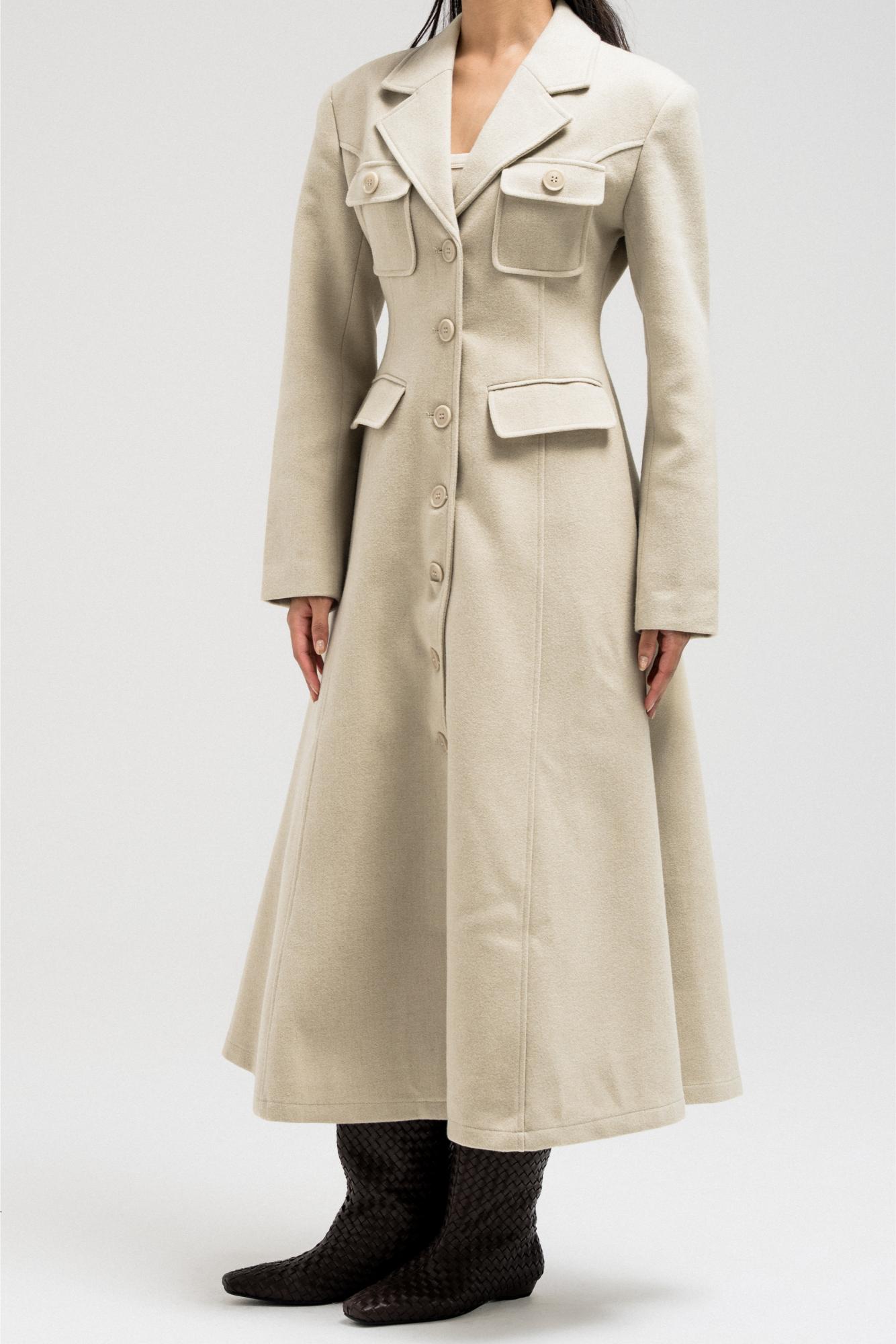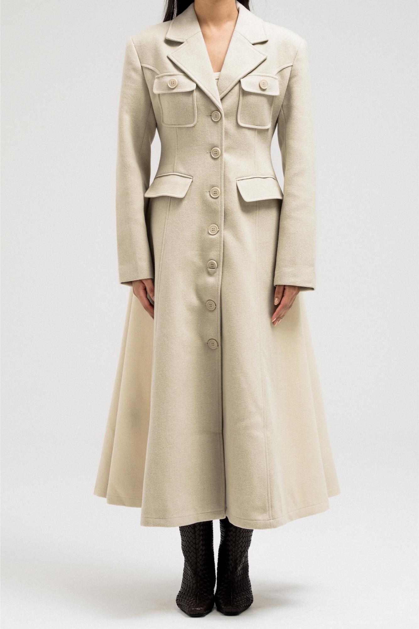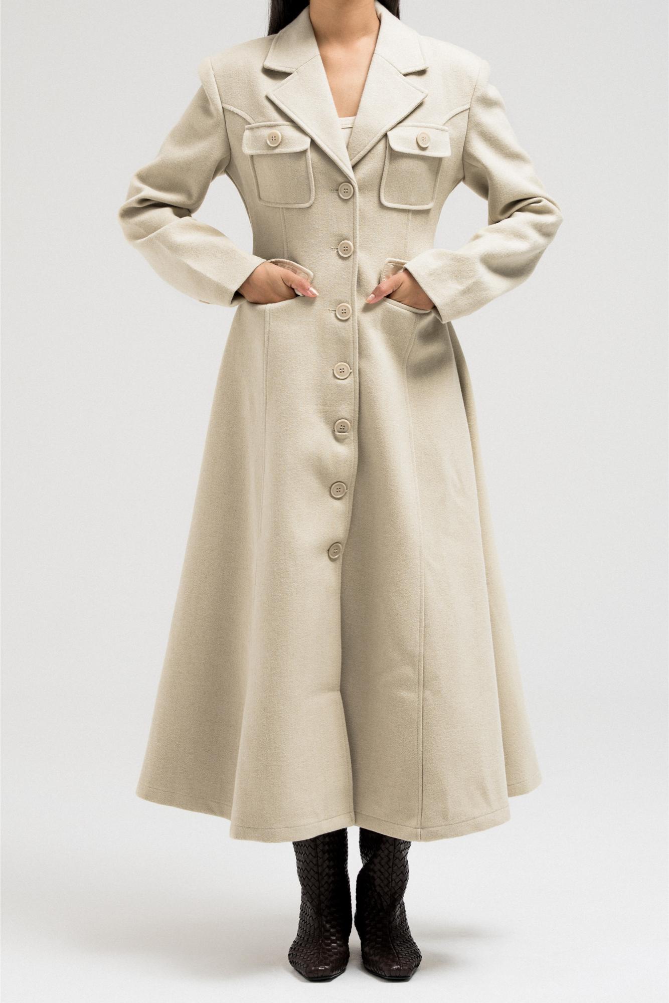 Elegant long coat with a fitted waist and flared hemline, creating a refined silhouette. Detailed with front button closure, structured lapel collar, and front flap pockets for a sophisticated finish.