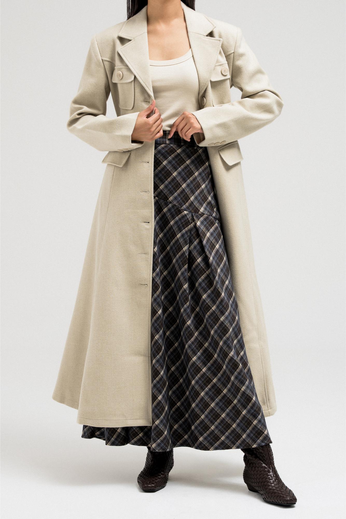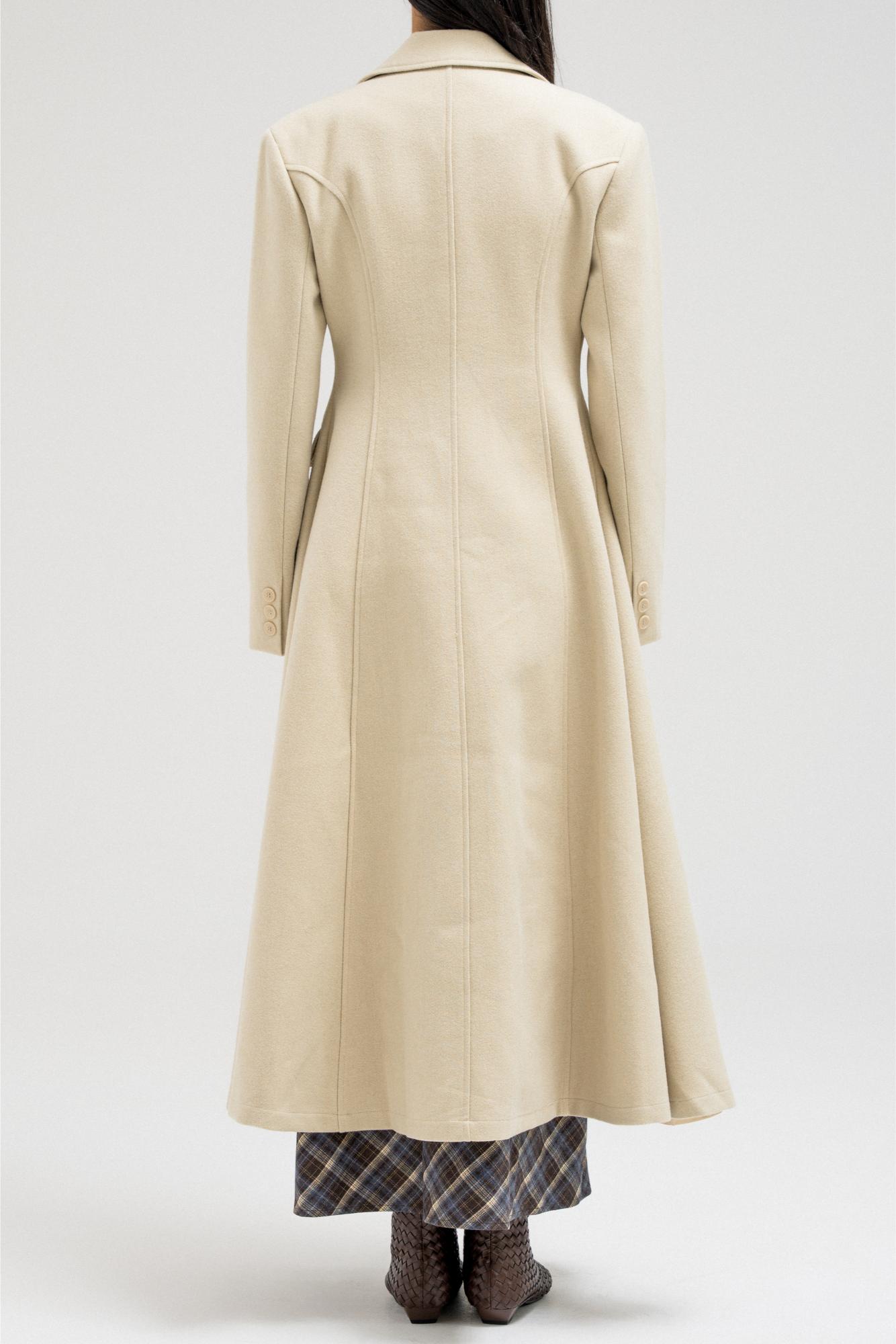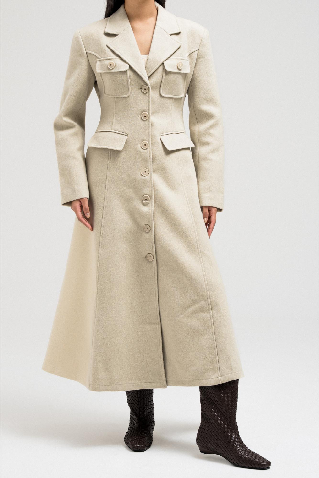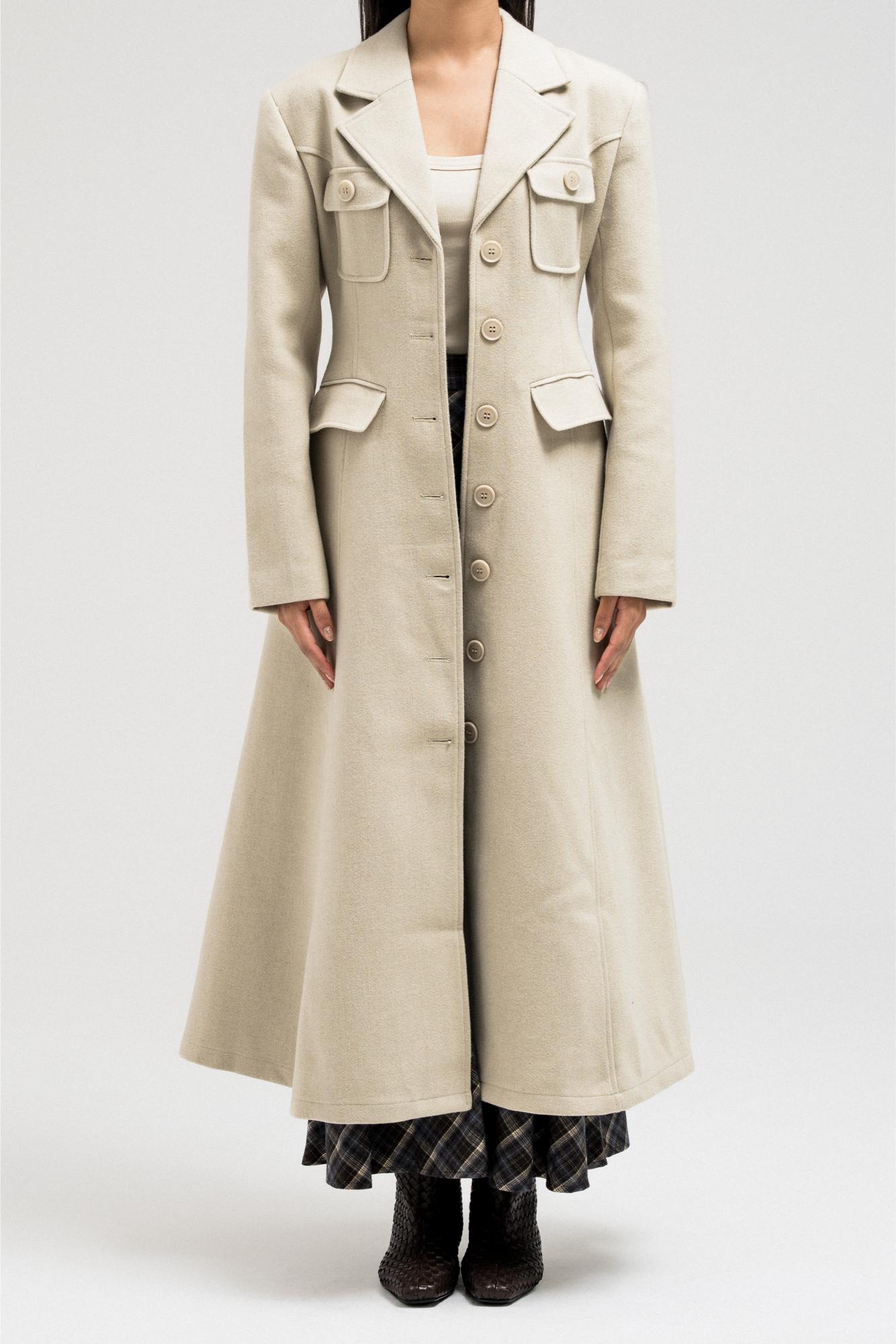 Elegant long coat with a fitted waist and flared hemline, creating a refined silhouette. Detailed with front button closure, structured lapel collar, and front flap pockets for a sophisticated finish.