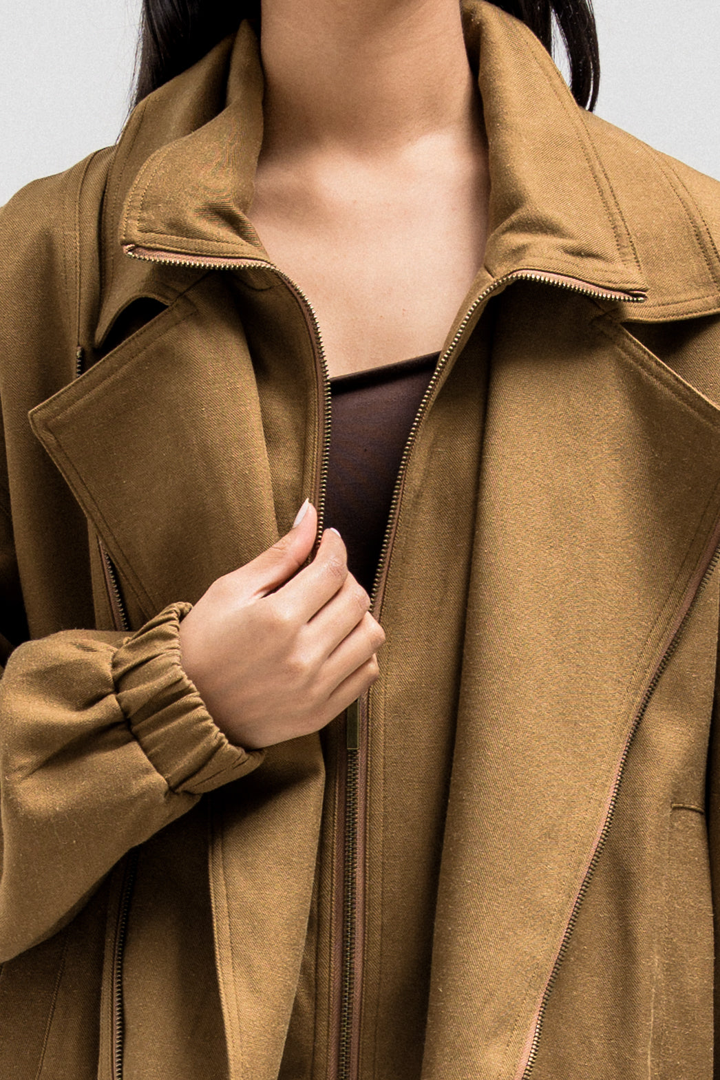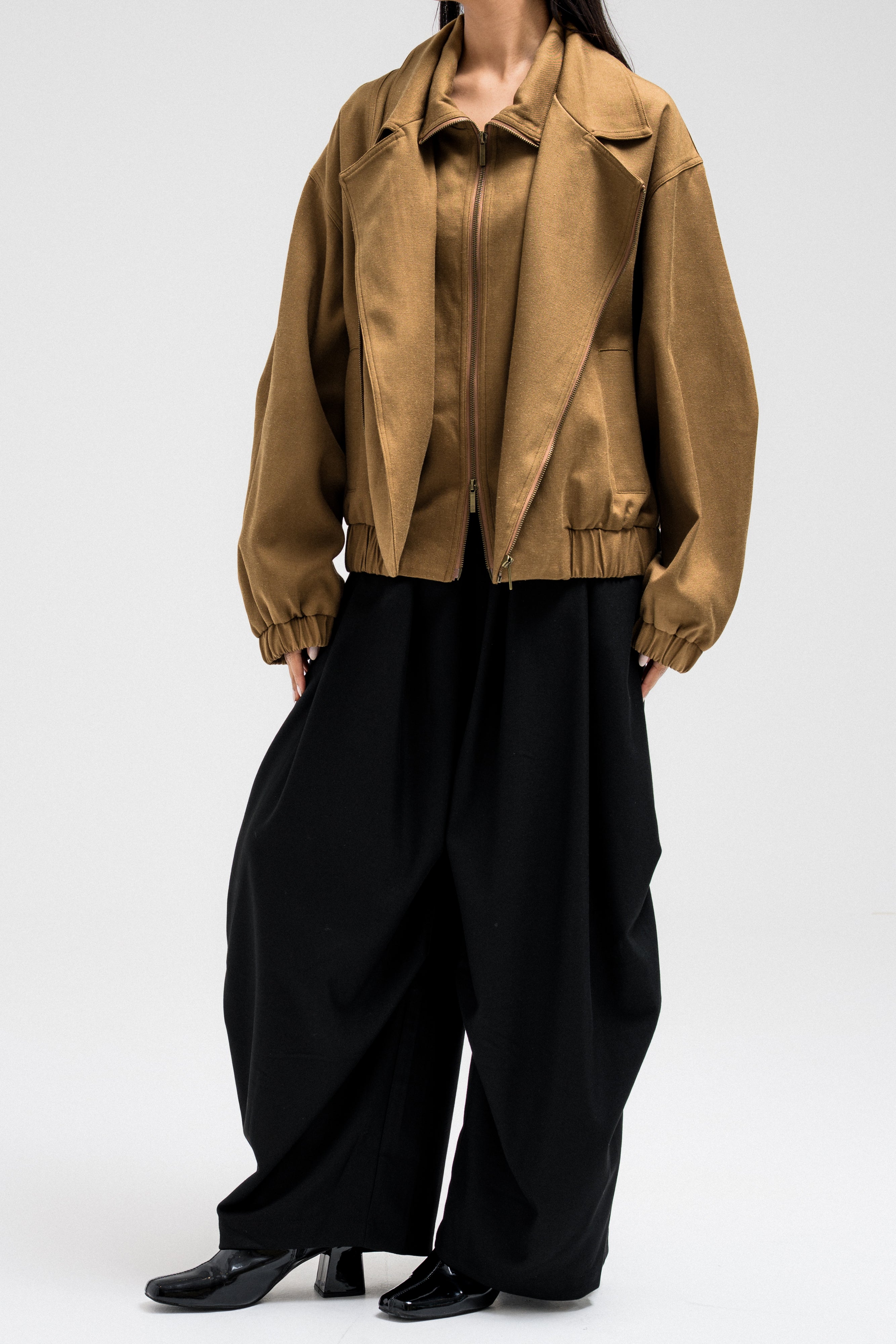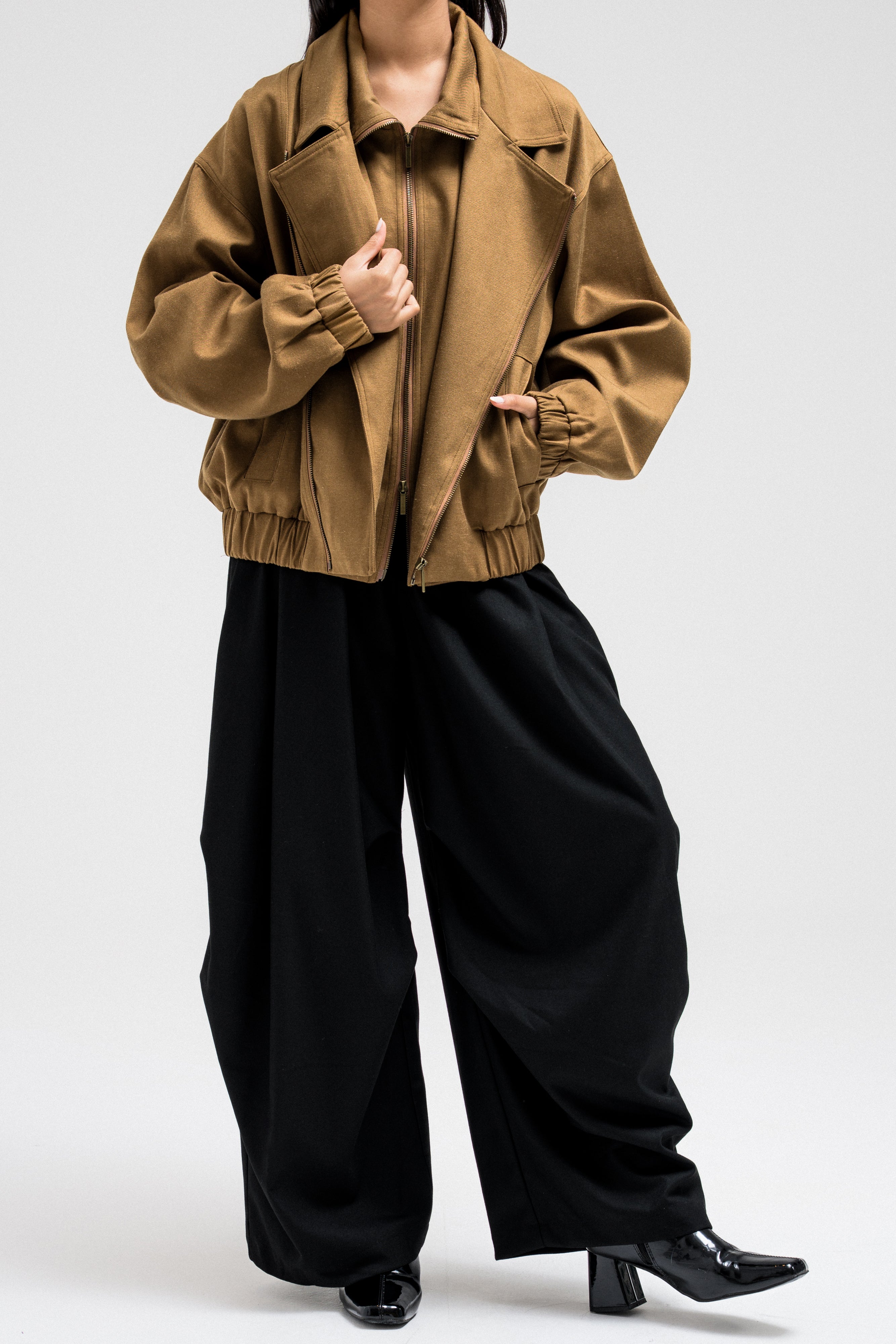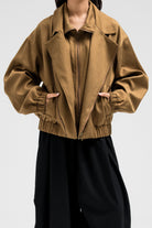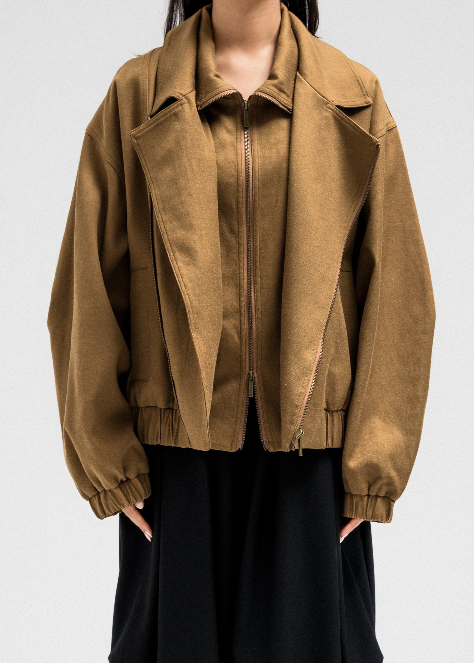 Stylish double-collar jacket featuring a front zipper closure and elastic hem for a structured yet relaxed fit. The design combines a casual silhouette with a polished touch, making it easy to pair with jeans or tailored pants for a refined everyday look.