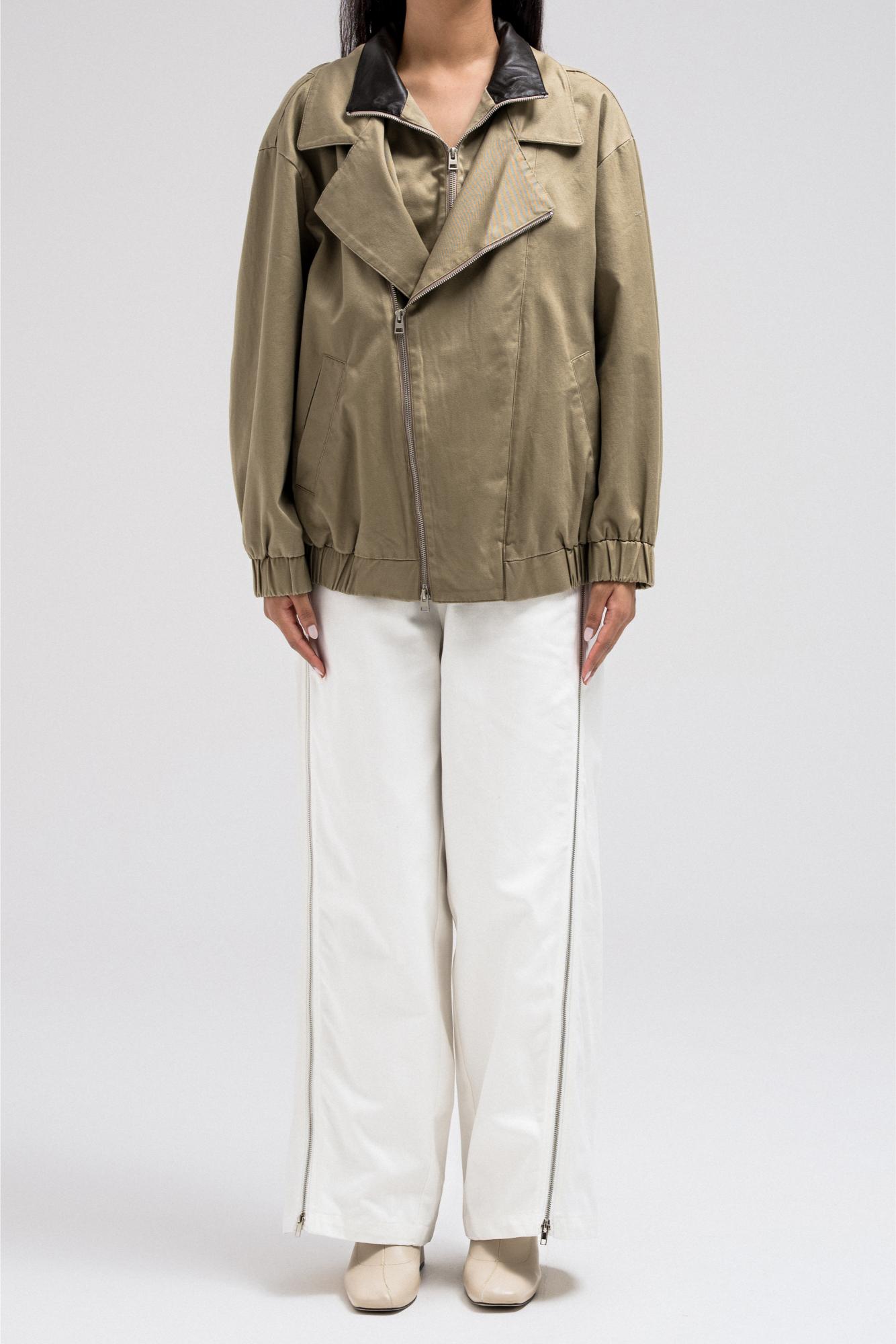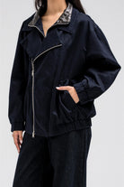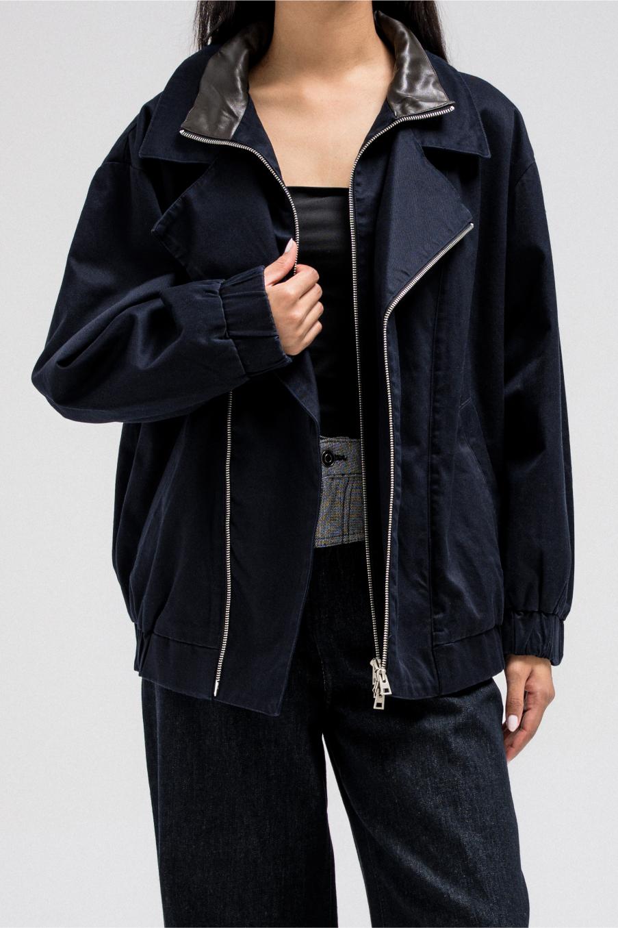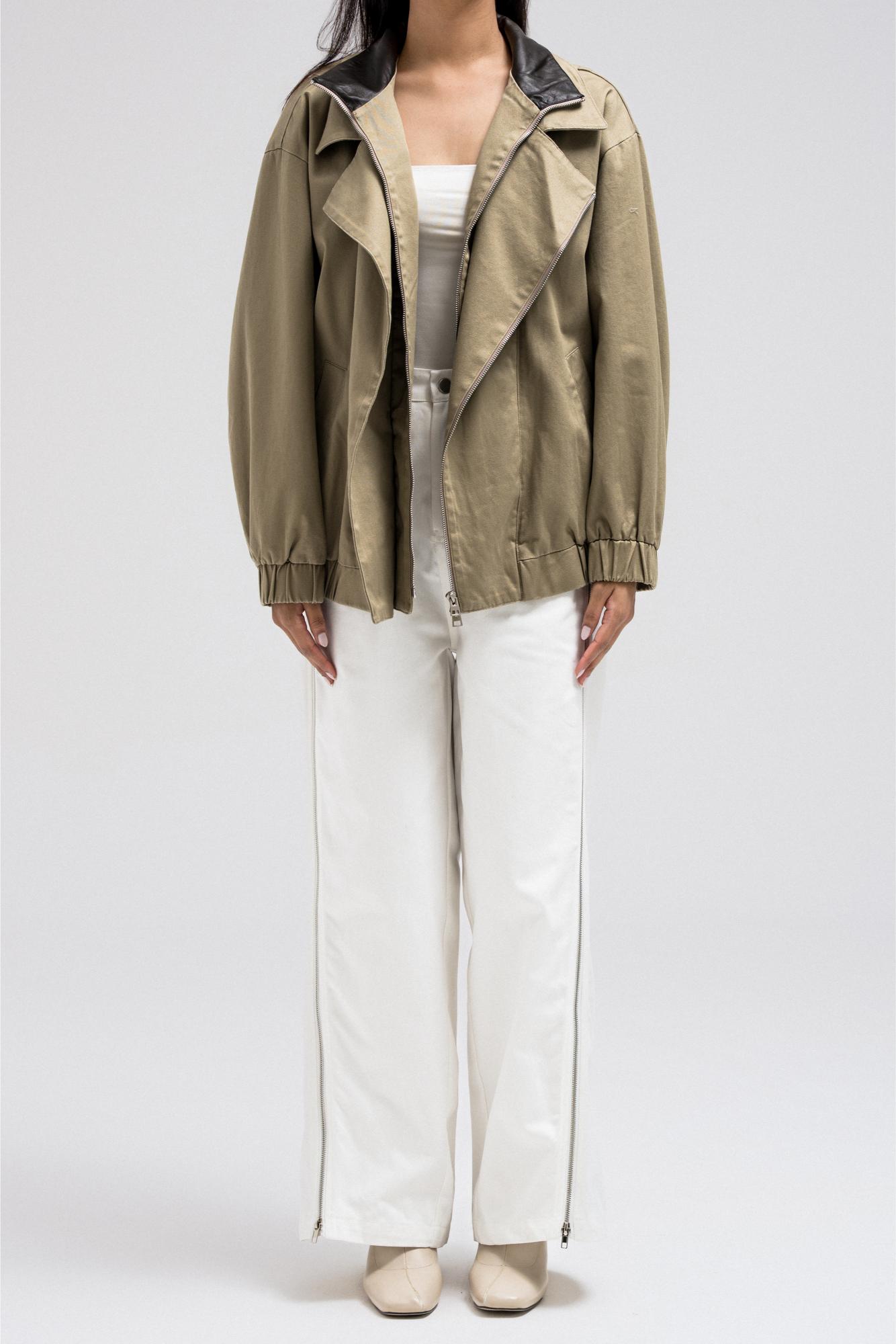 This jacket features a unique double-jacket design with a relaxed, modern fit. The outer layer includes an asymmetric flap collar that overlaps with an inner high neckline, creating a layered effect. It has a front zipper closure, elastic cuffs and hem for structure, and practical side pockets. The combination of details gives it a casual yet refined utility-inspired look.