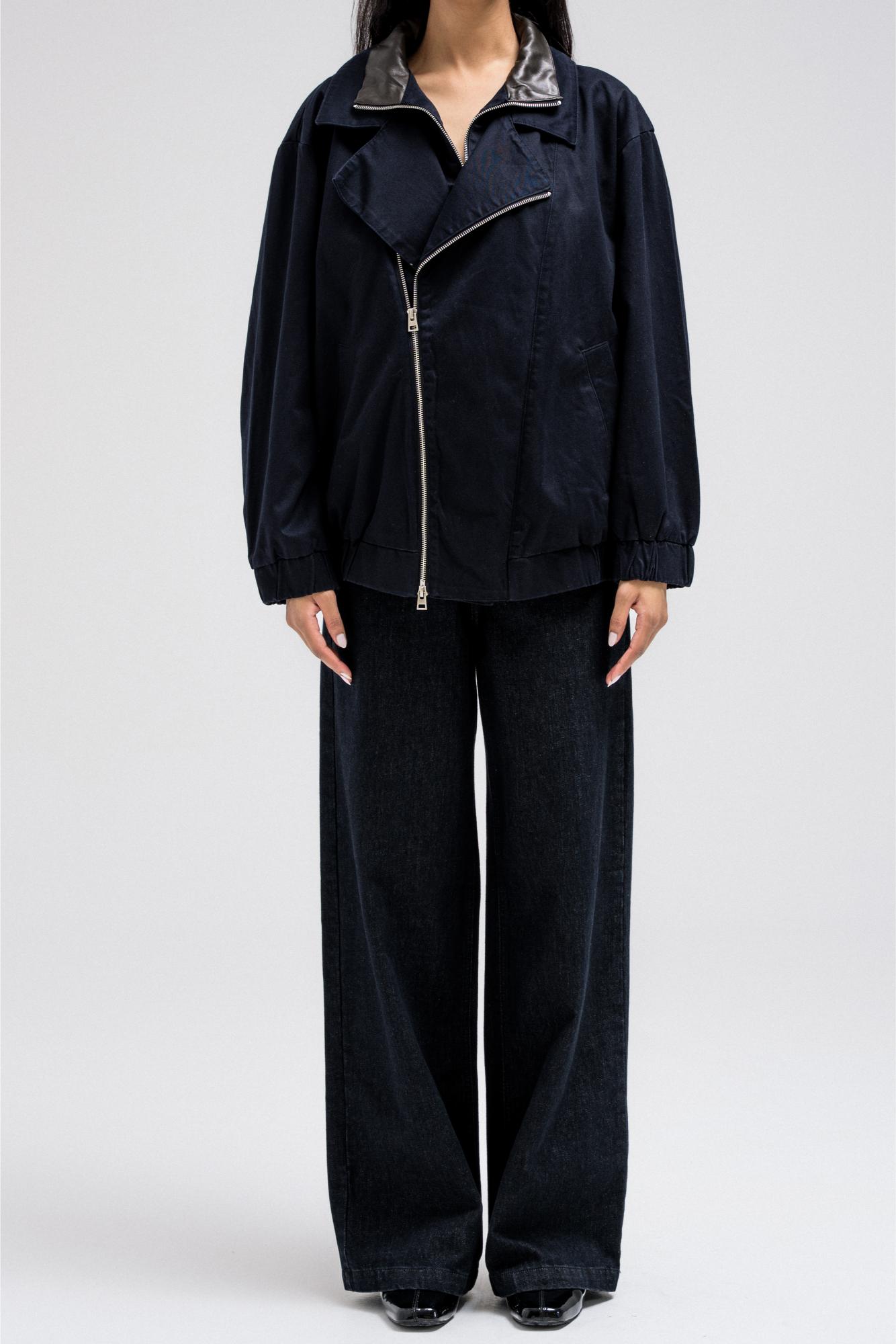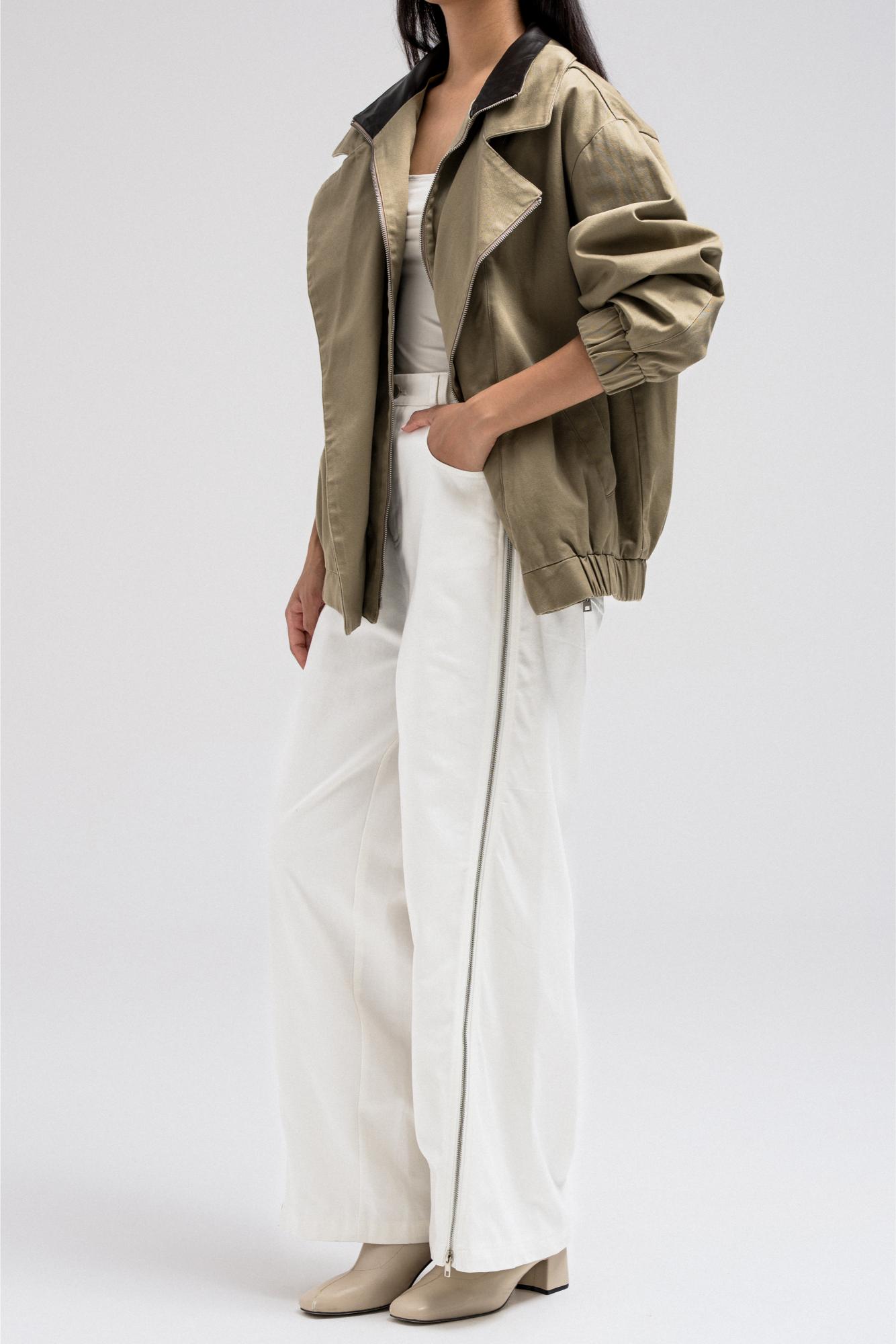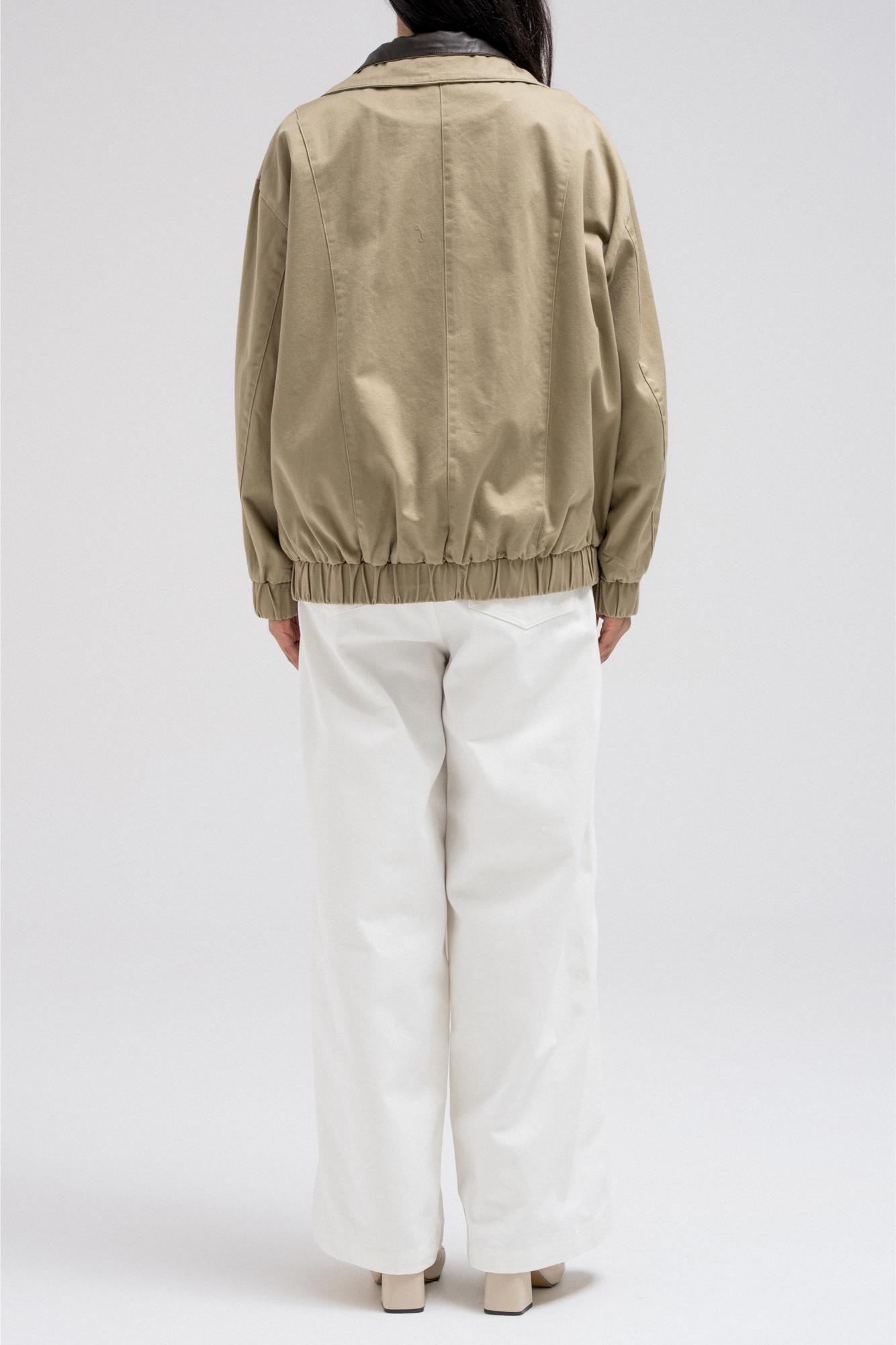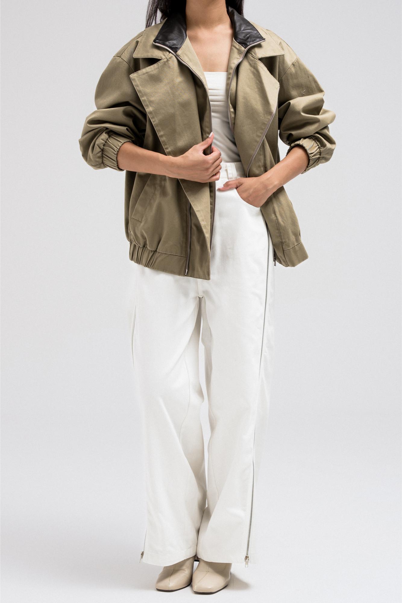 This jacket features a unique double-jacket design with a relaxed, modern fit. The outer layer includes an asymmetric flap collar that overlaps with an inner high neckline, creating a layered effect. It has a front zipper closure, elastic cuffs and hem for structure, and practical side pockets. The combination of details gives it a casual yet refined utility-inspired look.