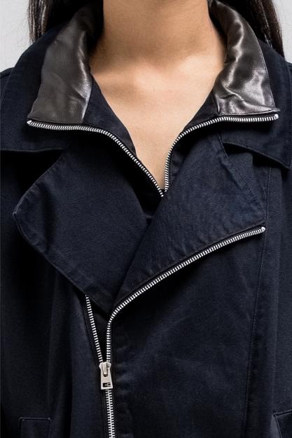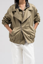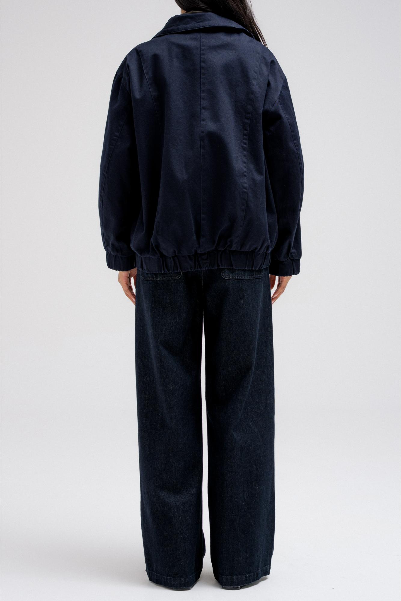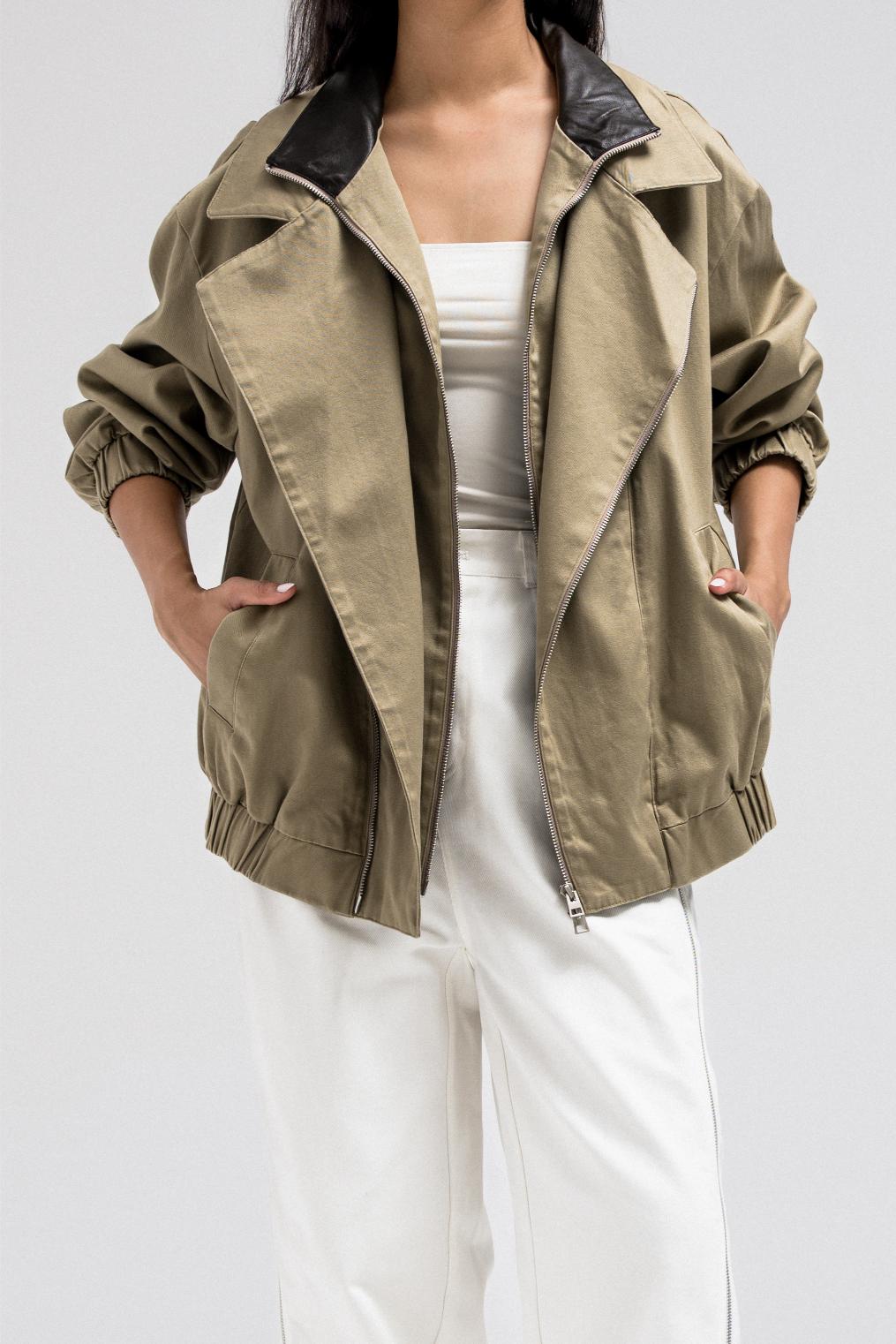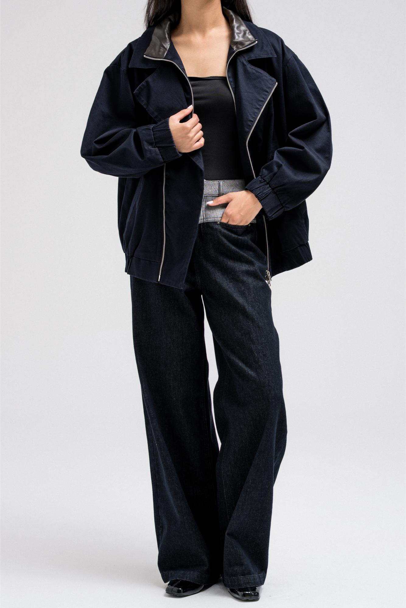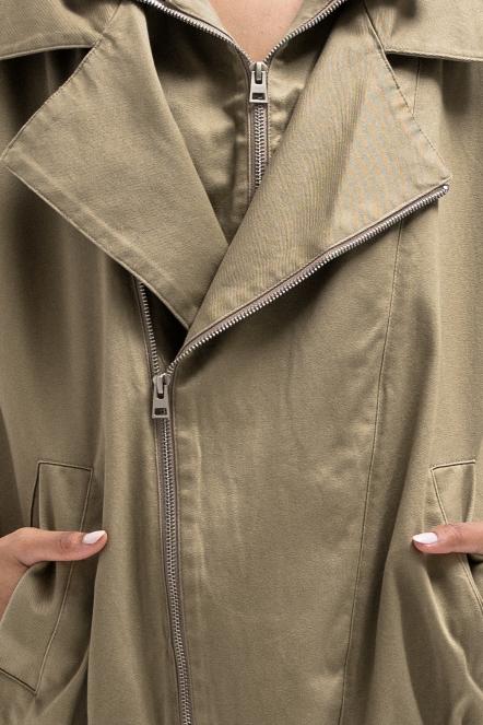 This jacket features a unique double-jacket design with a relaxed, modern fit. The outer layer includes an asymmetric flap collar that overlaps with an inner high neckline, creating a layered effect. It has a front zipper closure, elastic cuffs and hem for structure, and practical side pockets. The combination of details gives it a casual yet refined utility-inspired look.