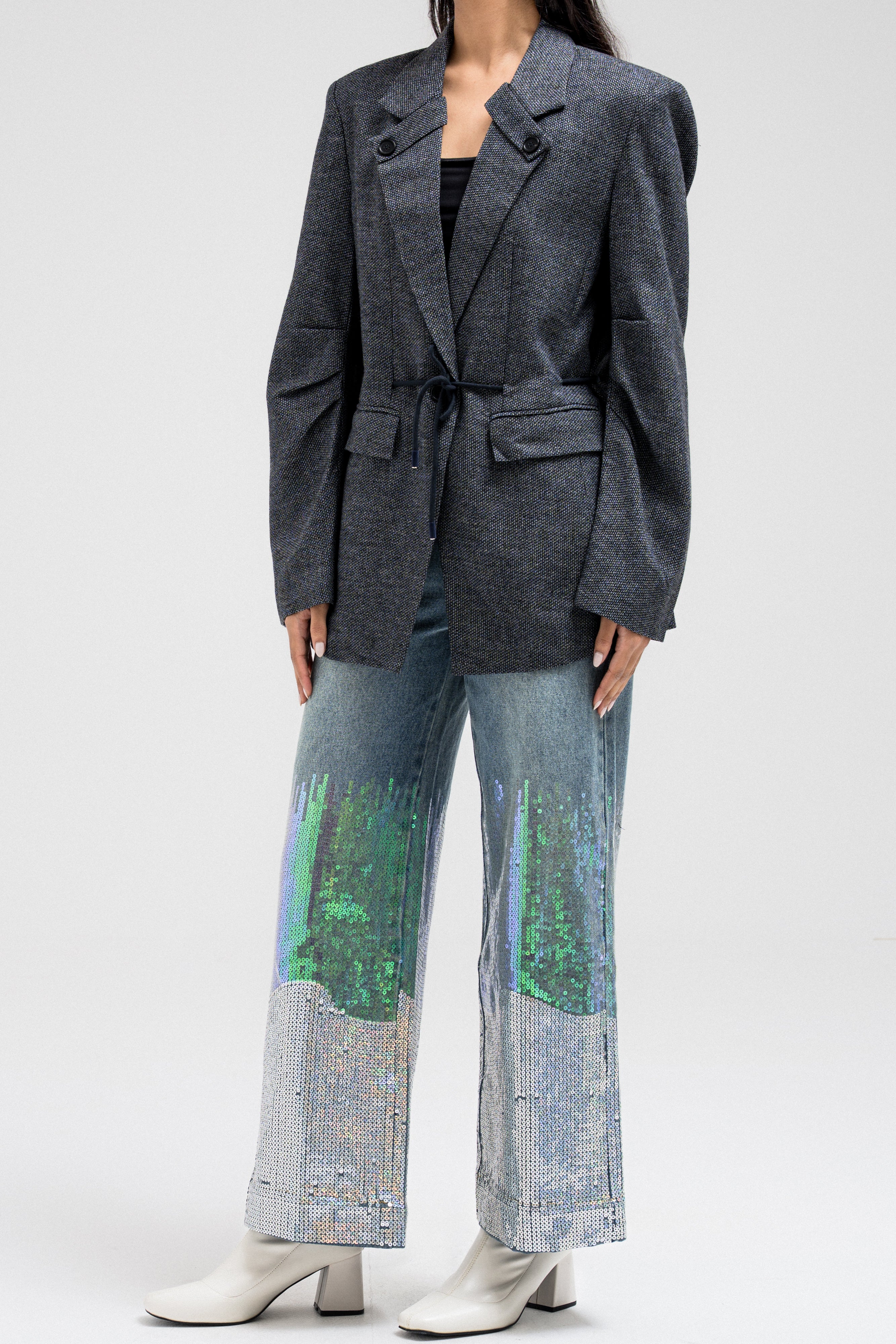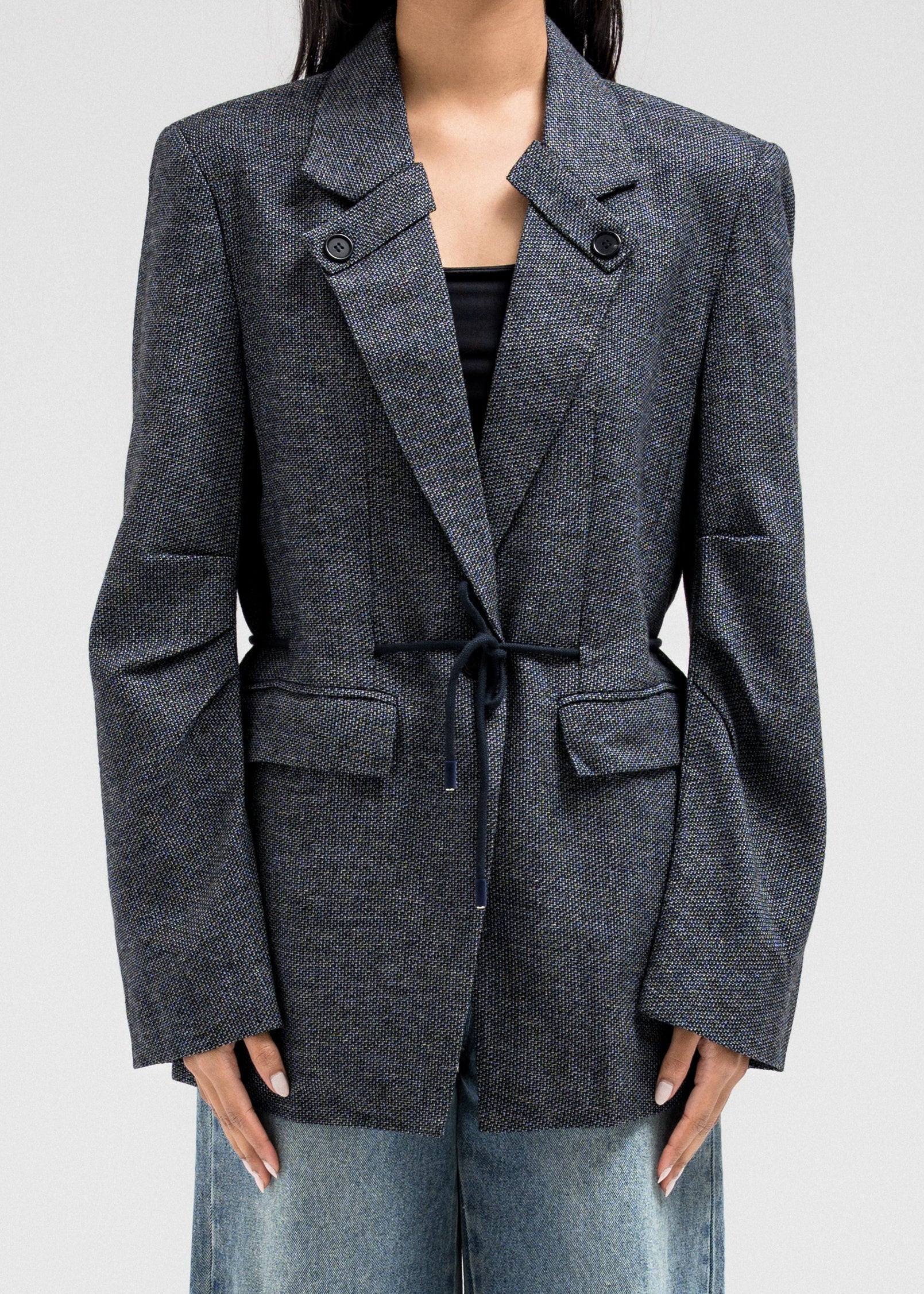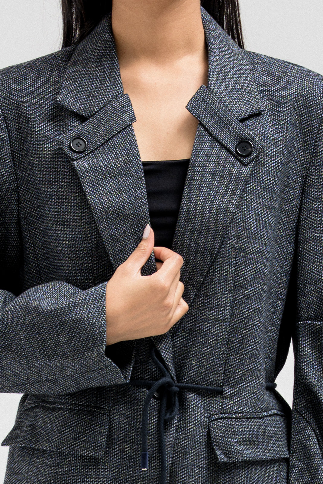 Tailored textured blazer featuring an adjustable string belt for a defined silhouette. Designed with structured shoulders, front flap pockets, and a single-button closure.