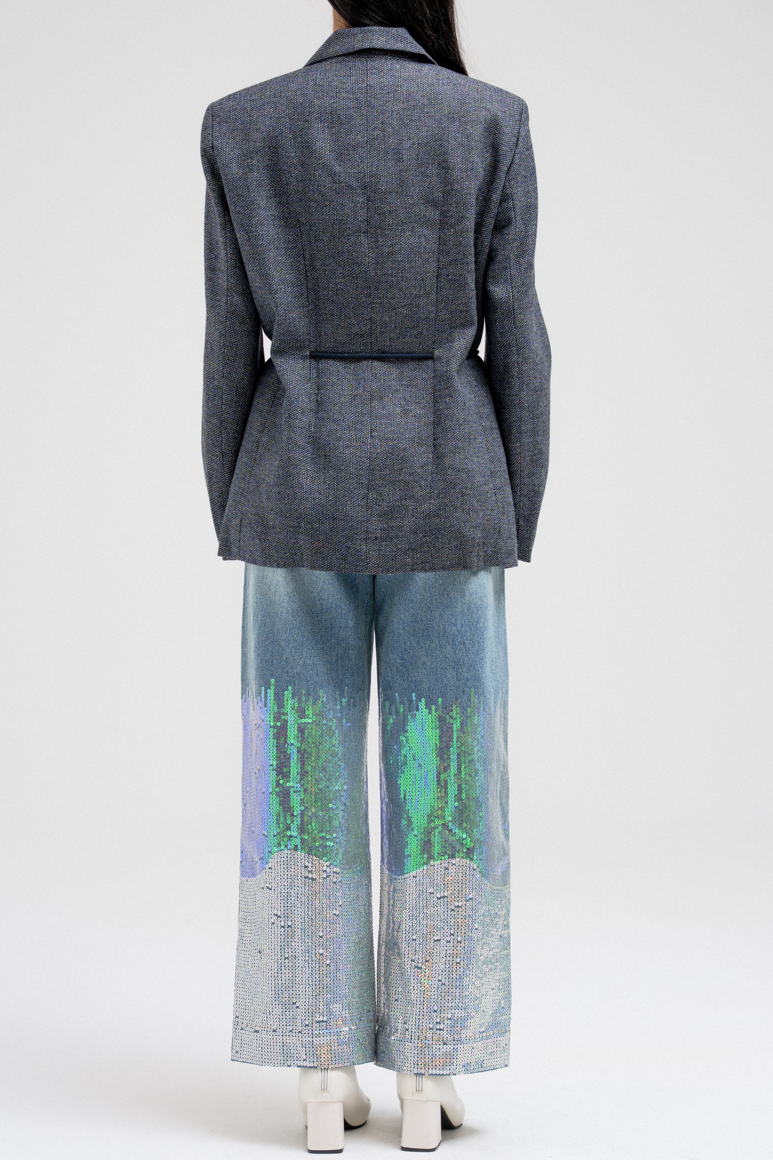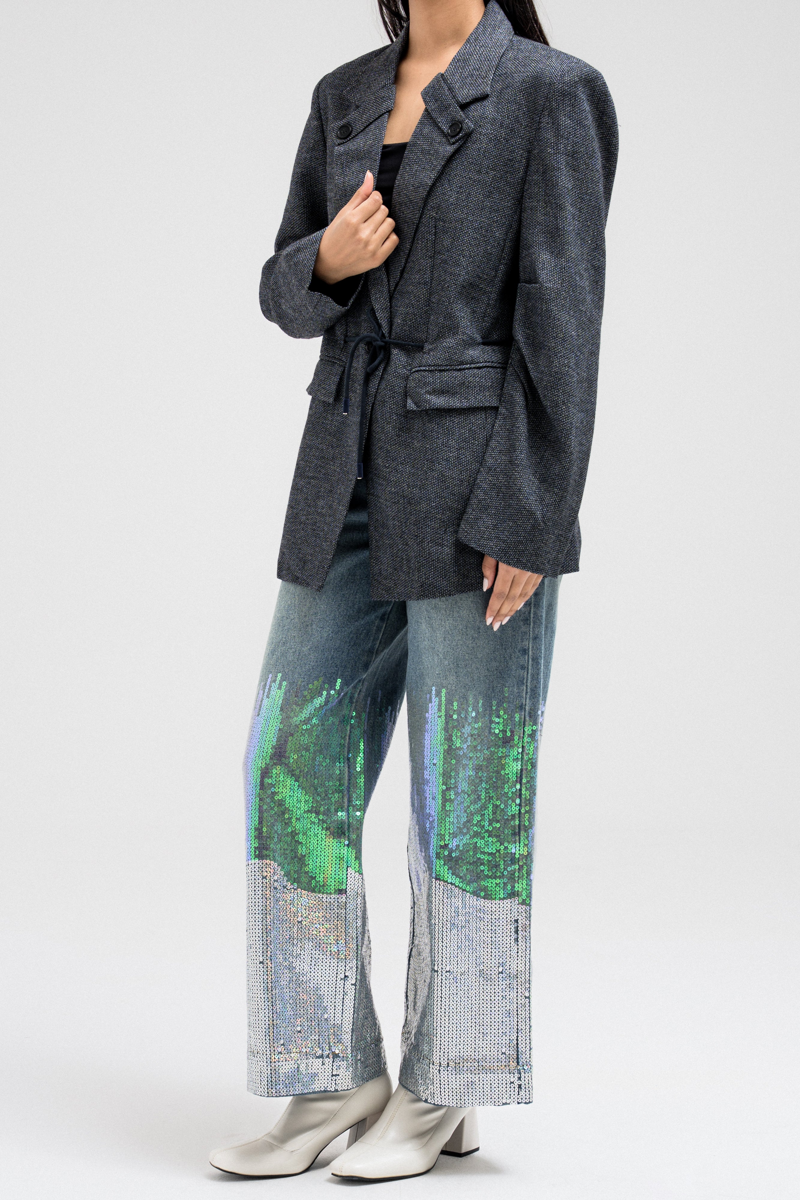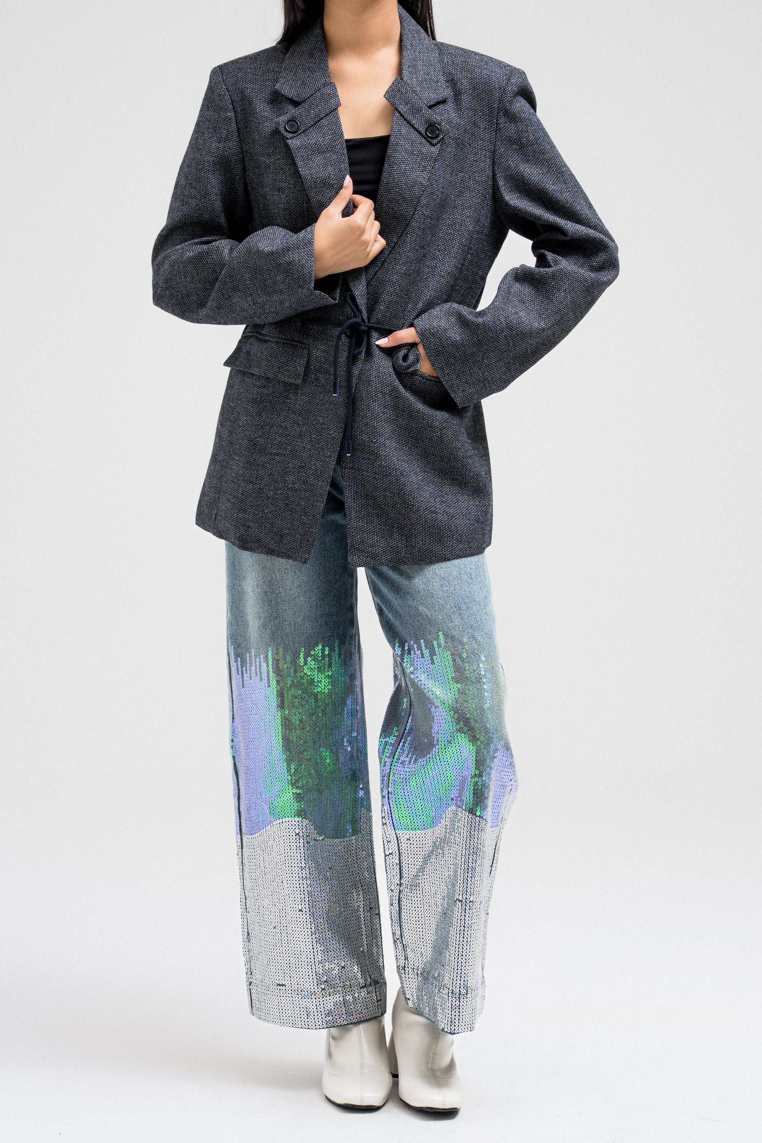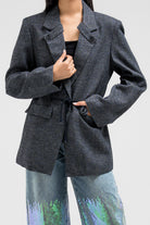 Tailored textured blazer featuring an adjustable string belt for a defined silhouette. Designed with structured shoulders, front flap pockets, and a single-button closure.