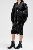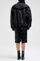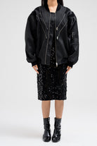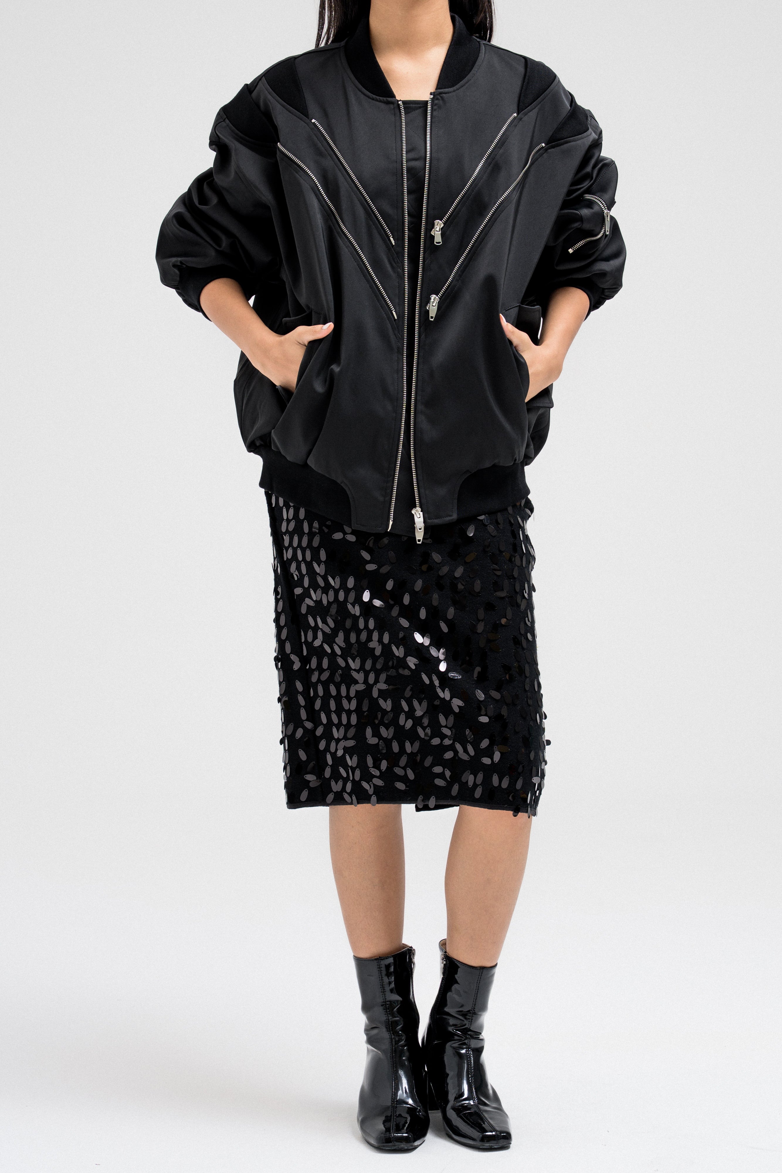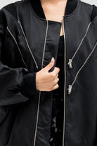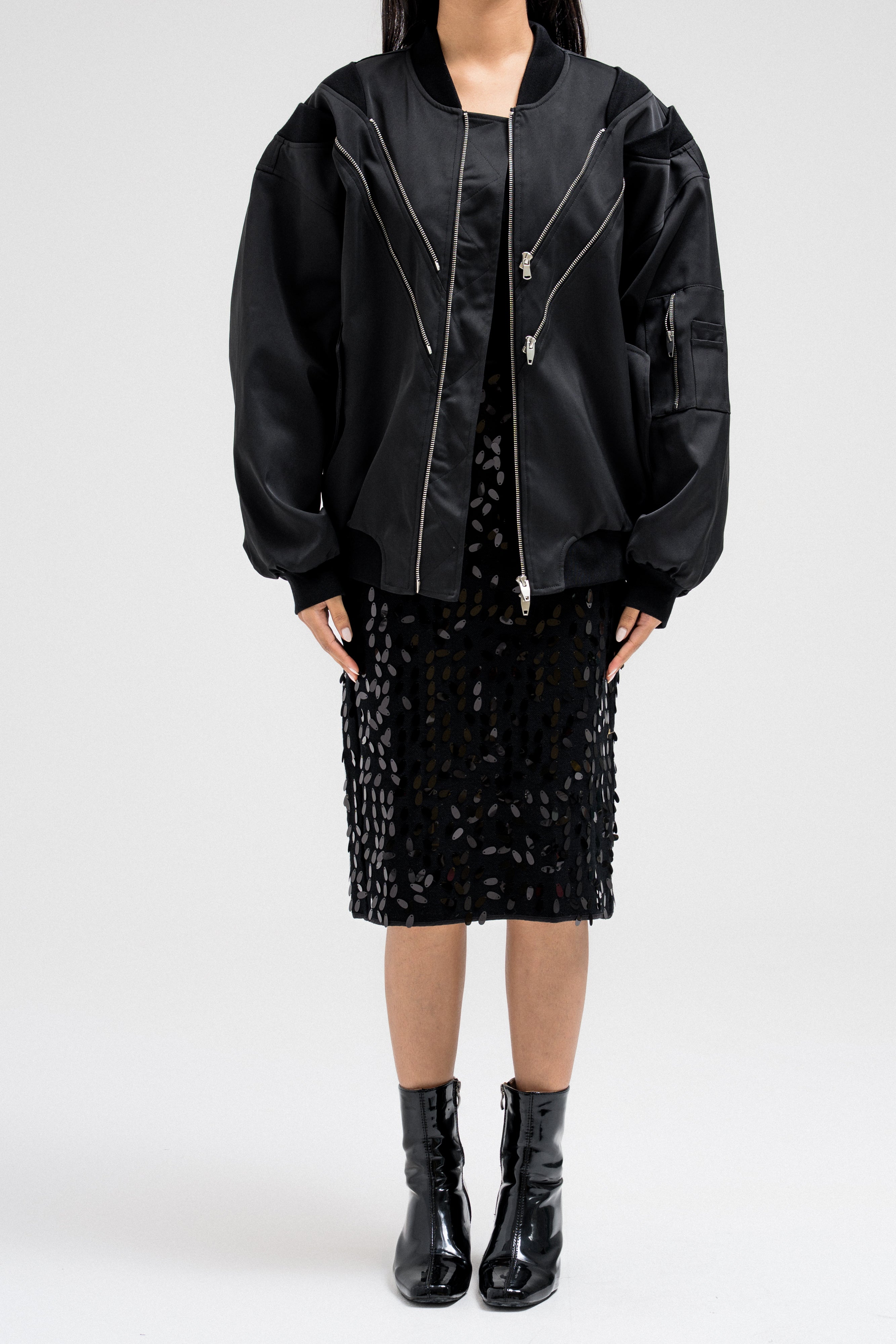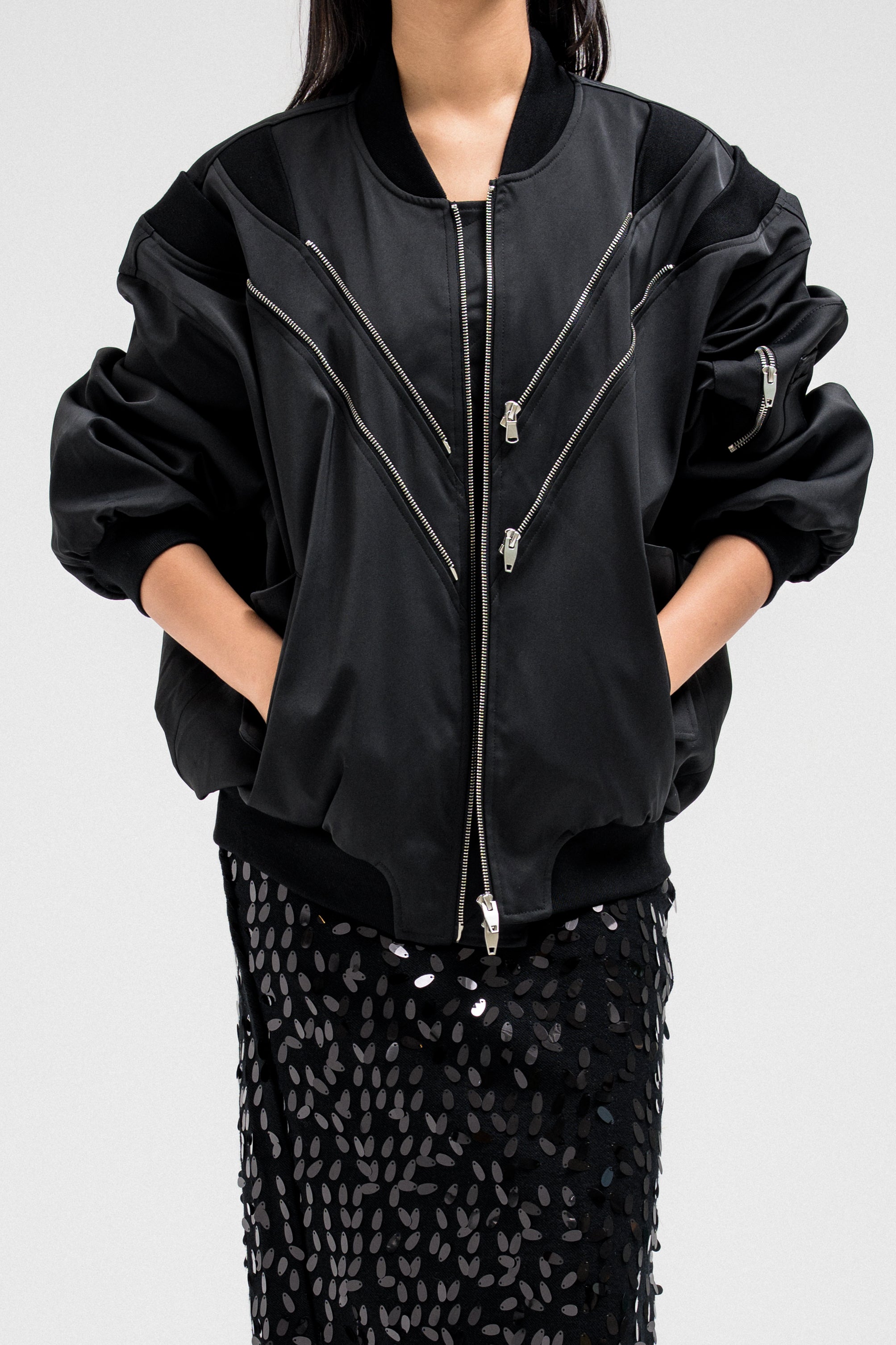 Bomber-style jacket featuring multiple front zipper accents that add a bold, edgy touch. Designed with a structured silhouette, elastic hem, and sleeve zipper details for a utilitarian flair. Finished with side flap pockets for added function and style.