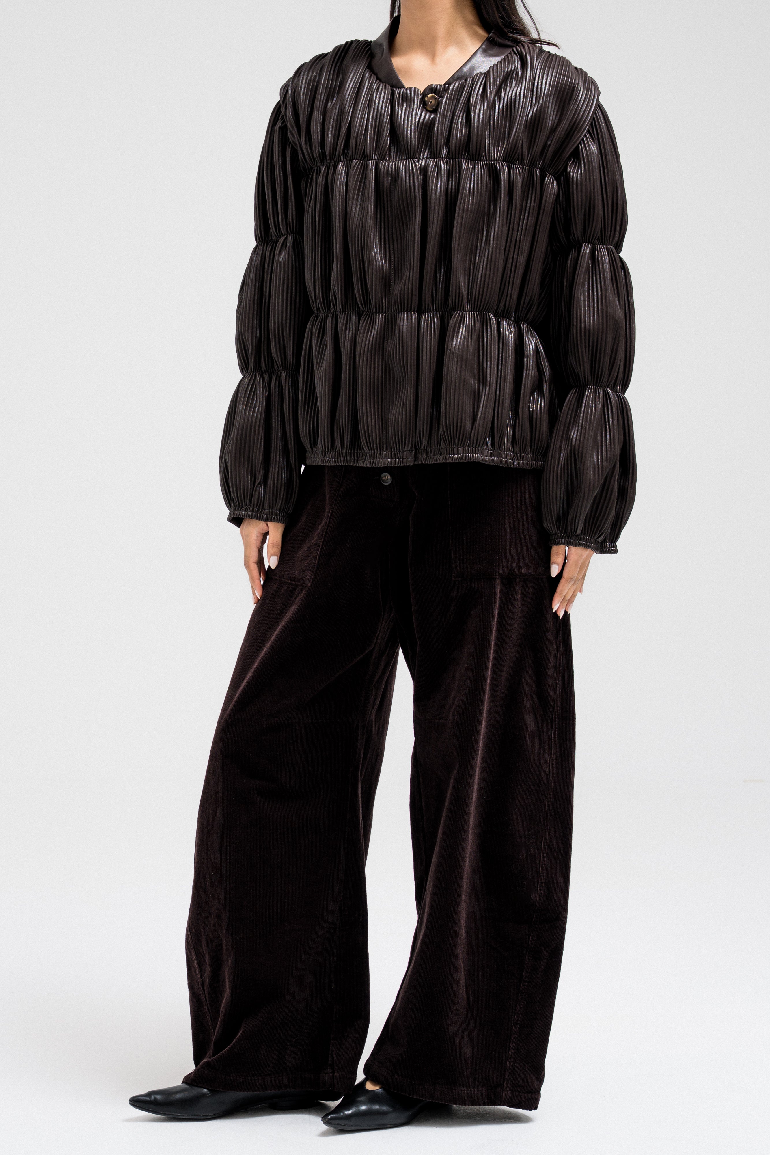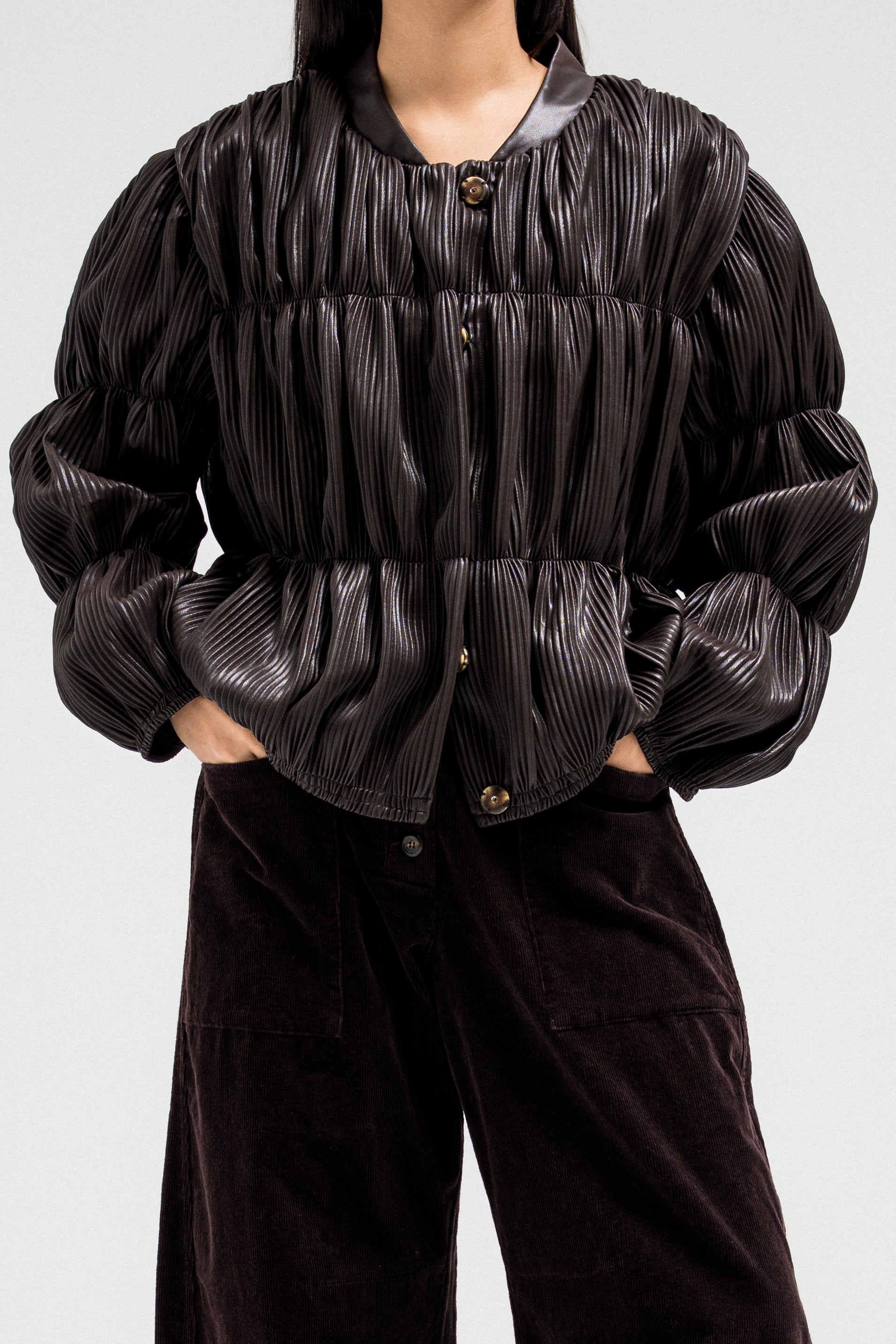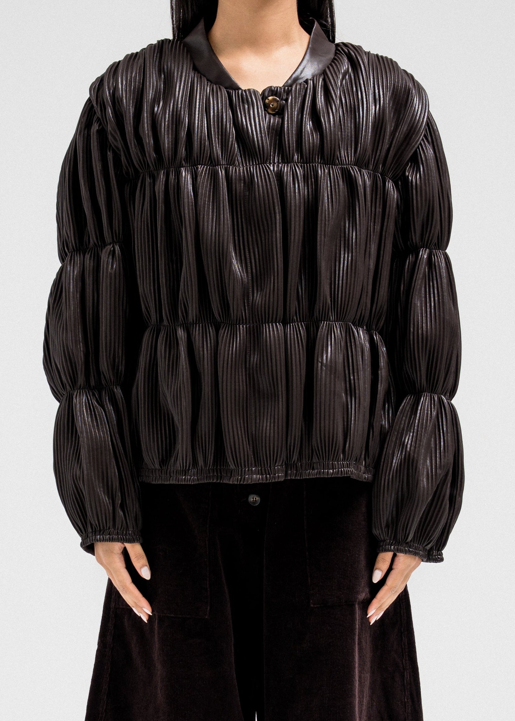 Crafted from soft leather material, this jacket brings a modern twist to the classic bomber silhouette. Designed with a voluminous, paneled texture that adds depth and structure, it features long sleeves, a rounded neckline, and a front button closure. The combination of puffed detailing and smooth leather gives it a bold yet refined appeal.