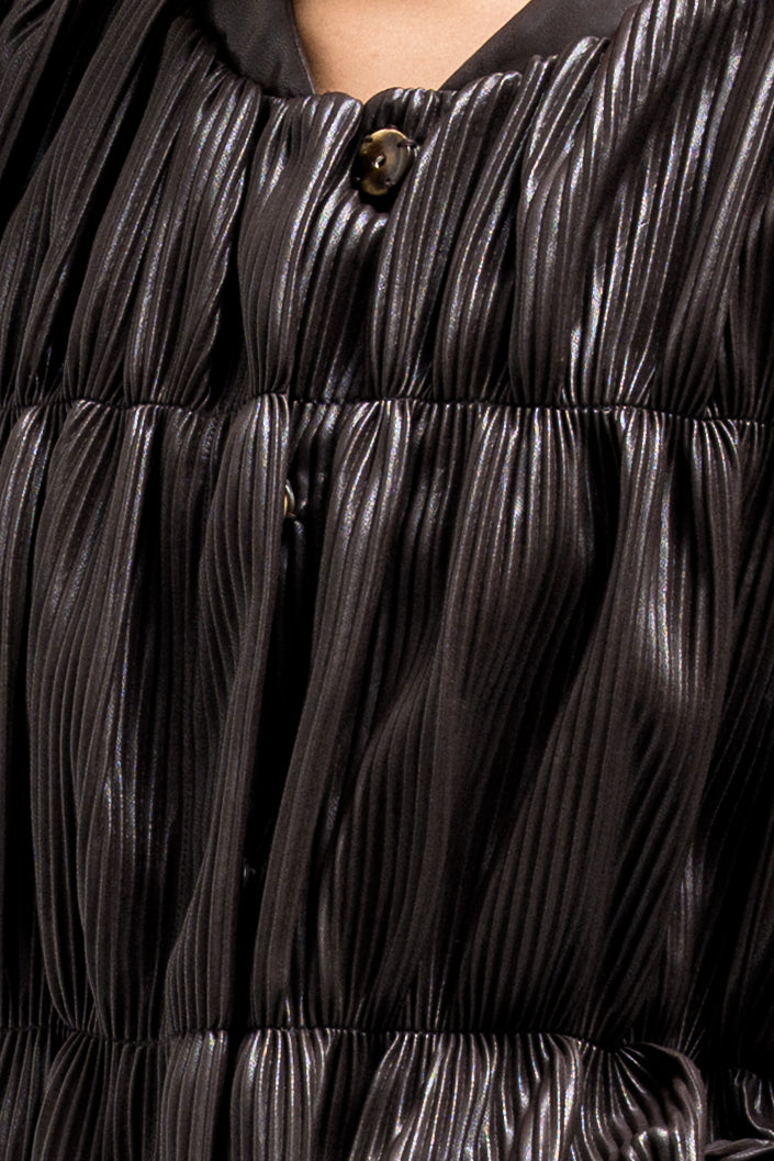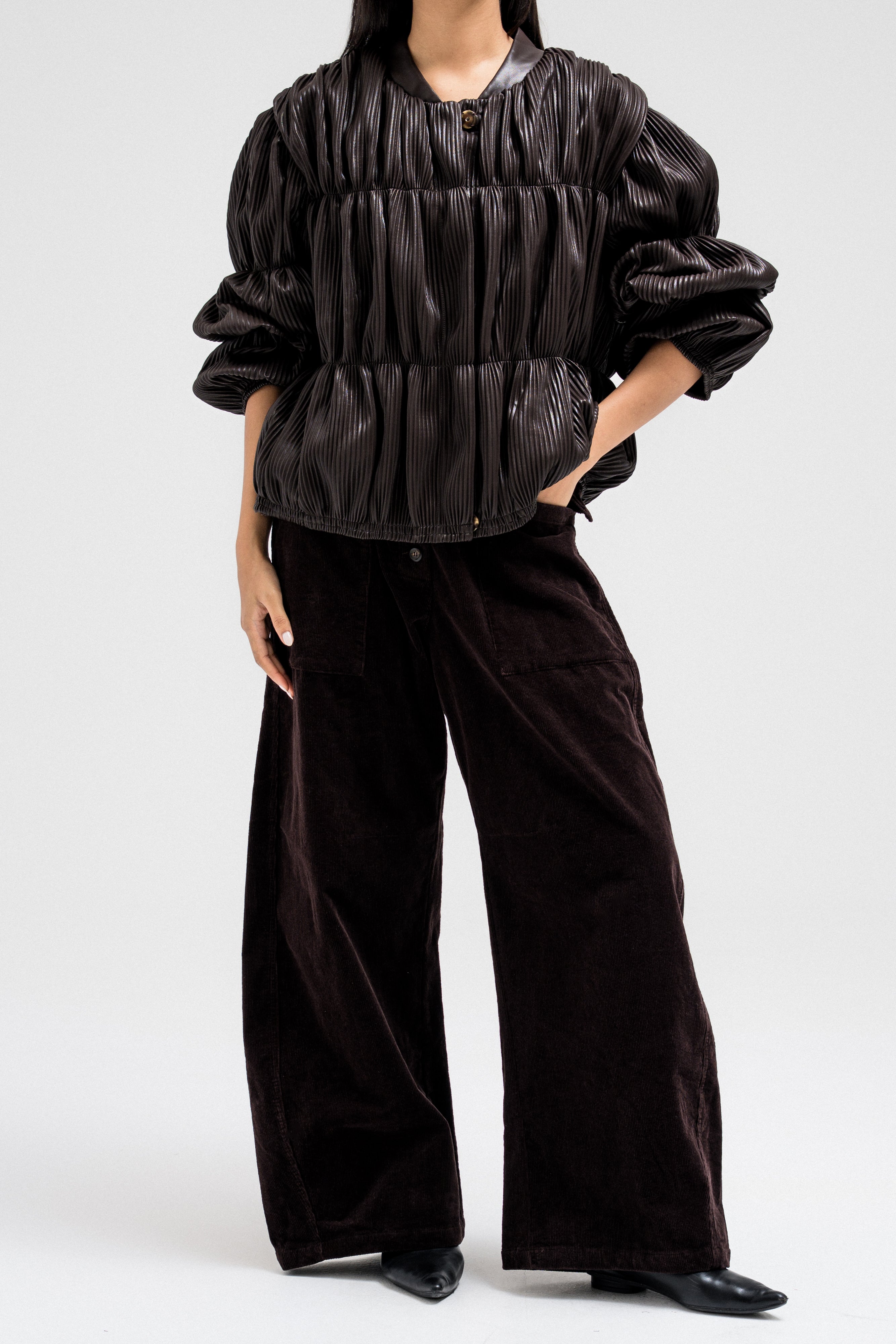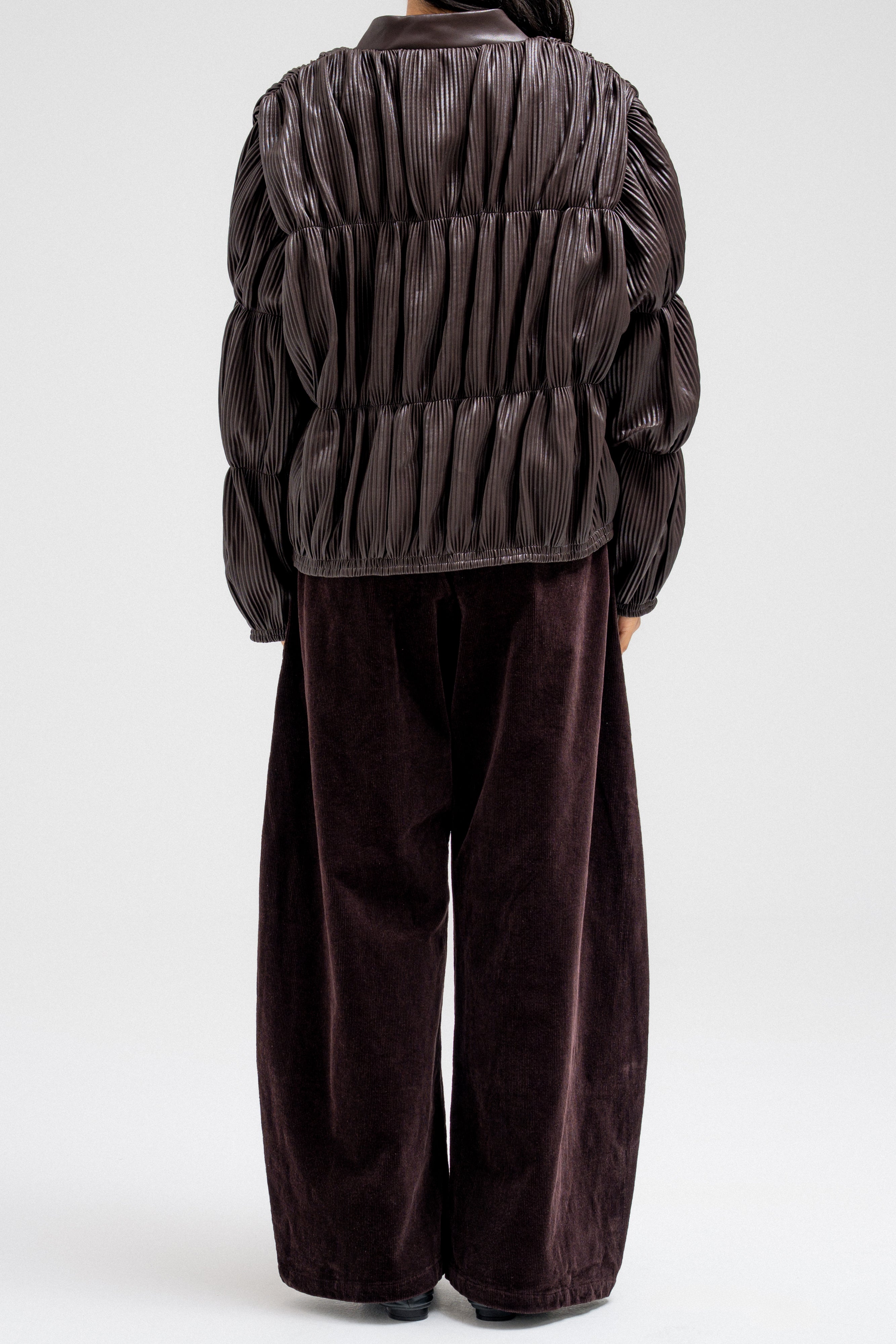Crafted from soft leather material, this jacket brings a modern twist to the classic bomber silhouette. Designed with a voluminous, paneled texture that adds depth and structure, it features long sleeves, a rounded neckline, and a front button closure. The combination of puffed detailing and smooth leather gives it a bold yet refined appeal.