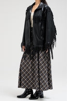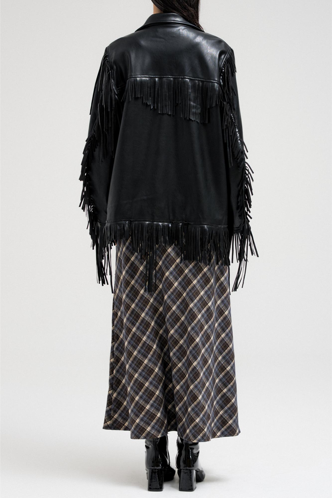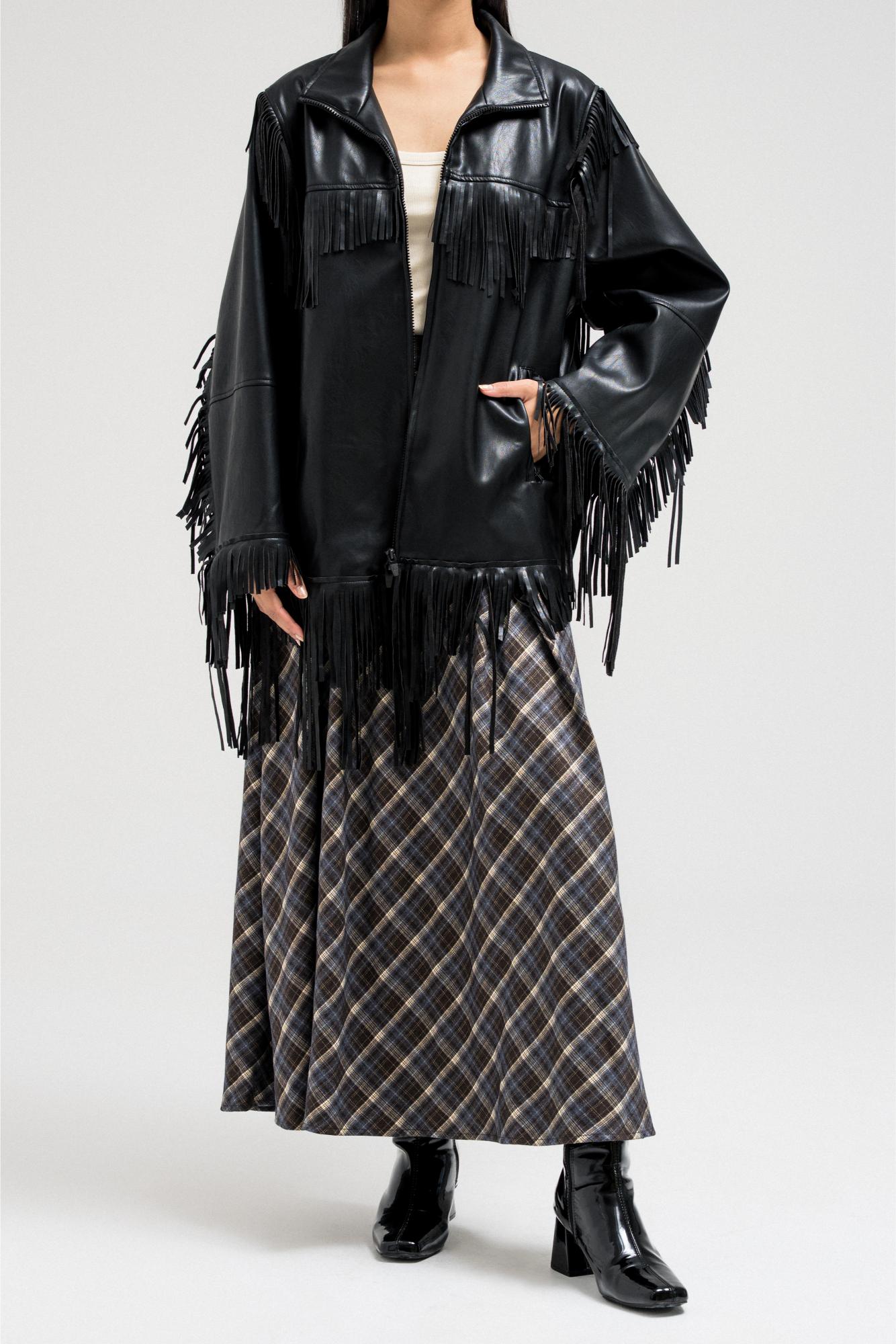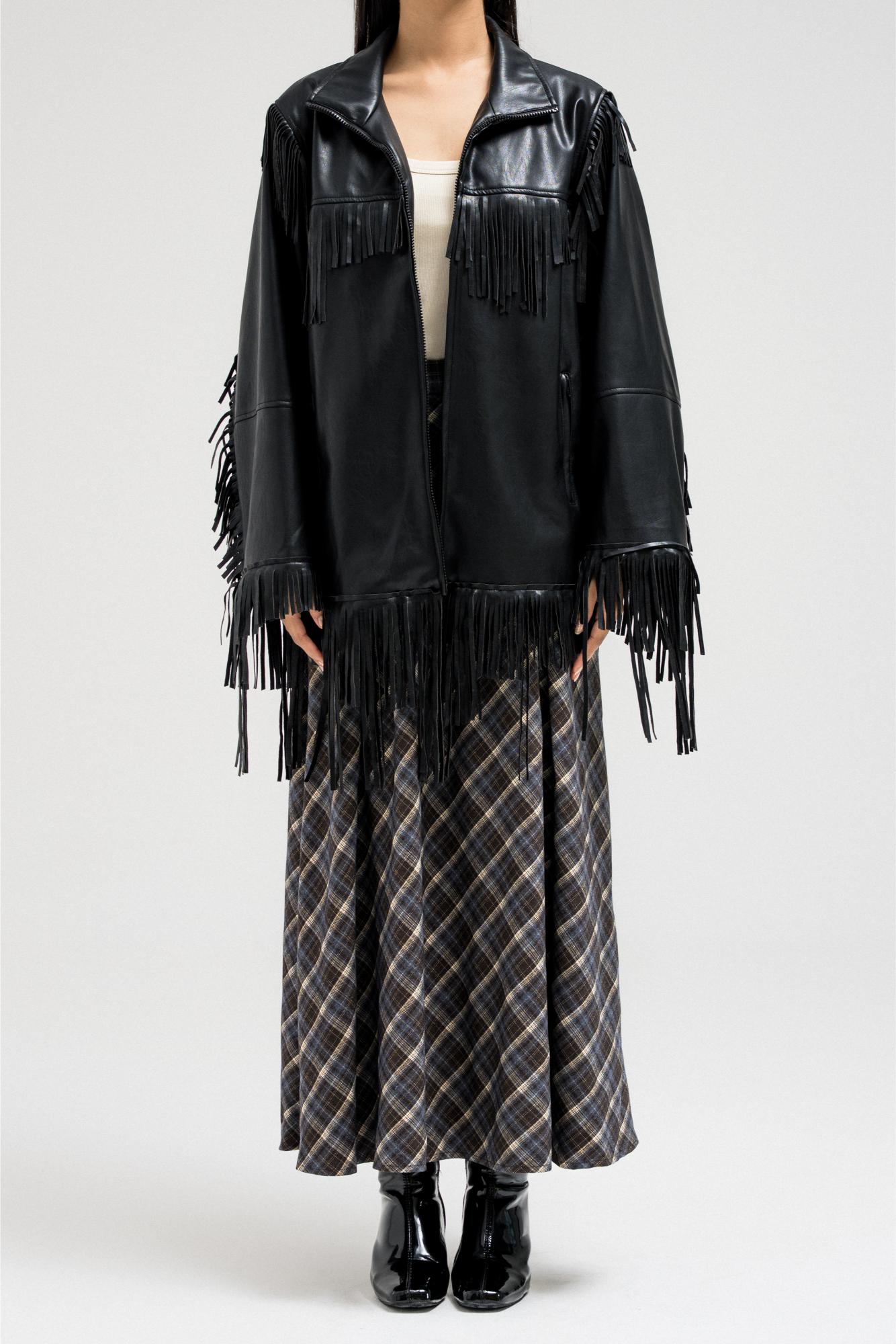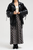 Crafted from smooth leather, this statement jacket features fringe detailing throughout along the front, back, cuffs, and hem adding bold movement and a touch of western flair. It has a sleek zipper front closure and a short stand collar that enhances its structured, edgy design. A perfect piece to elevate both casual and chic looks.