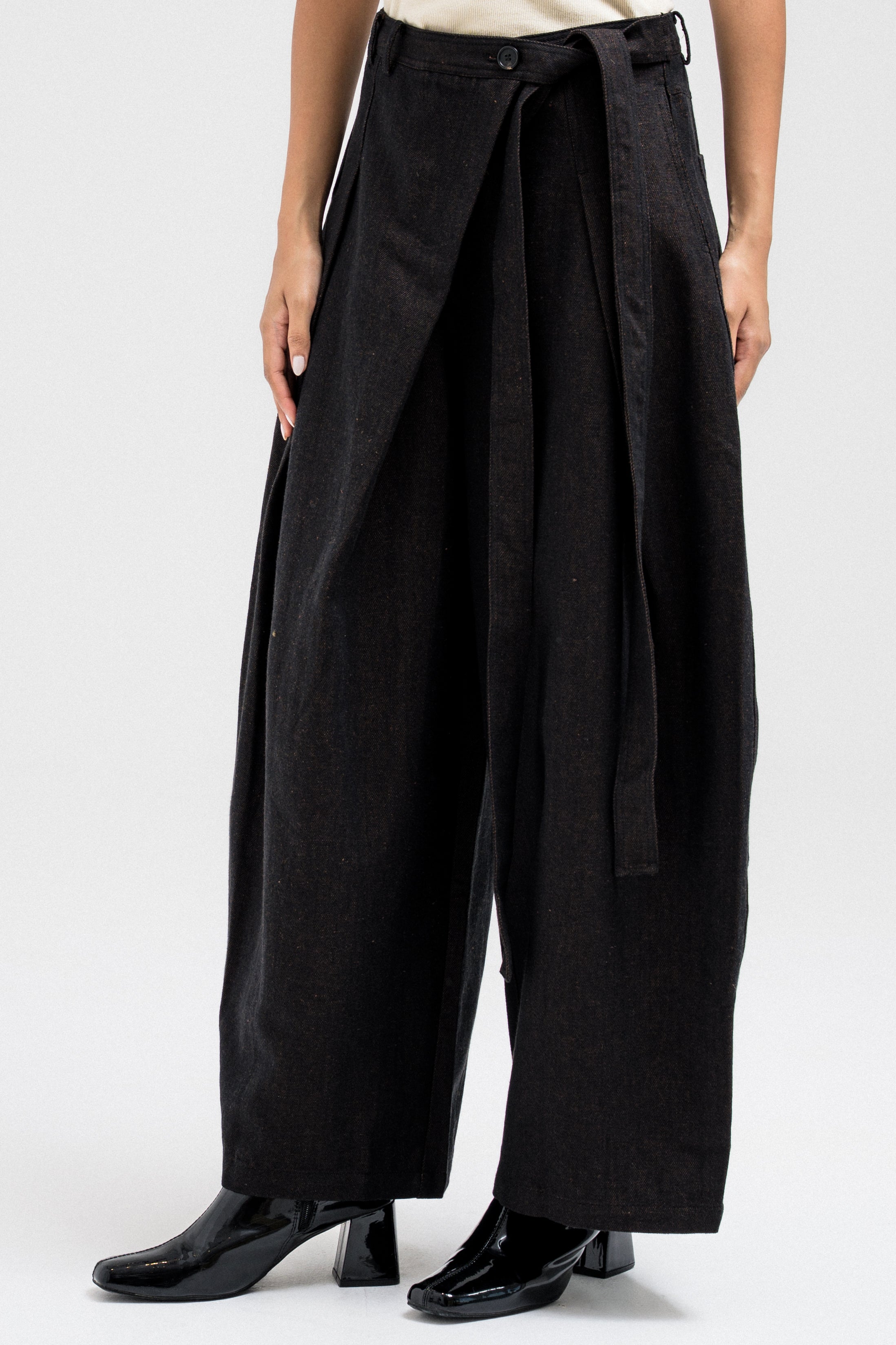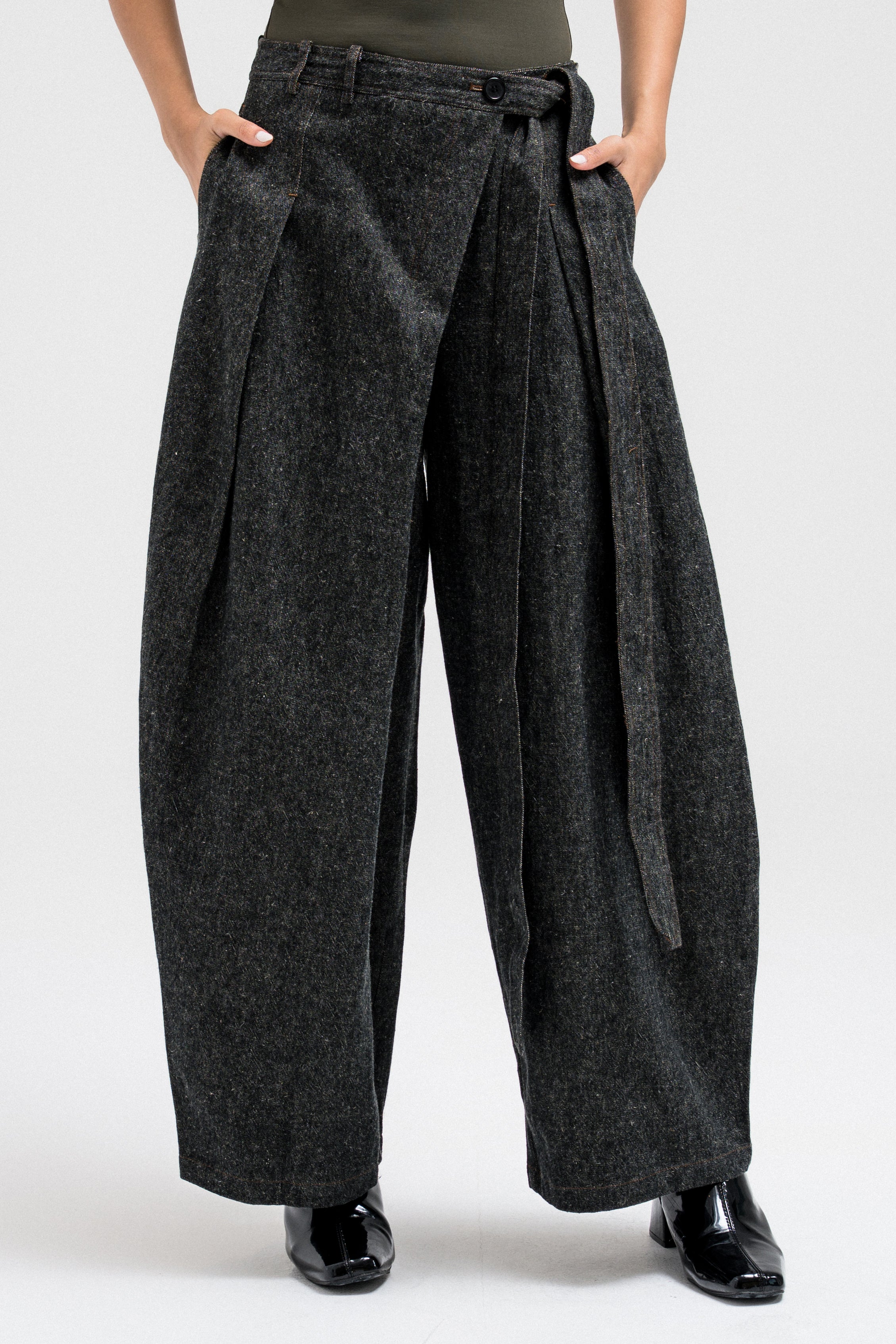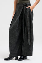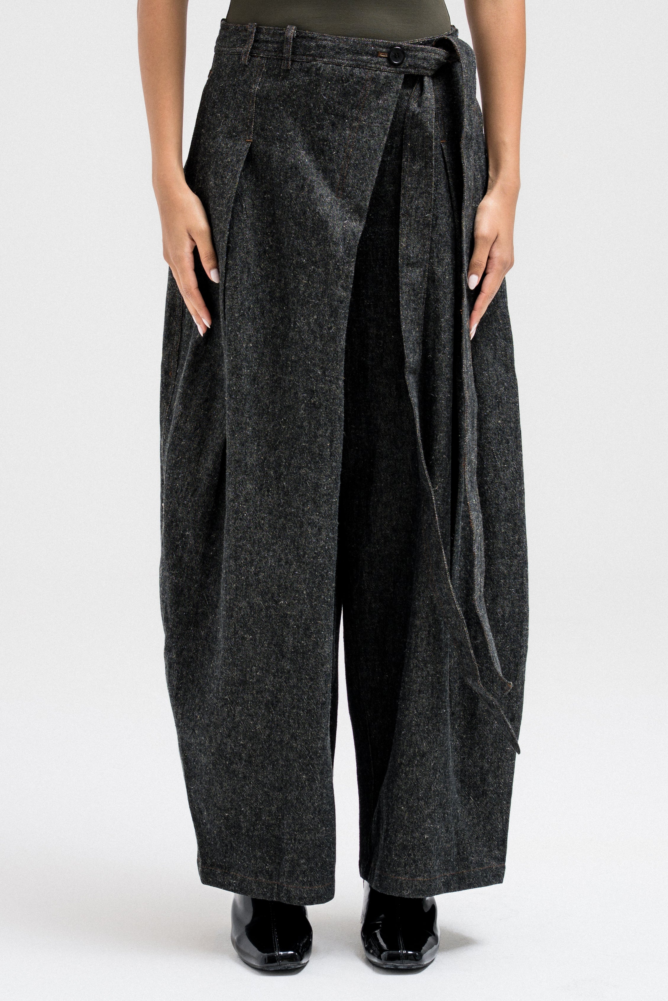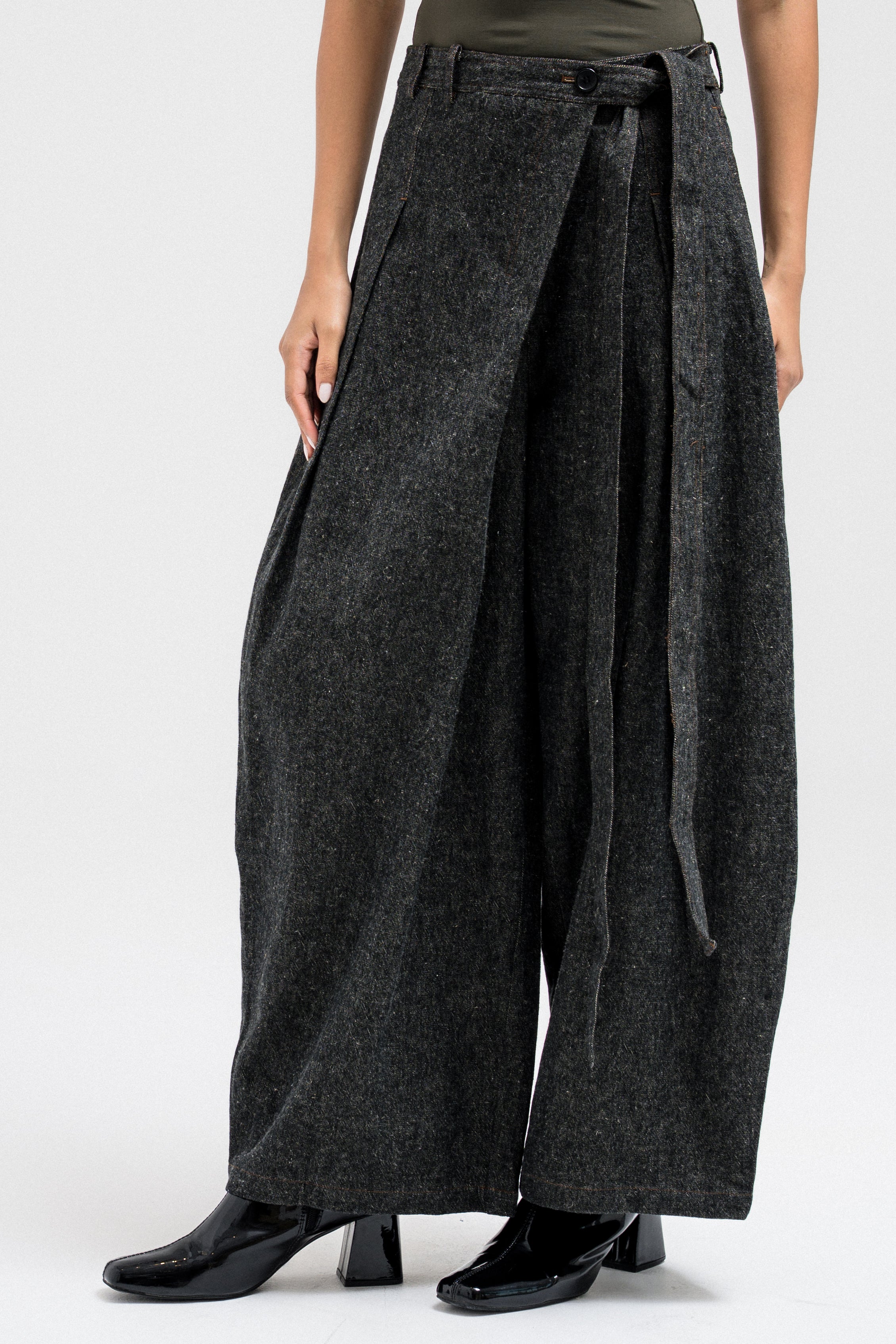 Wide-leg textured denim pants featuring a unique side tie detail for added dimension. Designed with a front button and zipper closure for a structured finish. The rich fabric texture and relaxed fit create a refined yet casual silhouette.