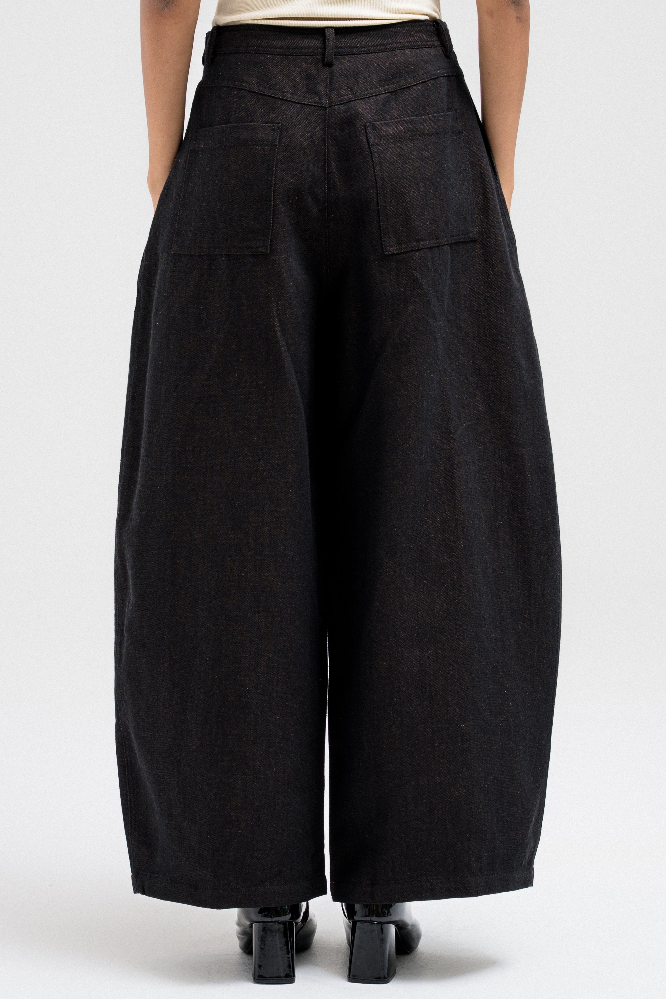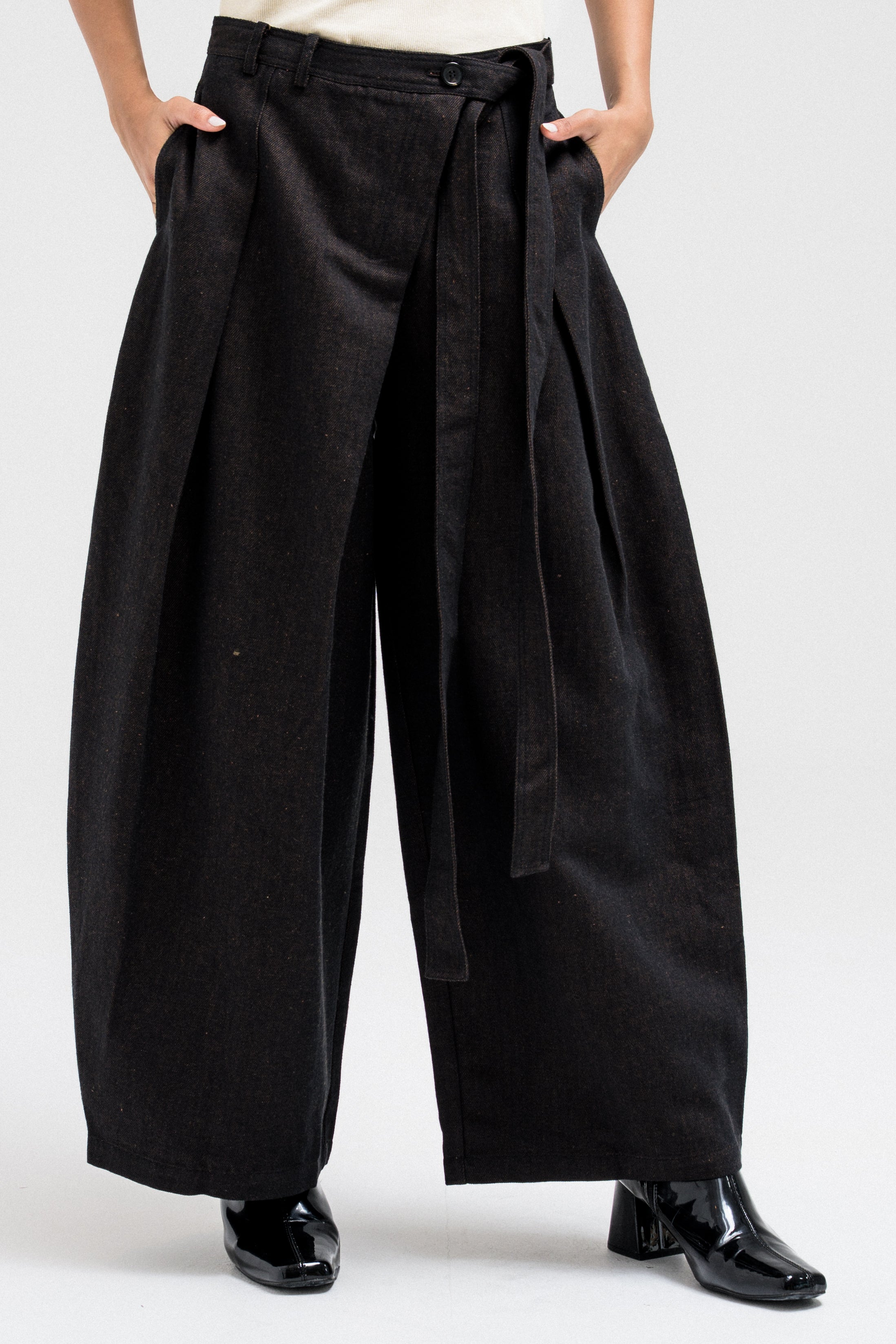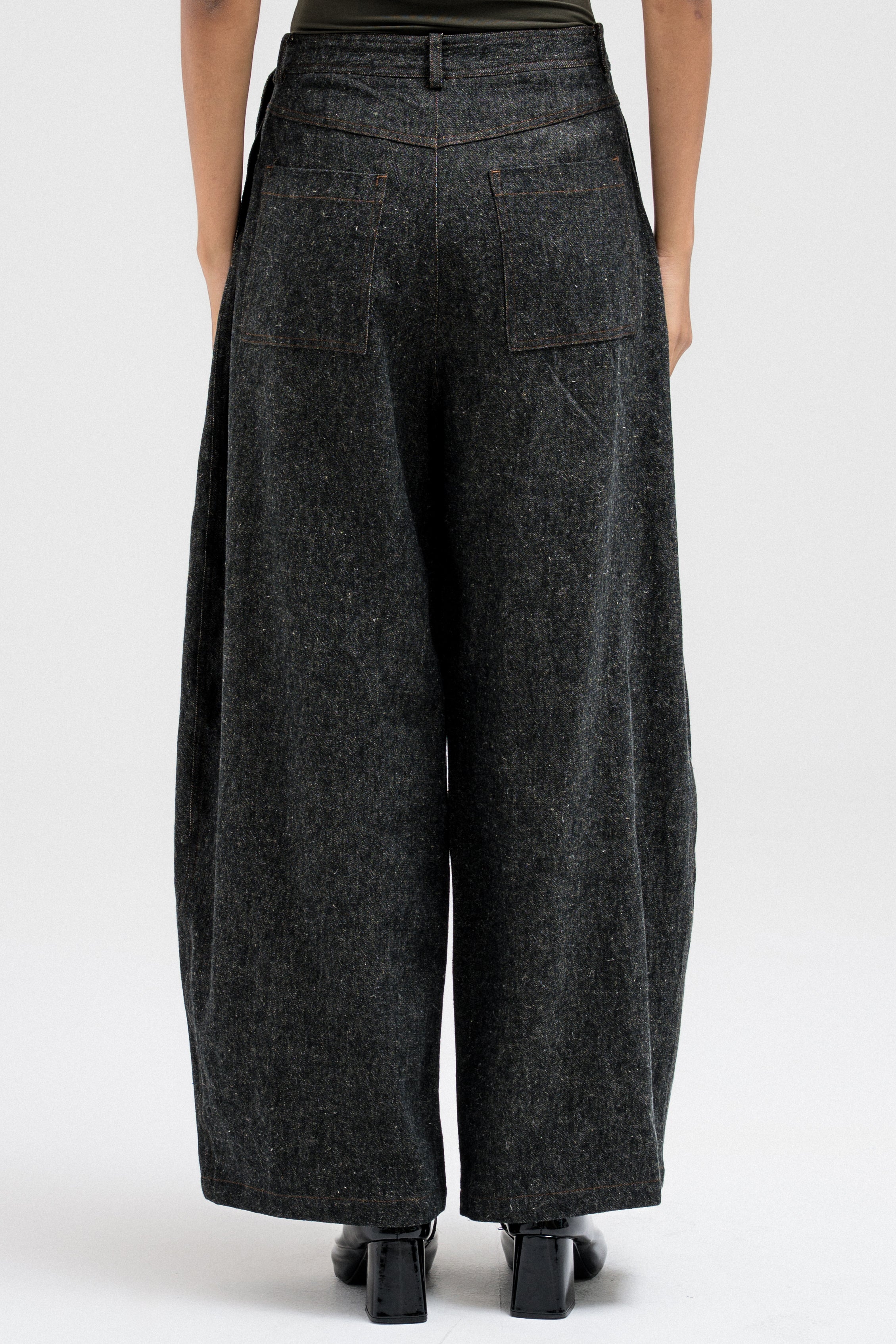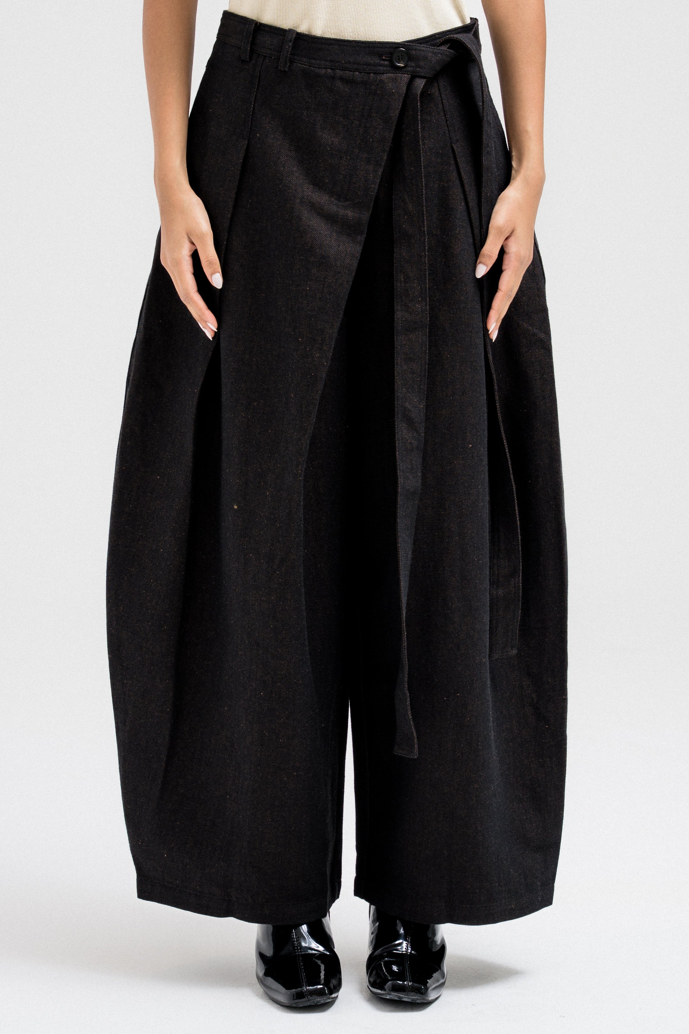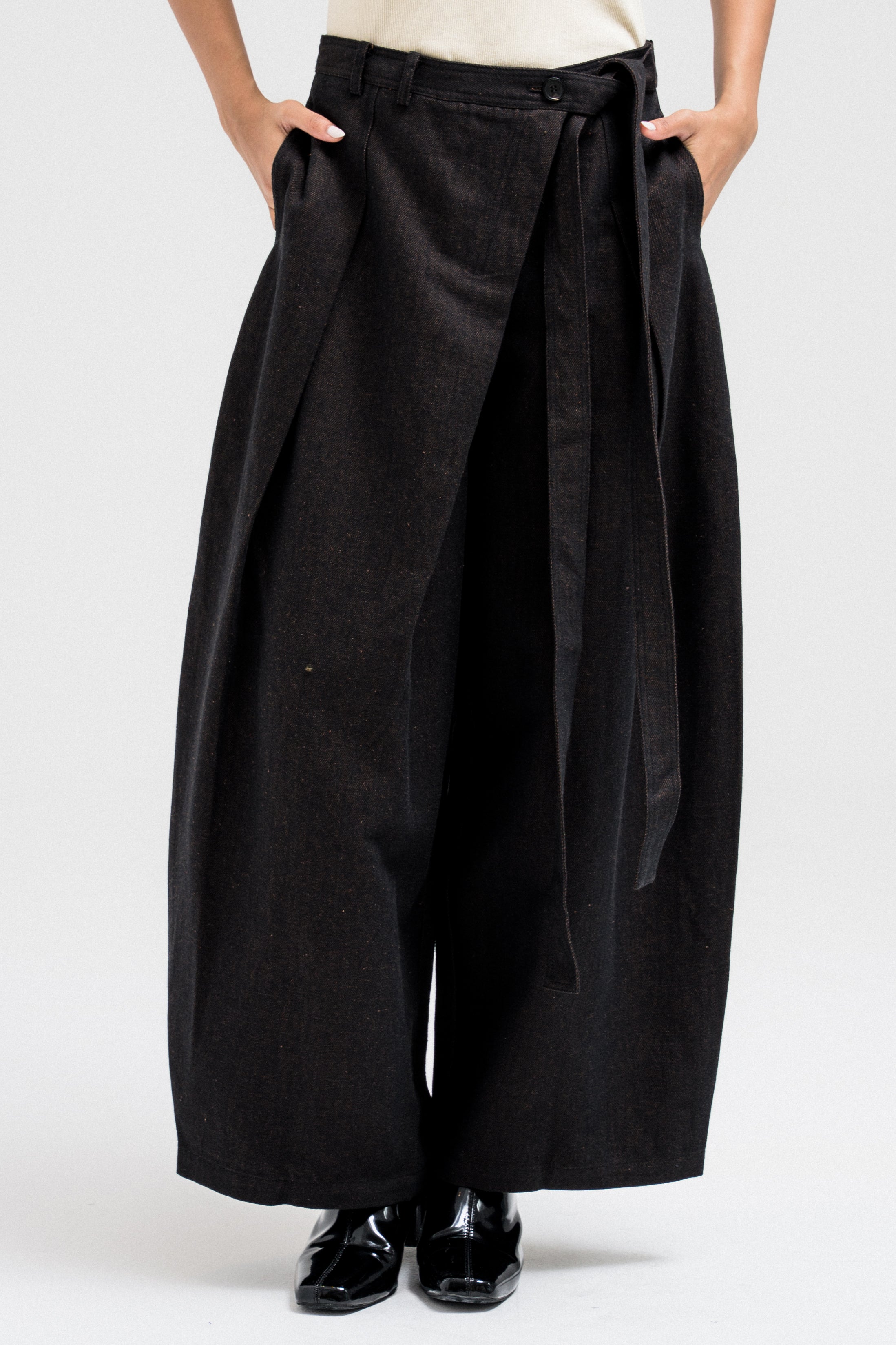 Wide-leg textured denim pants featuring a unique side tie detail for added dimension. Designed with a front button and zipper closure for a structured finish. The rich fabric texture and relaxed fit create a refined yet casual silhouette.
