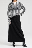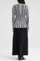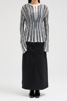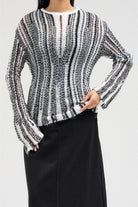 Cozy and lightweight knit top with a vertical textured stripe design that elongates the silhouette. Features a rounded neckline and relaxed fit. Perfect for casual or layered looks.