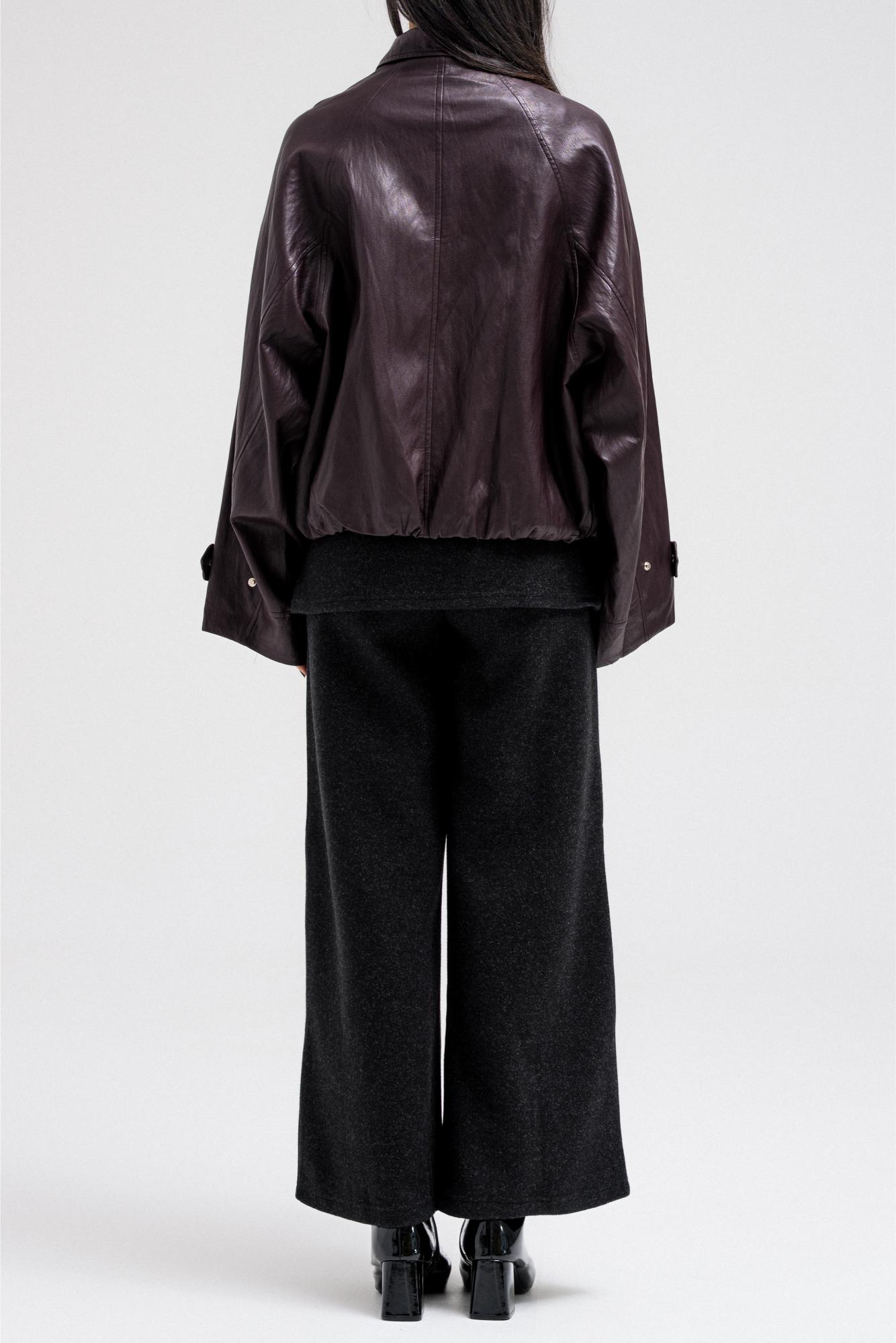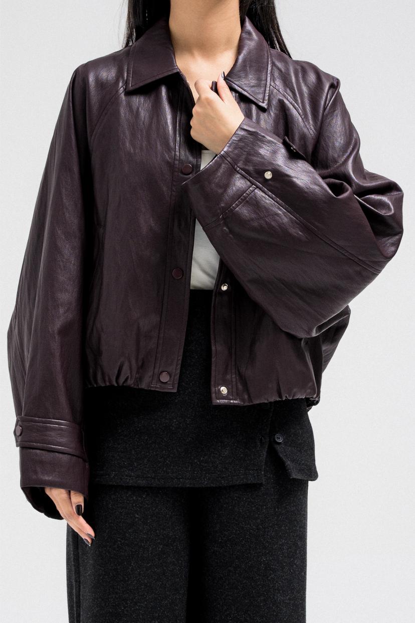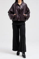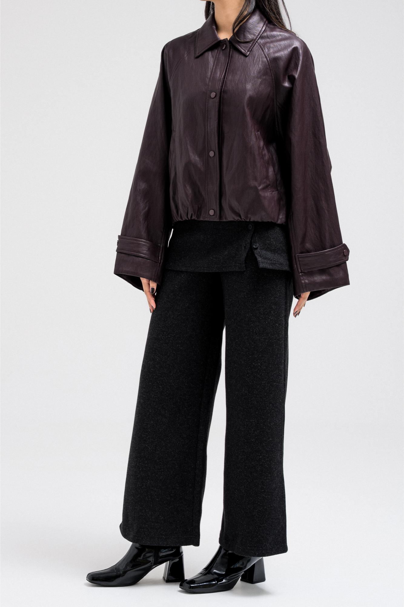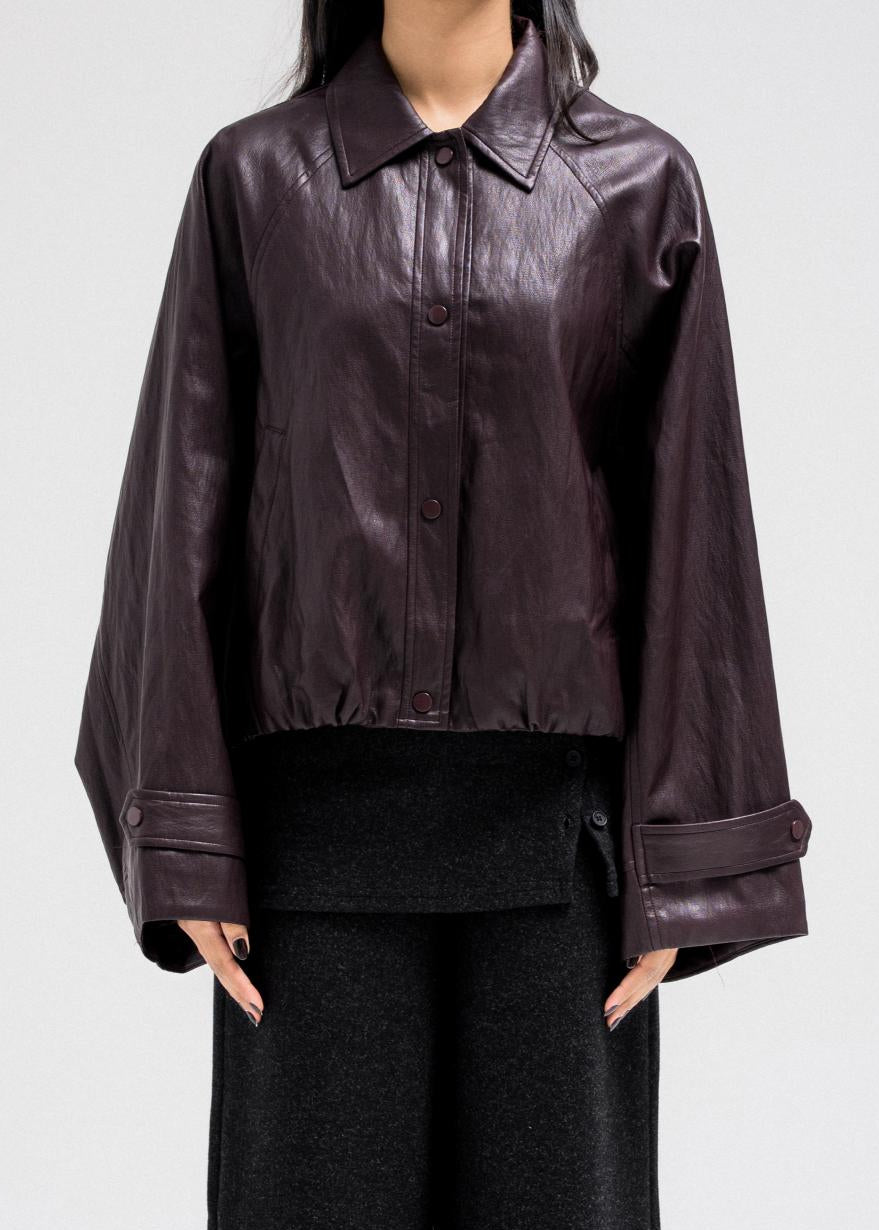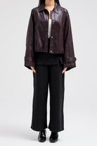 A modern twist on a classic staple, this cropped leather jacket features a sleek collar and front button closure. Its minimal silhouette and smooth texture make it the perfect layering piece to elevate both casual and refined looks.
