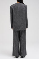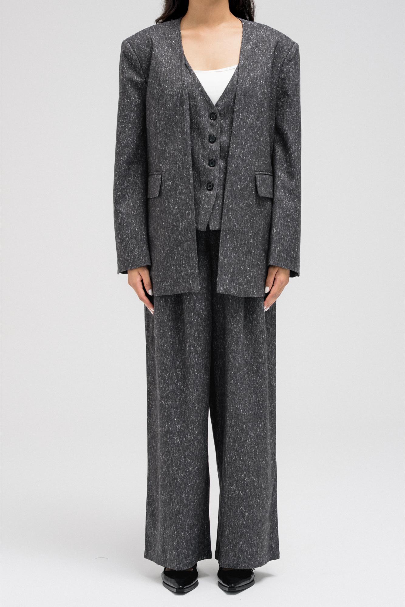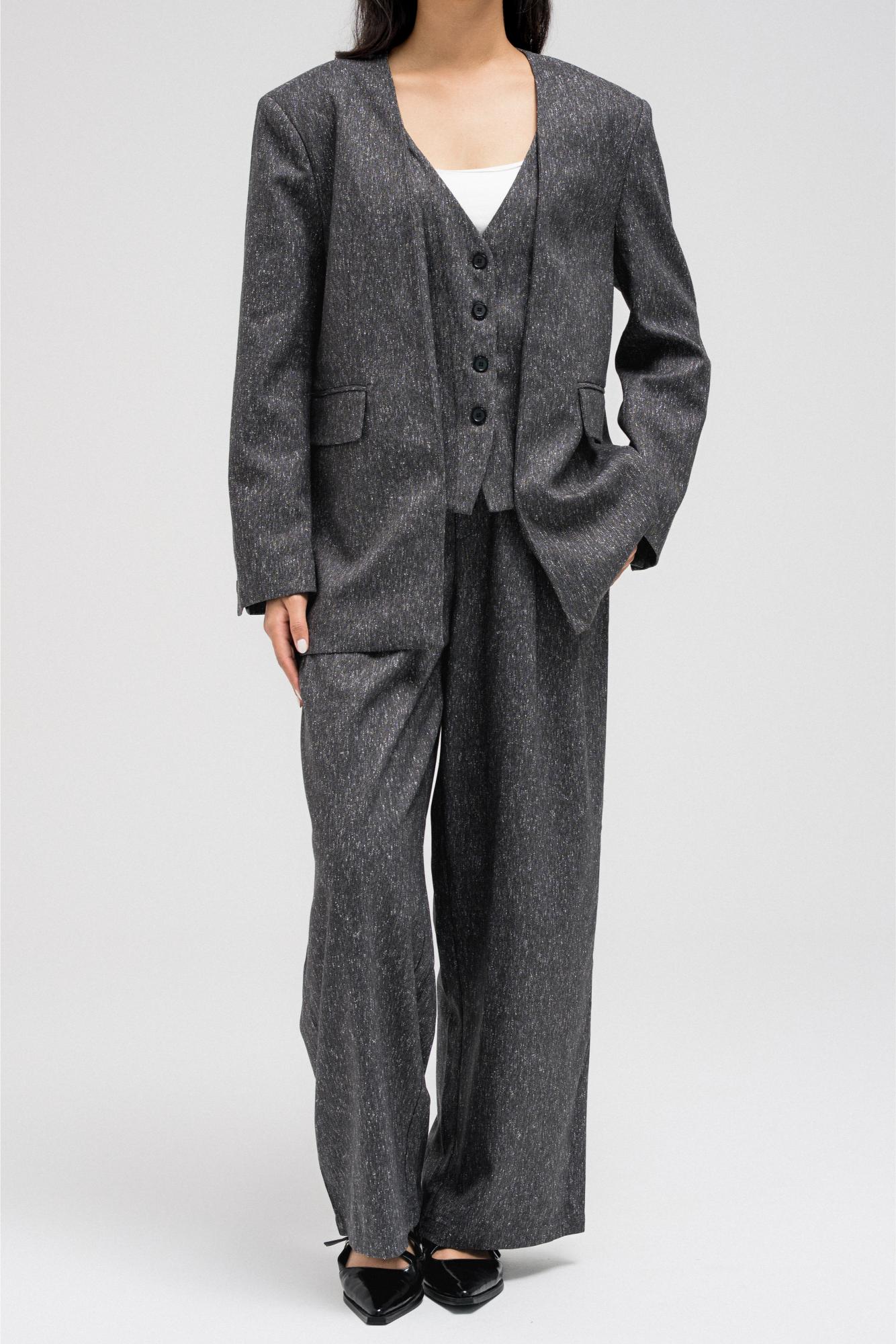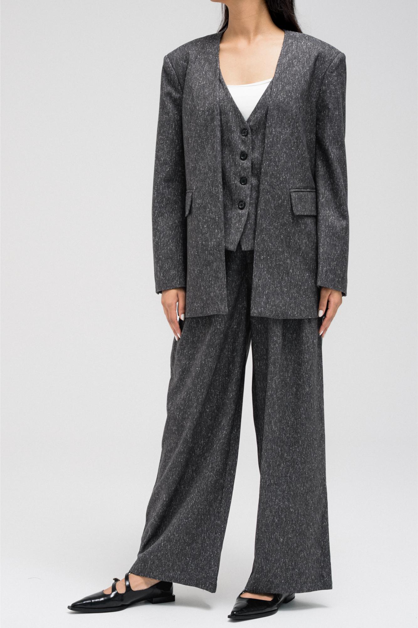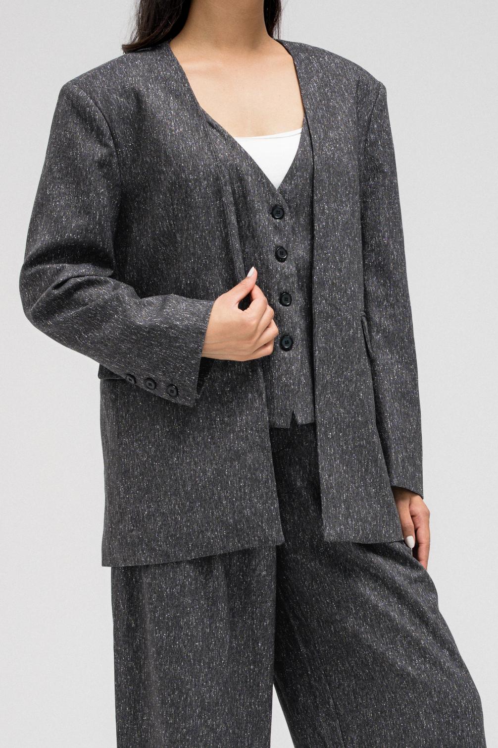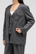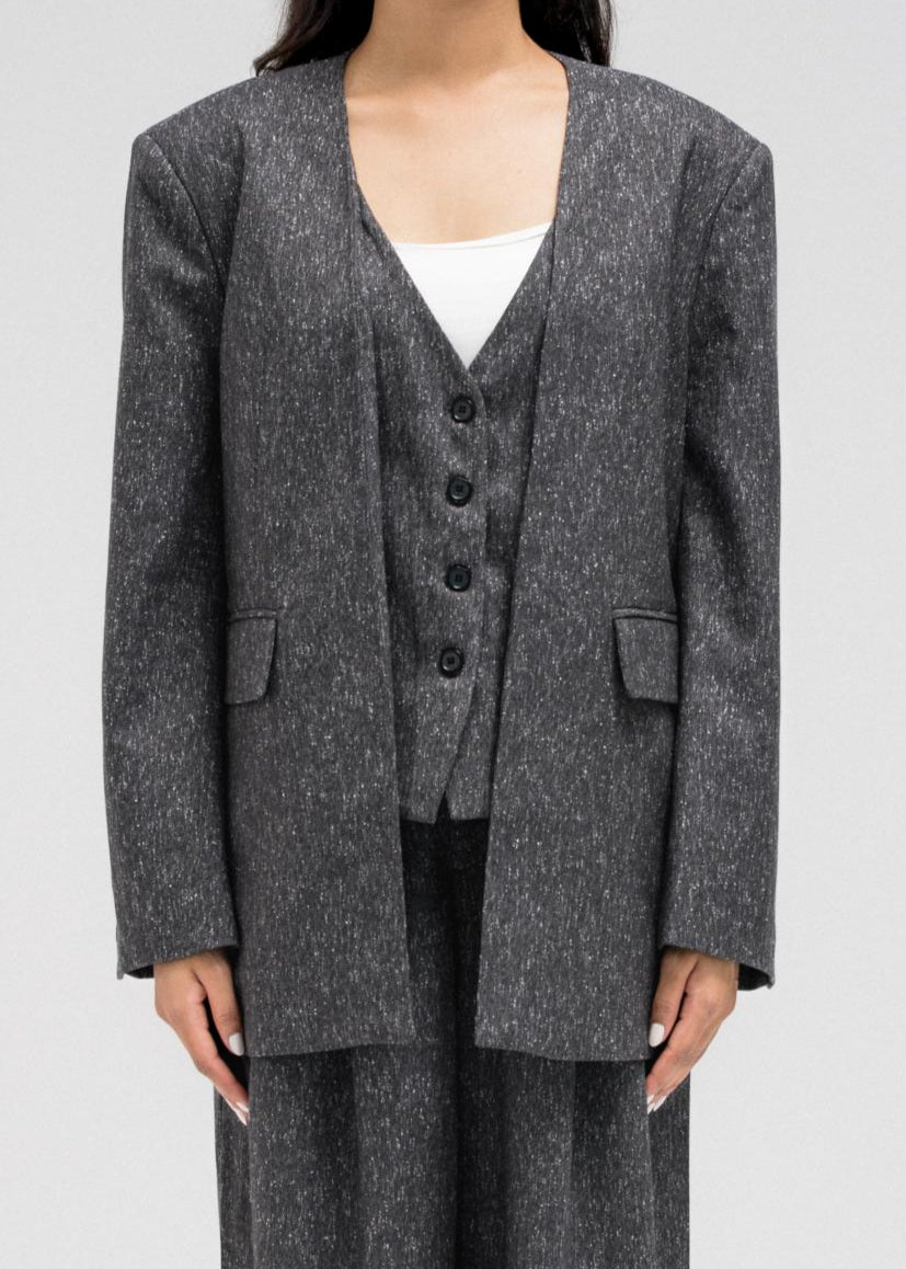 Blazer in a textured light material with a sleek no-collar neckline. Designed to give the illusion of a separate vest, the vest is actually attached to the blazer. Features vested-style button front closure and flap pockets. Perfect to pair with the matching pants.