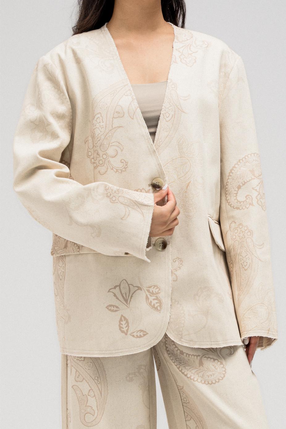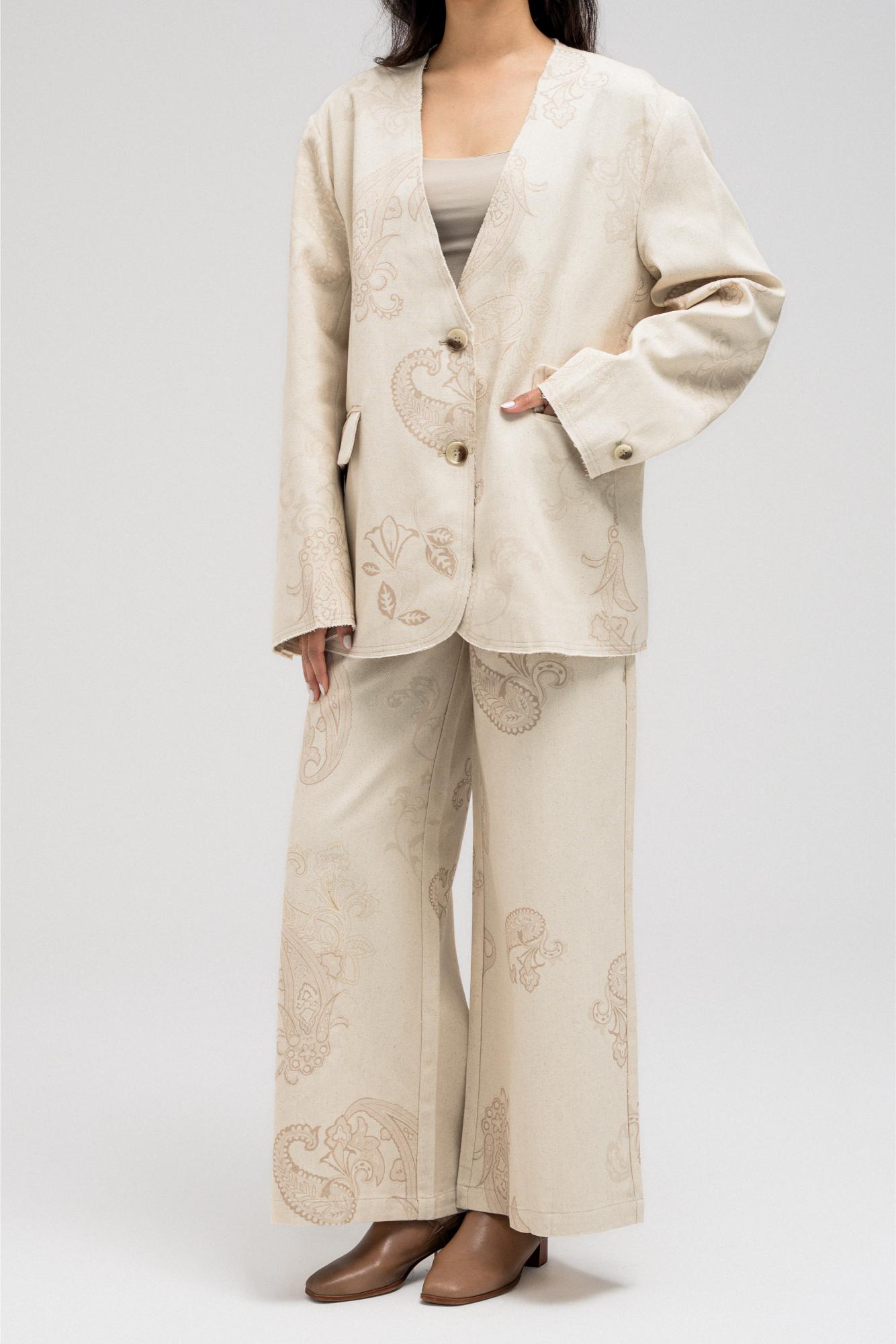 Tailored blazer features a subtle patterned design, adding a refined touch to its classic silhouette. It has a front button closure, flap pockets, and slight shoulder padding.