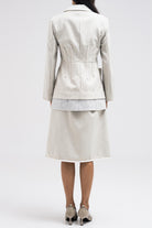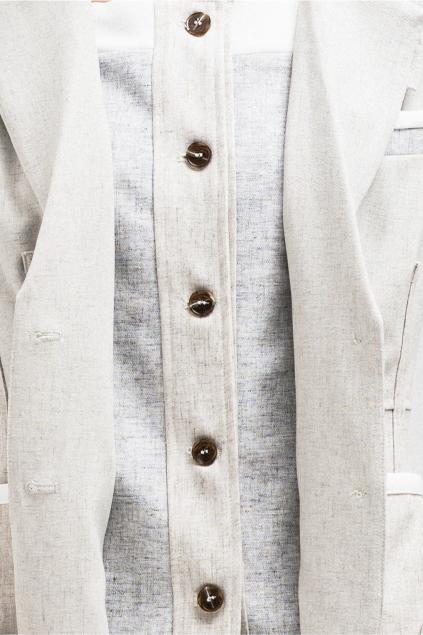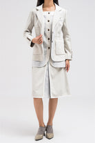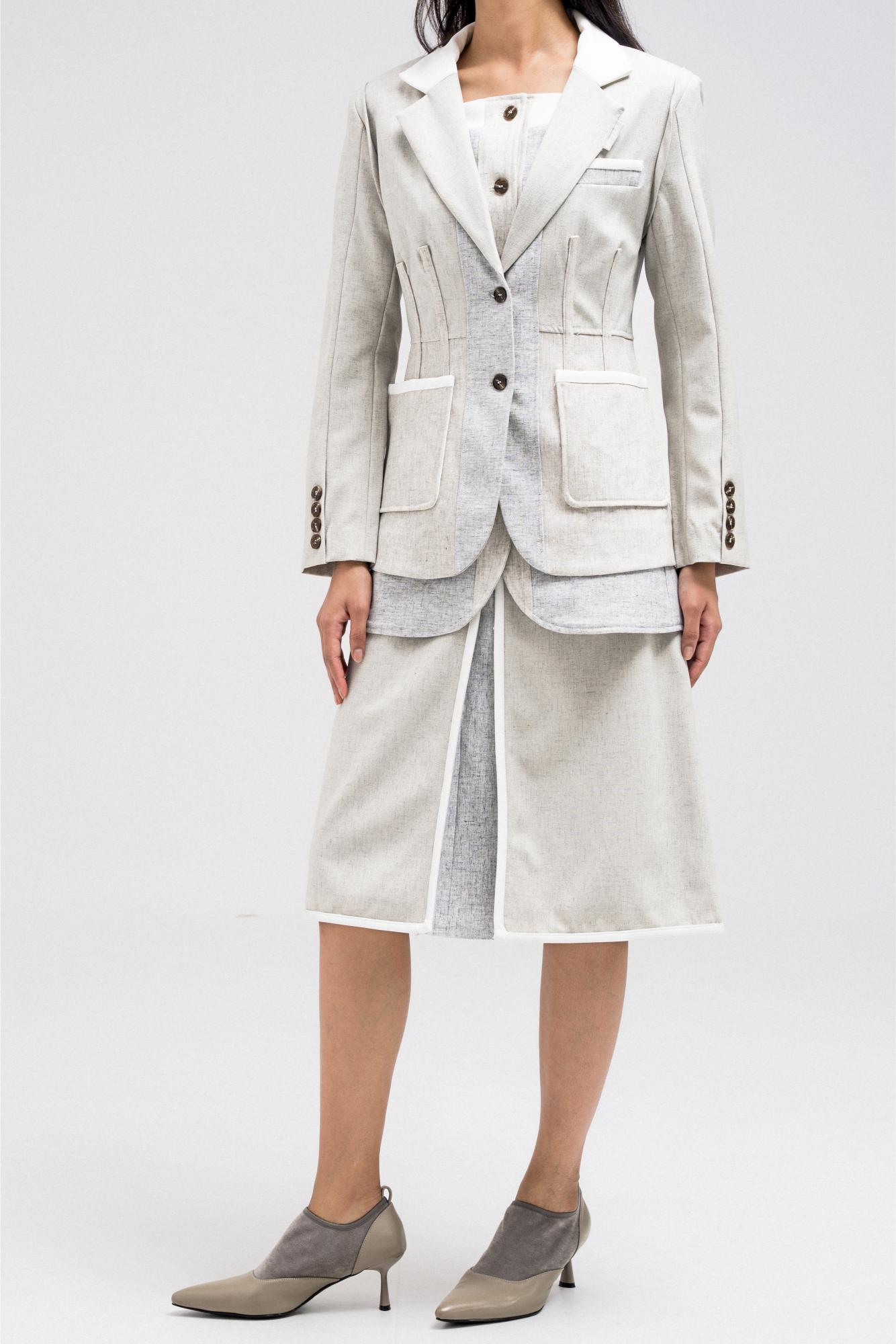 Modern layered-style blazer designed with visible contrast panels in different tones. The overlapping fabric layers create dimension and depth, giving the piece a contemporary edge. Finished with front buttons and flap pockets for a tailored look. Nice to pair with its matching skirt for a statement coordinated outfit.