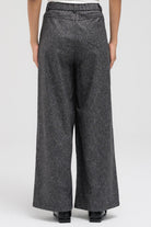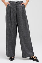 Pants in a textured light material featuring a single button and zipper closure. Front button detailing creates the illusion of multiple buttons. Designed with side pockets and an elastic band at the back of the waist for added comfort. Matches perfectly with the coordinating blazer.
