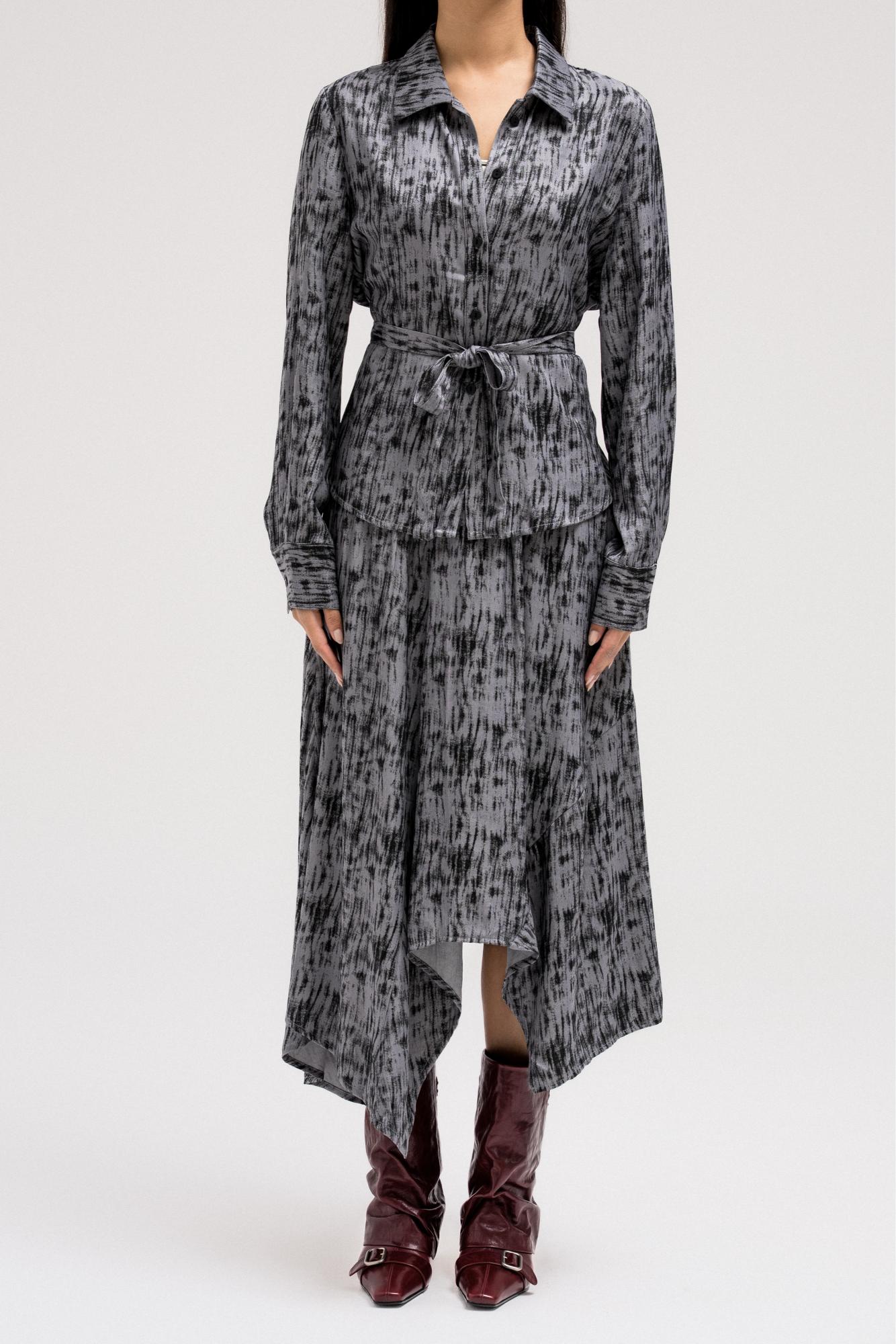 This lightweight patterned top is crafted from soft, airy fabric for effortless wear. Designed with a sharp collar and long sleeves, it balances ease with polish. The standout feature is its attached waist belt, which can be wrapped at the front for a cinched silhouette or tied at the back for a relaxed, laid-back look. Paired  perfectly with the matching skirt.