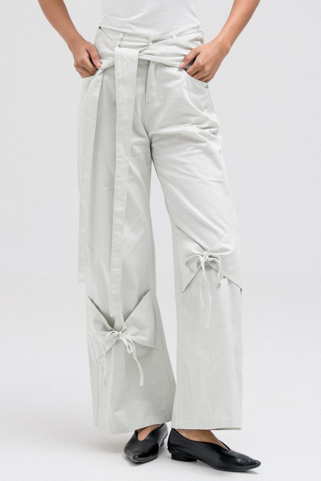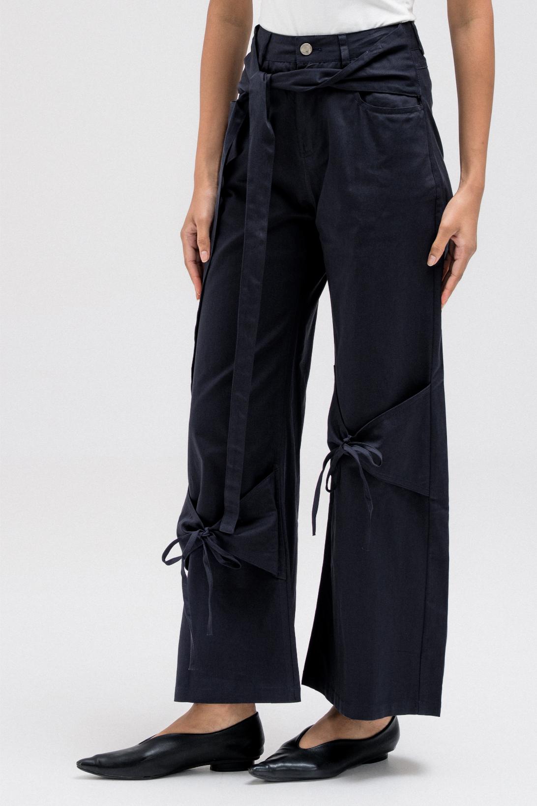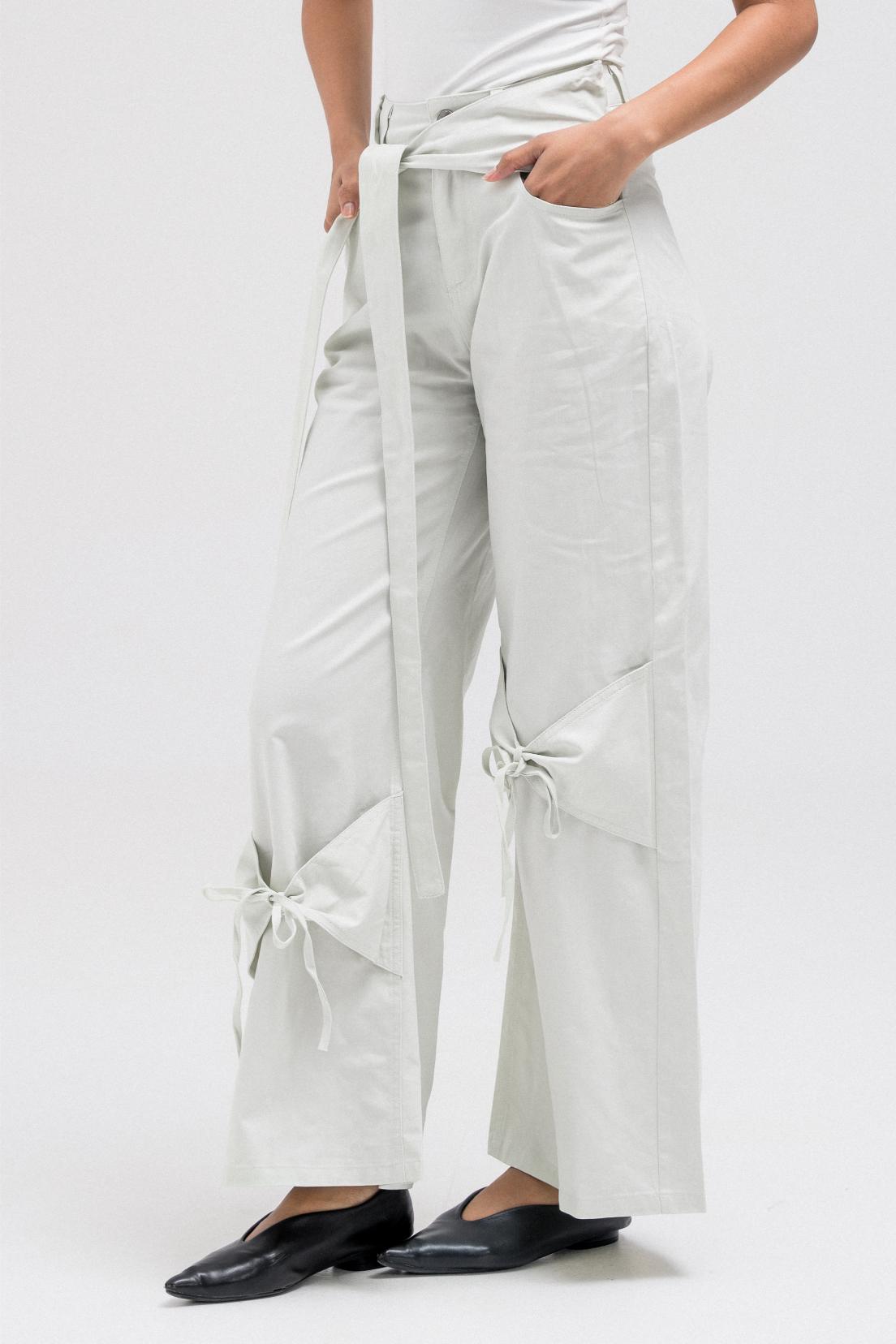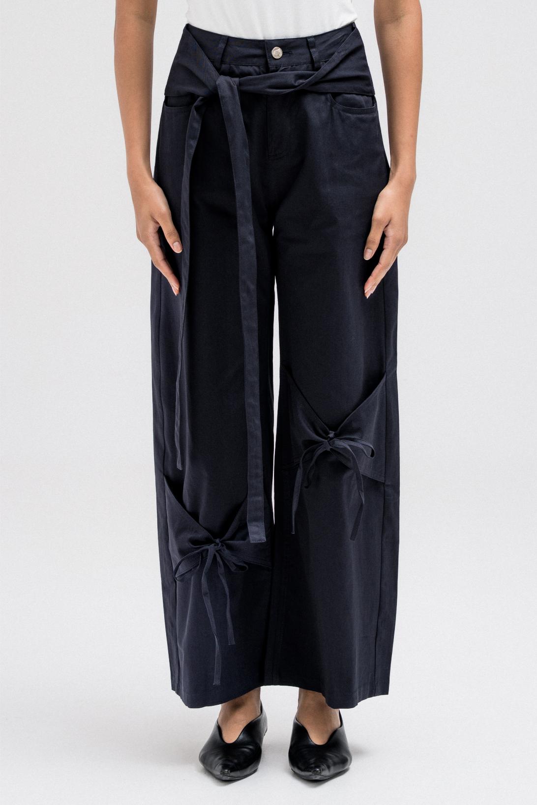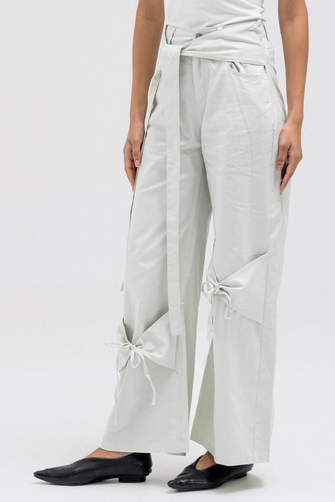 Wide-leg tailored pants designed with a wrap-style ribbon detail, creating a layered and sculpted look. Finished with a button and zipper closure, perfect to style with simple tops or matching pieces.