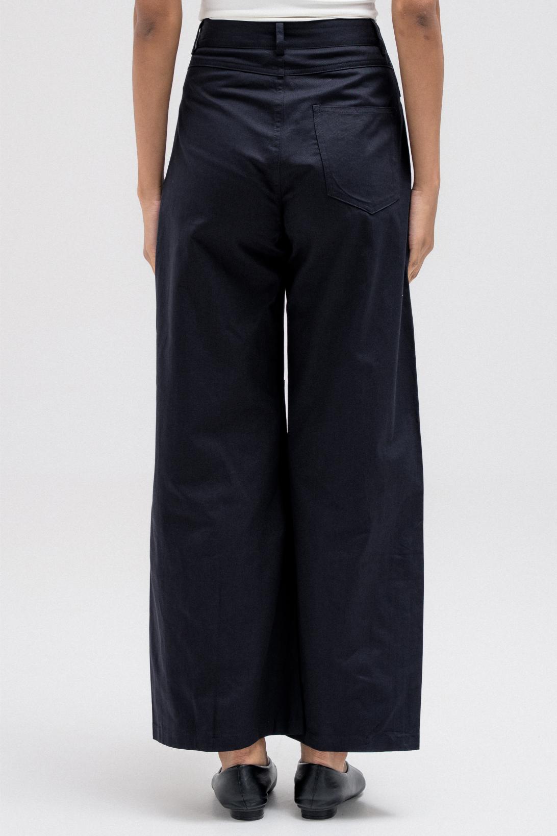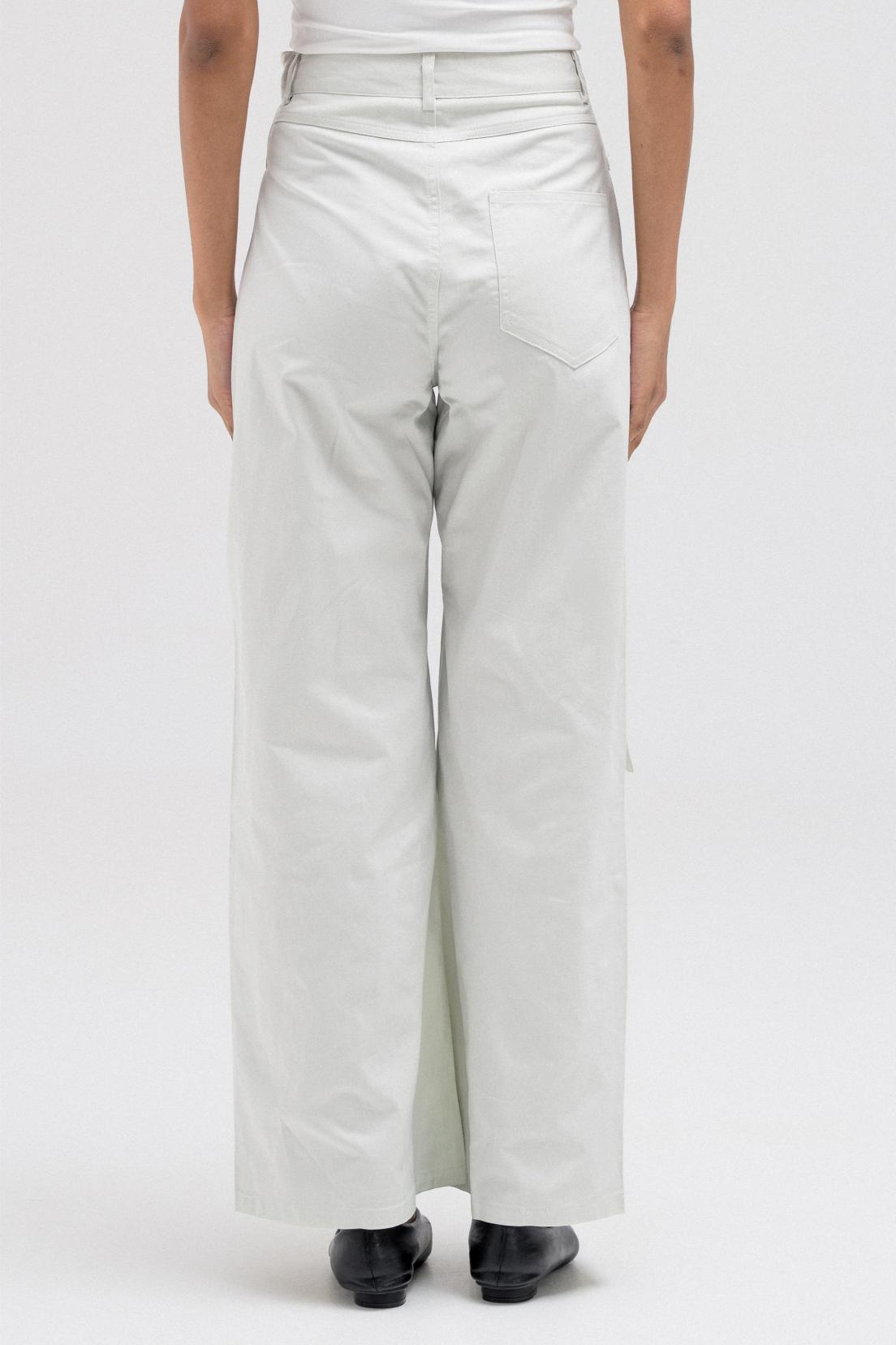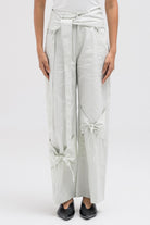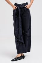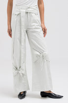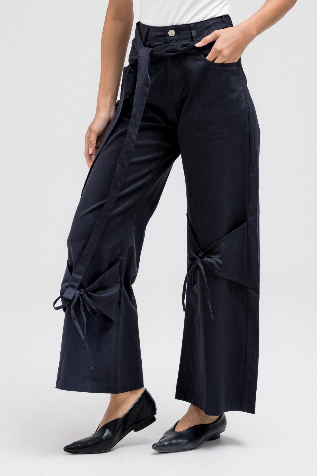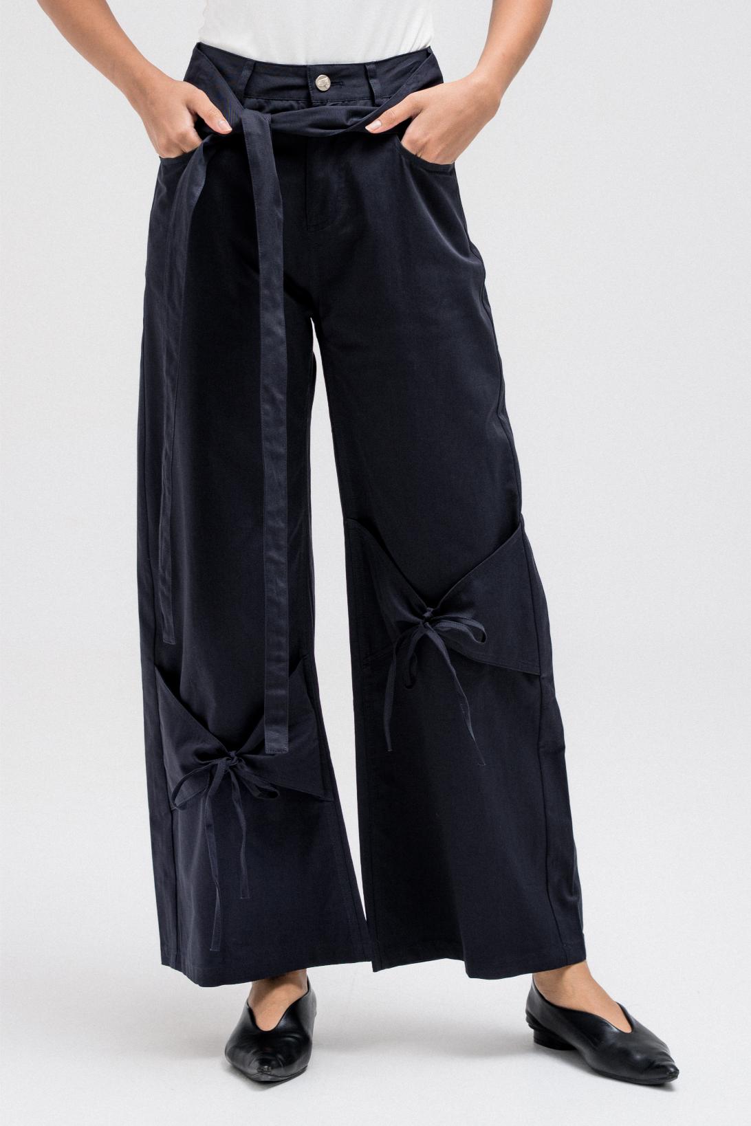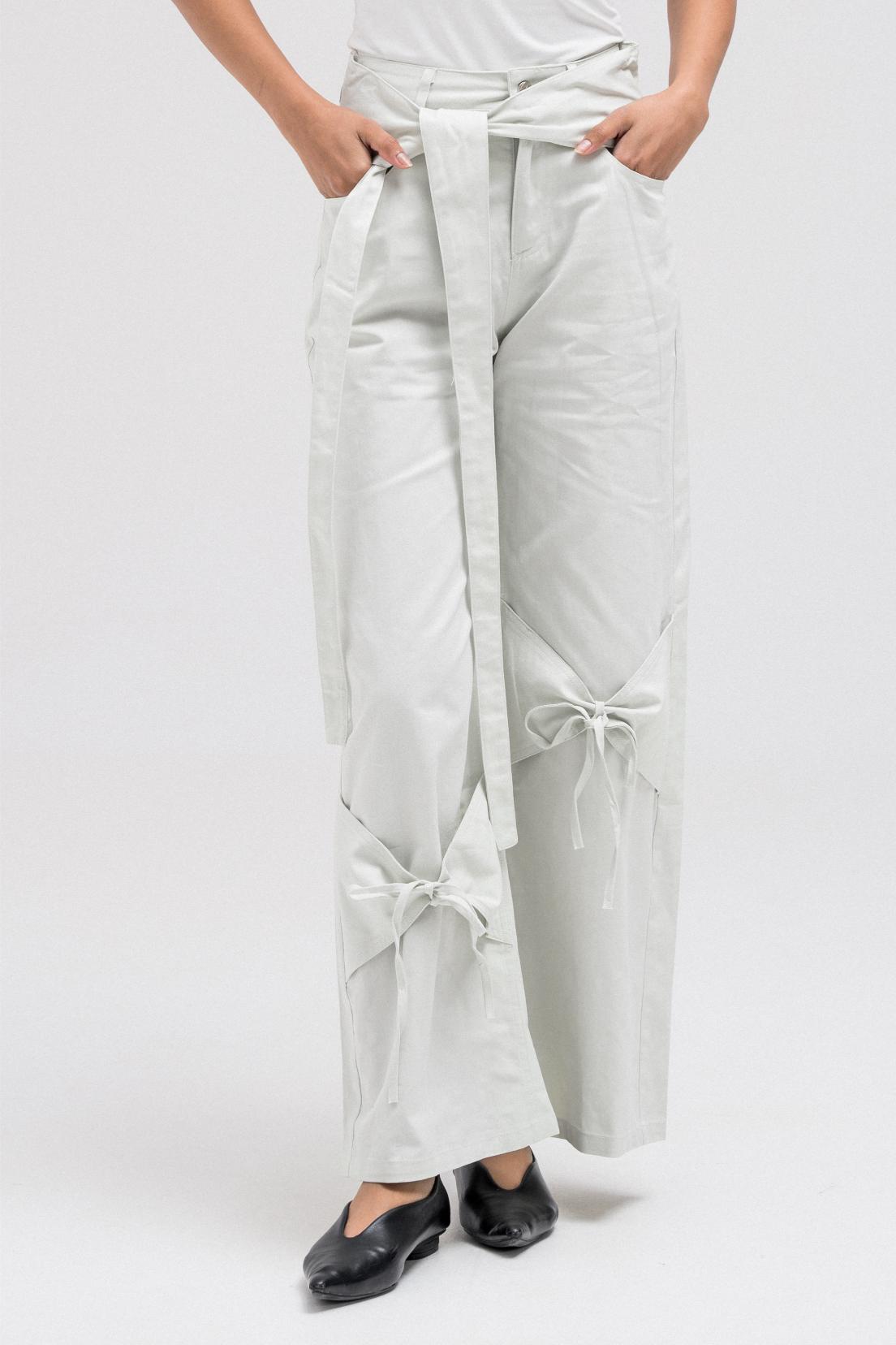 Wide-leg tailored pants designed with a wrap-style ribbon detail, creating a layered and sculpted look. Finished with a button and zipper closure, perfect to style with simple tops or matching pieces.