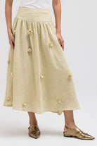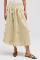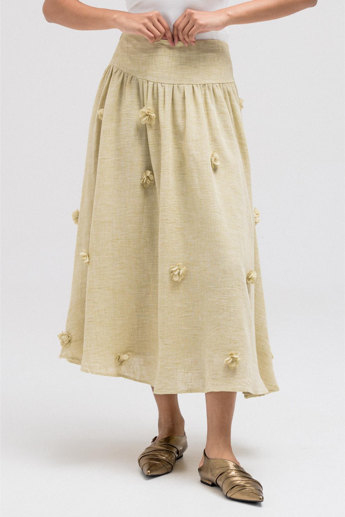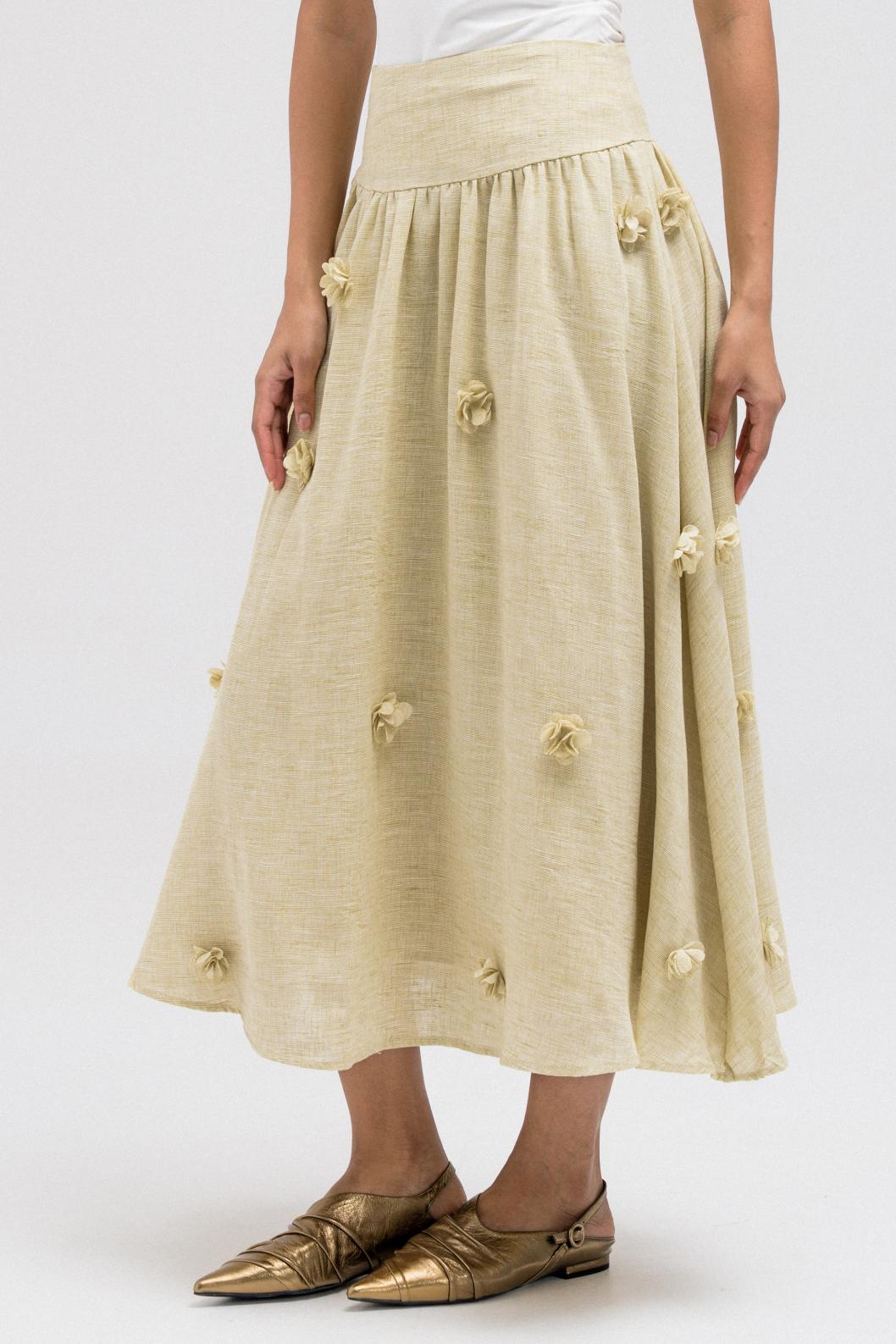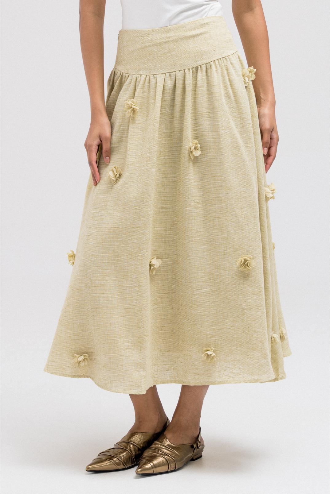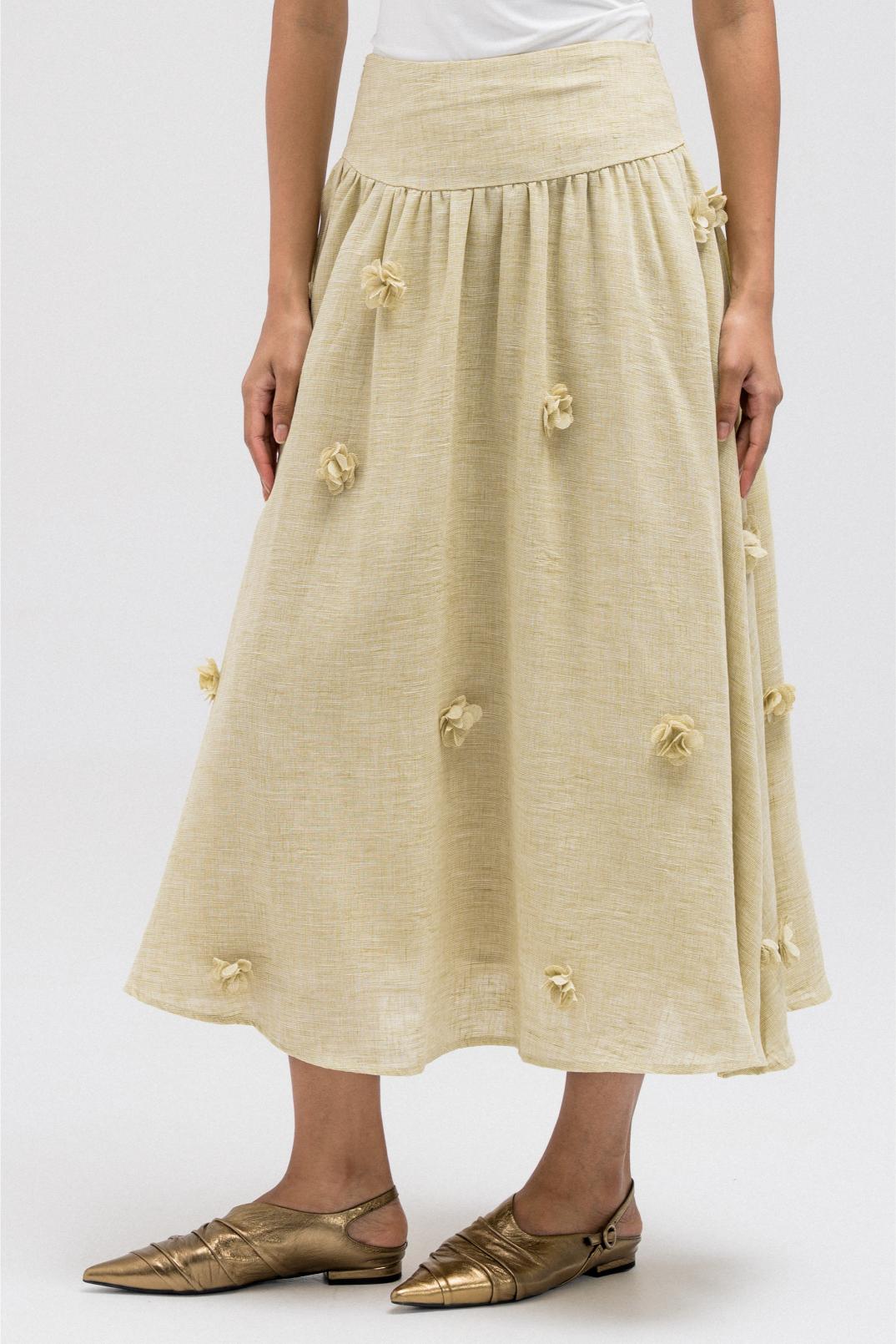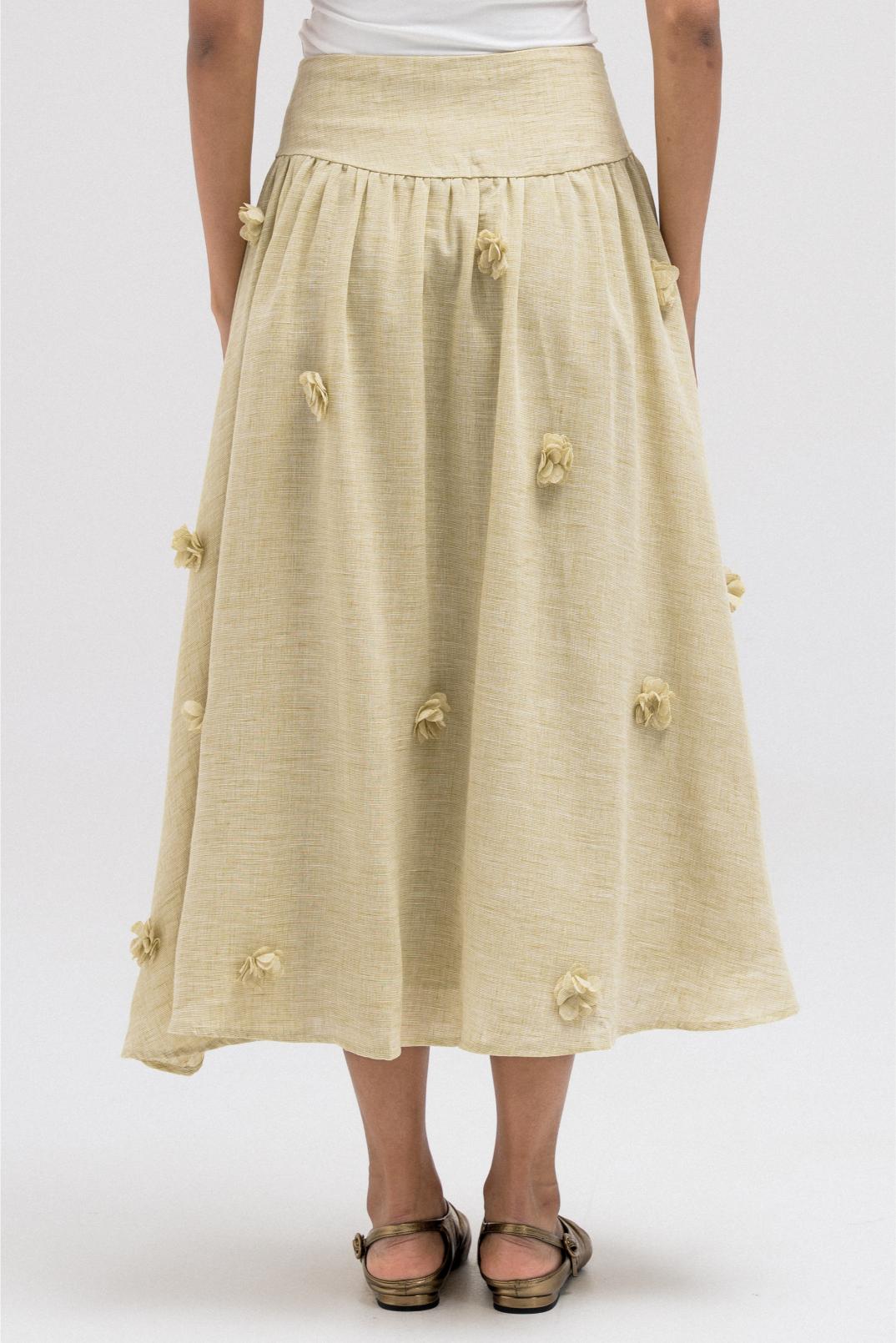 A lightweight, flowy skirt made from linen material featuring subtle 3D floral detailing throughout. The soft movement and feminine volume make it perfect to pair with the matching floral jacket for a cohesive full look.