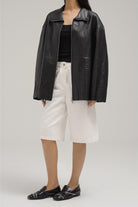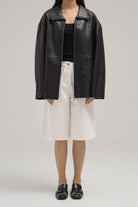 A minimalist yet polished piece, this jacket is crafted from smooth faux leather with a soft sheen finish. Designed with a straight, relaxed fit, it features a classic collar and a full front zipper closure. Its versatile cut makes it easy to layer over both casual and elevated outfits, offering an effortless blend of edge and sophistication.