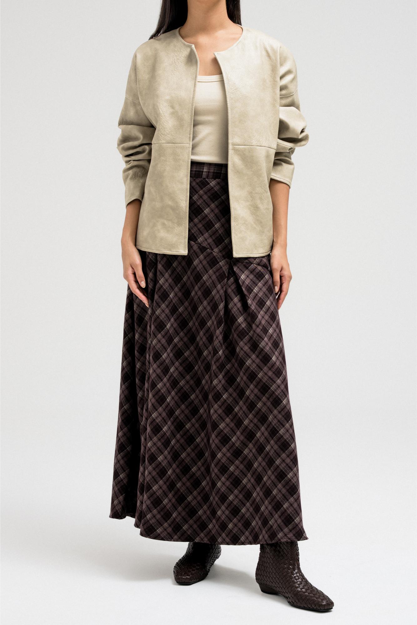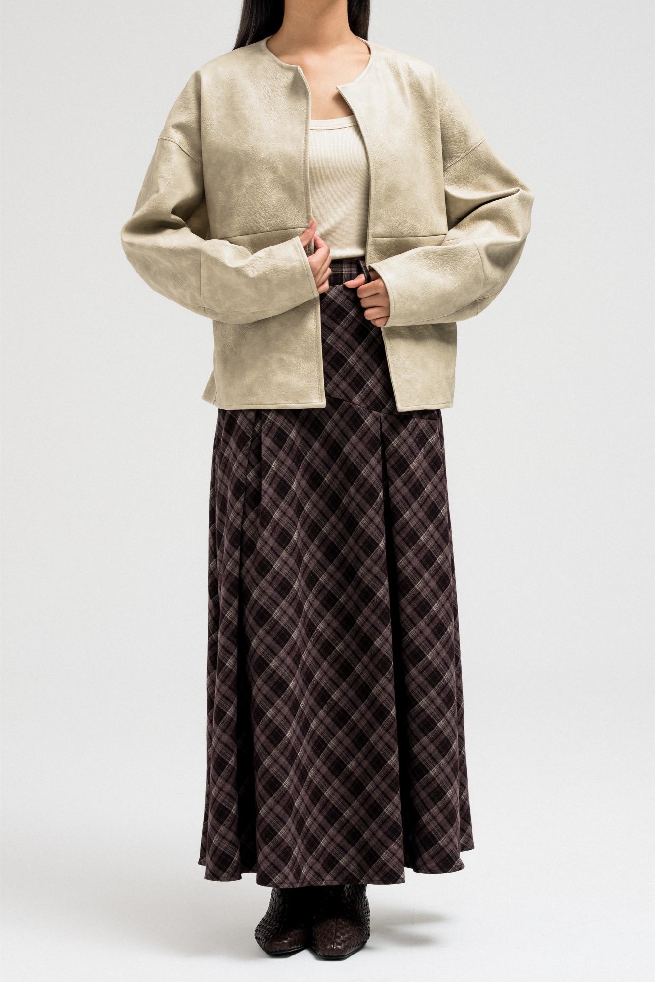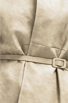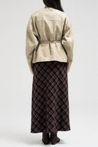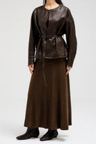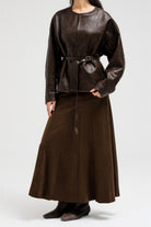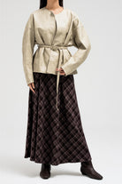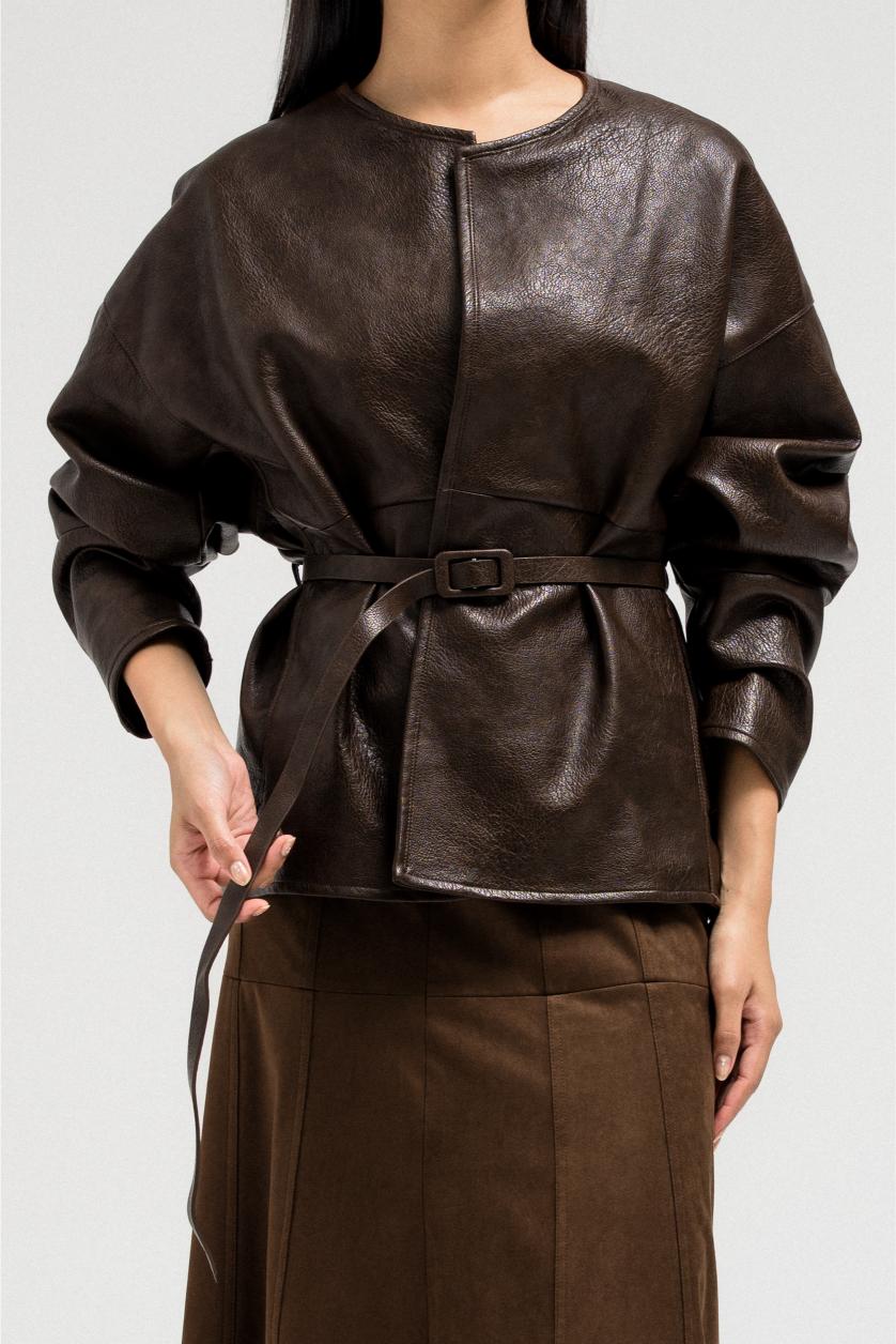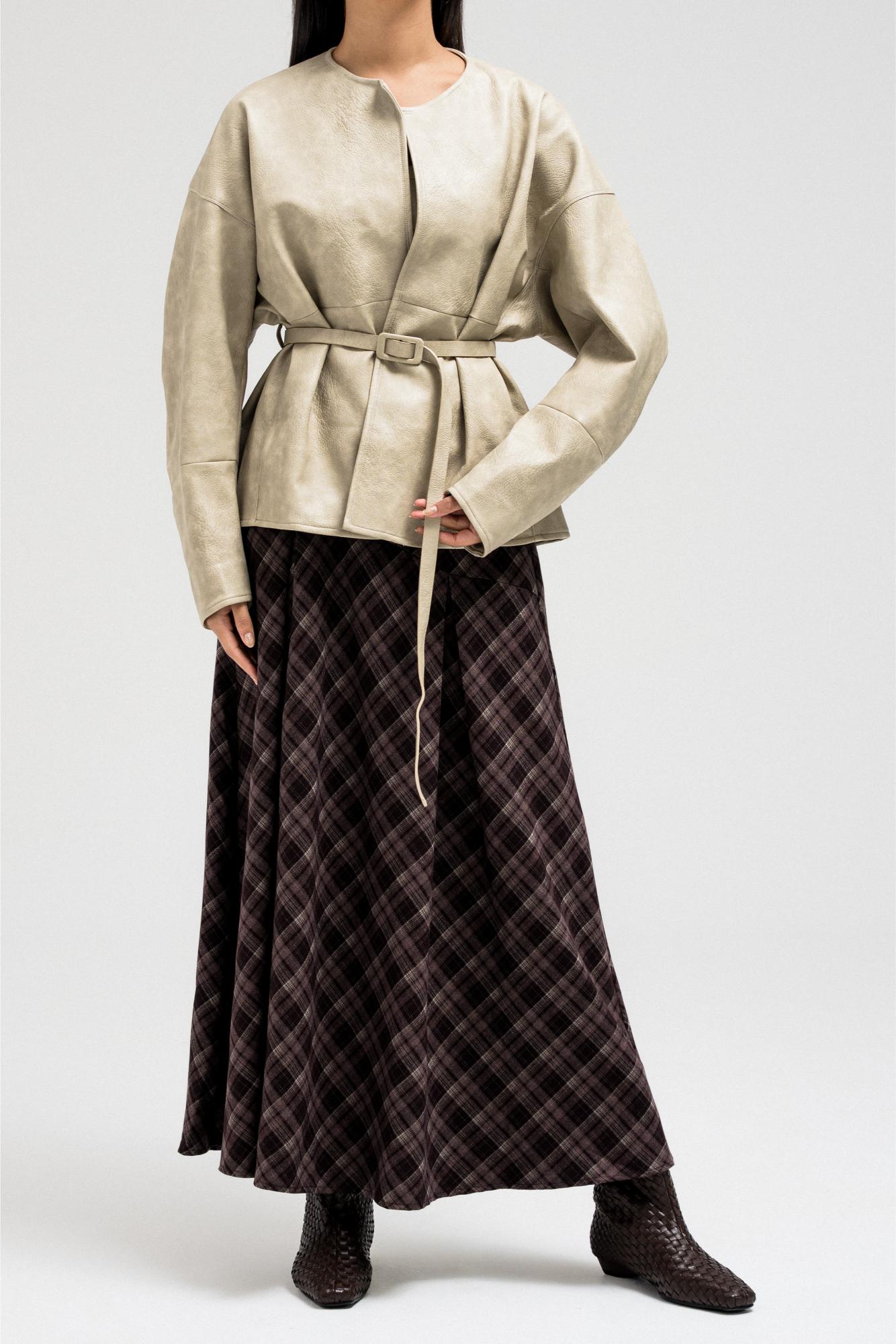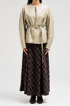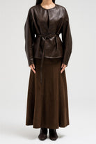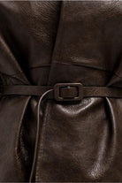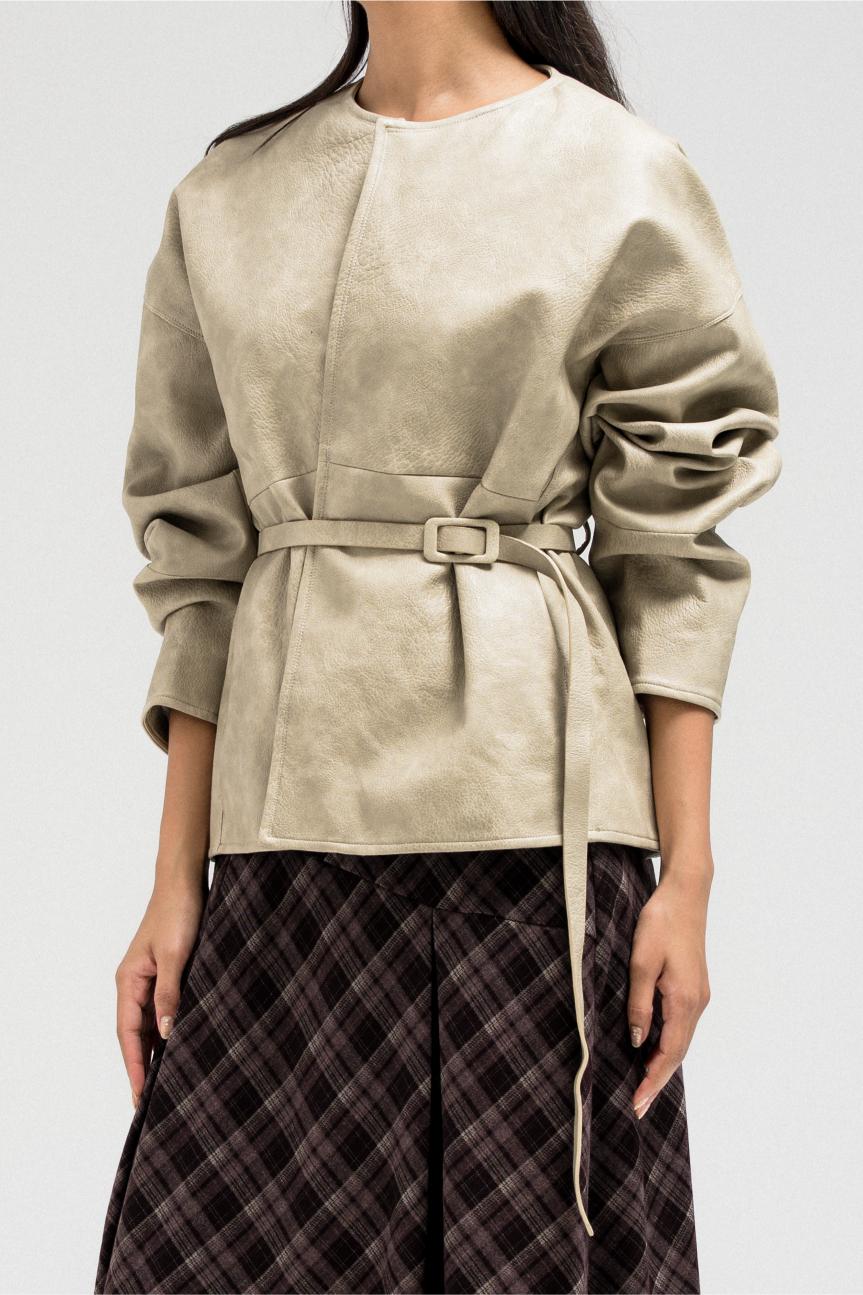 Crafted from smooth leather material, this jacket features a sleek round collar and minimal front design for a clean, modern look. It includes a matching belt that can be tied at the front or back for versatile styling and a defined waistline. Finished with practical side pockets, it’s the perfect balance of structure and sophistication.