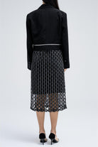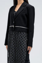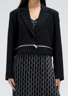 Cropped jacket featuring a single button front closure and structured notched collar. Designed with zipper accents on both sides of the hem for a modern edge. Pairs perfectly with dresses for a polished look.