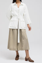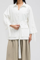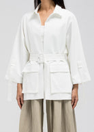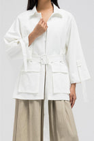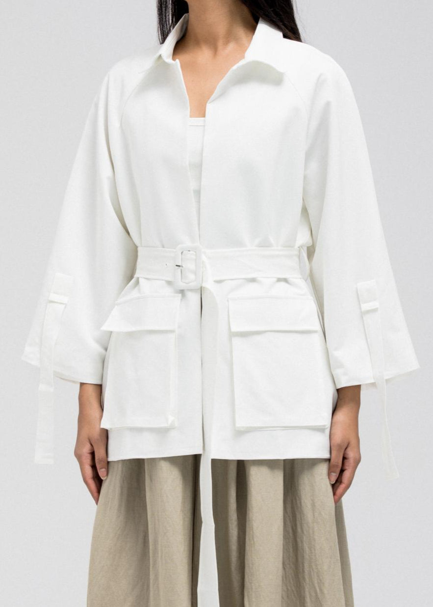 Crafted from a light, flowy material, this jacket features a classic collar, front button closure, and two flap pockets at the front. It comes with a matching detachable belt with buckle detail, allowing you to cinch the waist for a more structured silhouette.