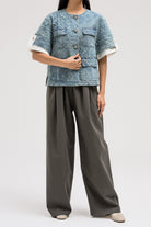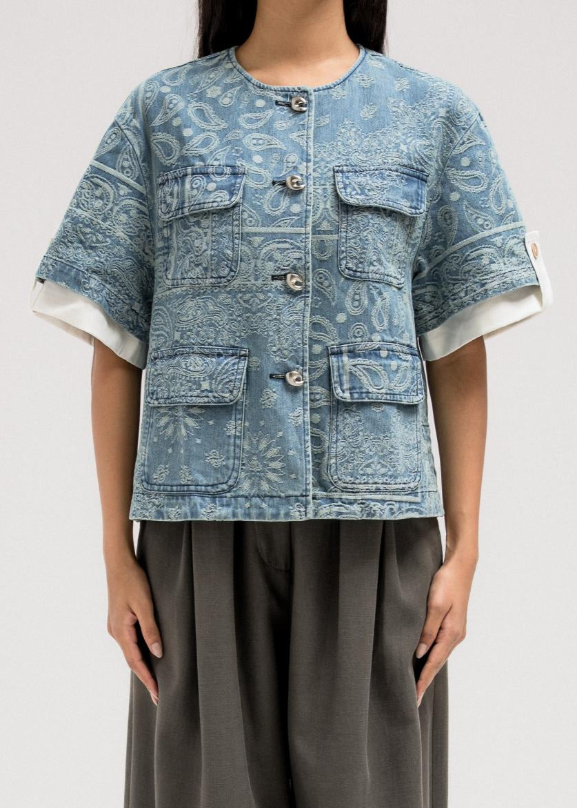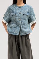 Denim jacket designed with shorter sleeves and front flap pockets for a utility-inspired look. The jacket features an all-over patterned texture, adding a unique touch to the denim. Sleeves are styled with an attached white shirt detail for layered contrast. Finished with silver button closures at the front.