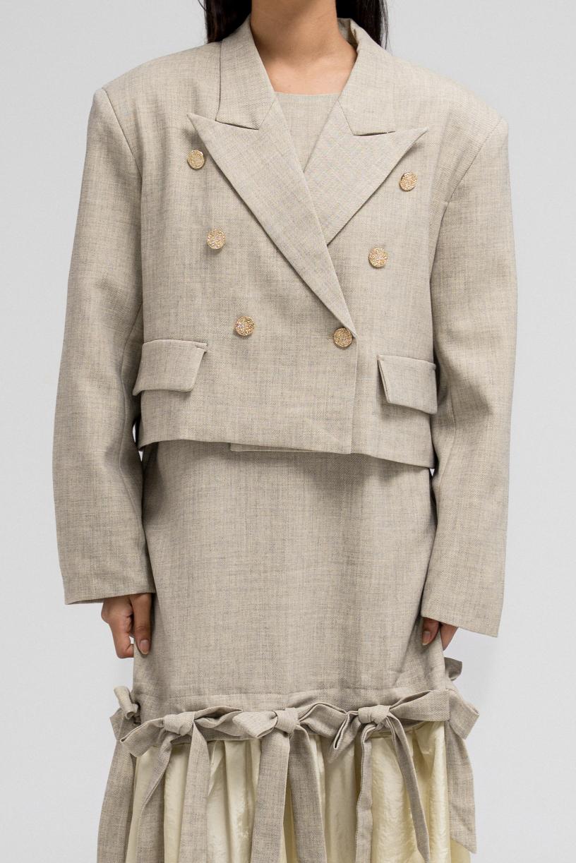 This cropped blazer features a structured, textured fabric with a sharp notch collar for a polished touch. The front is detailed with metallic button closures, adding a refined contrast. While it appears to have pockets, the design includes only pocket flaps.