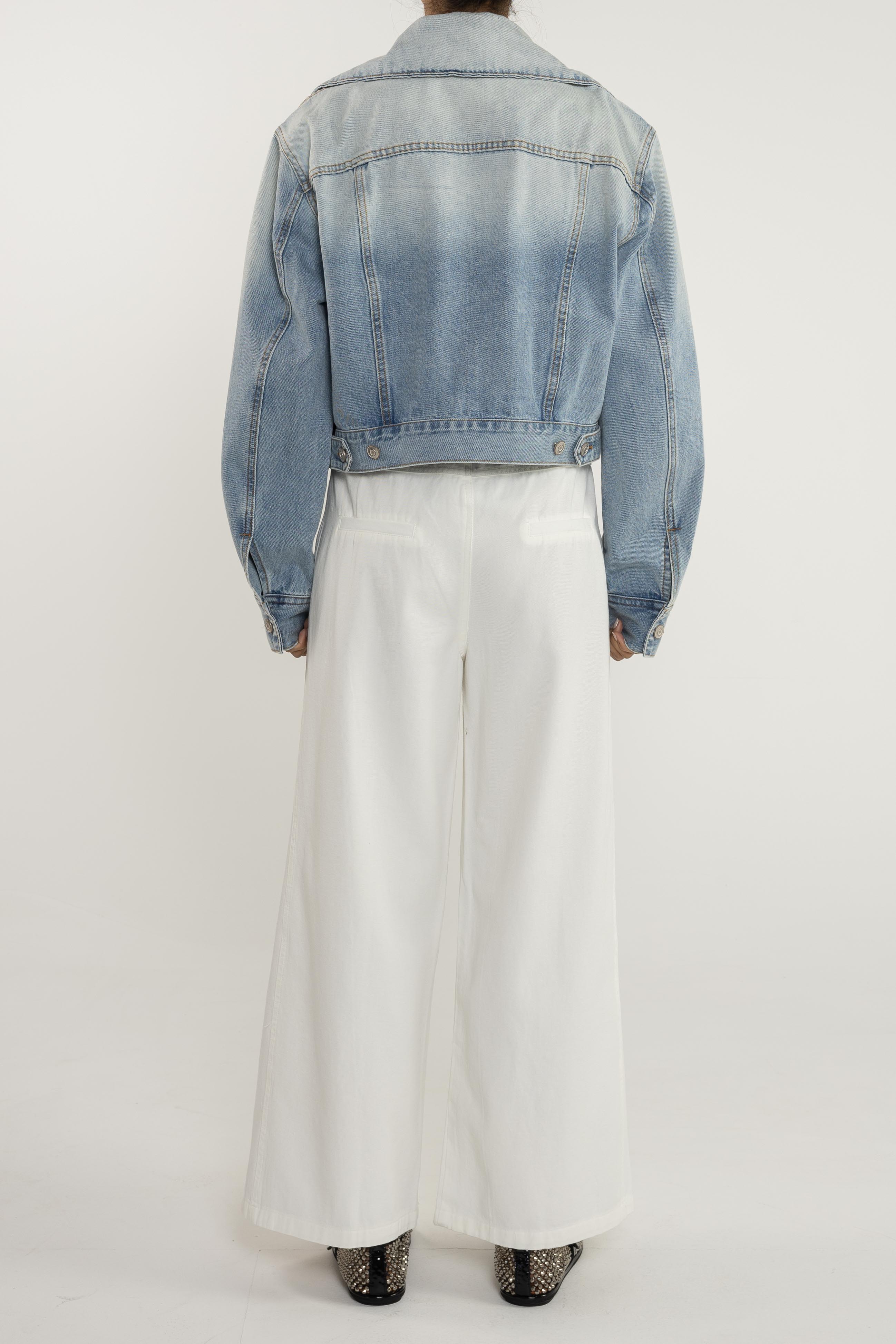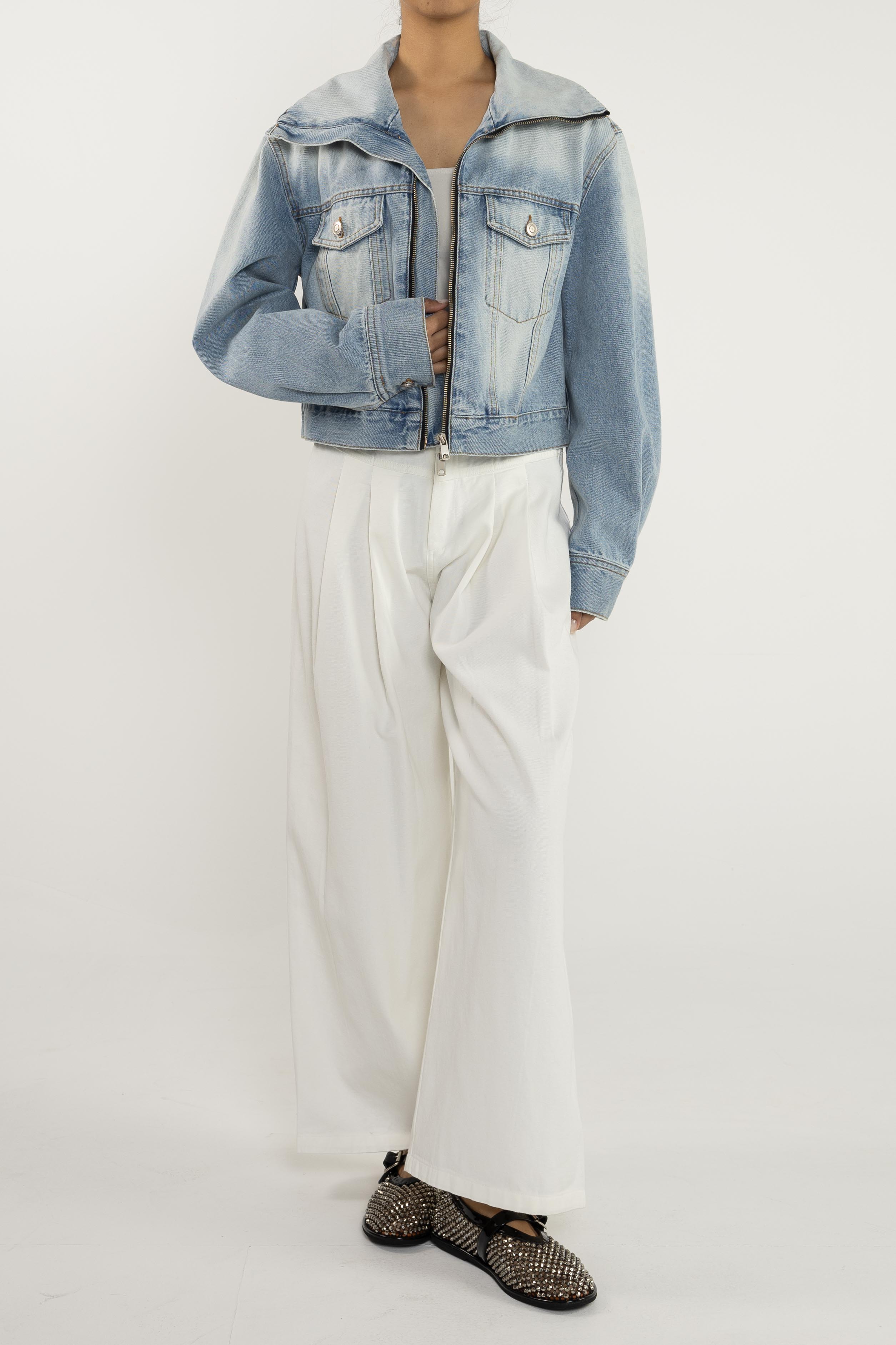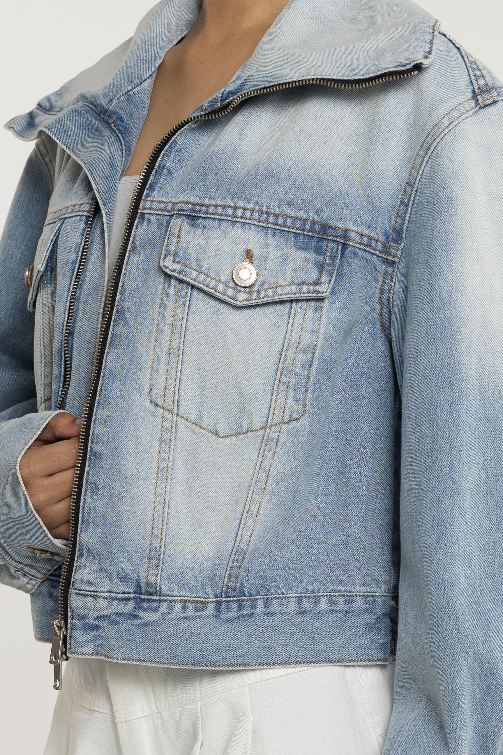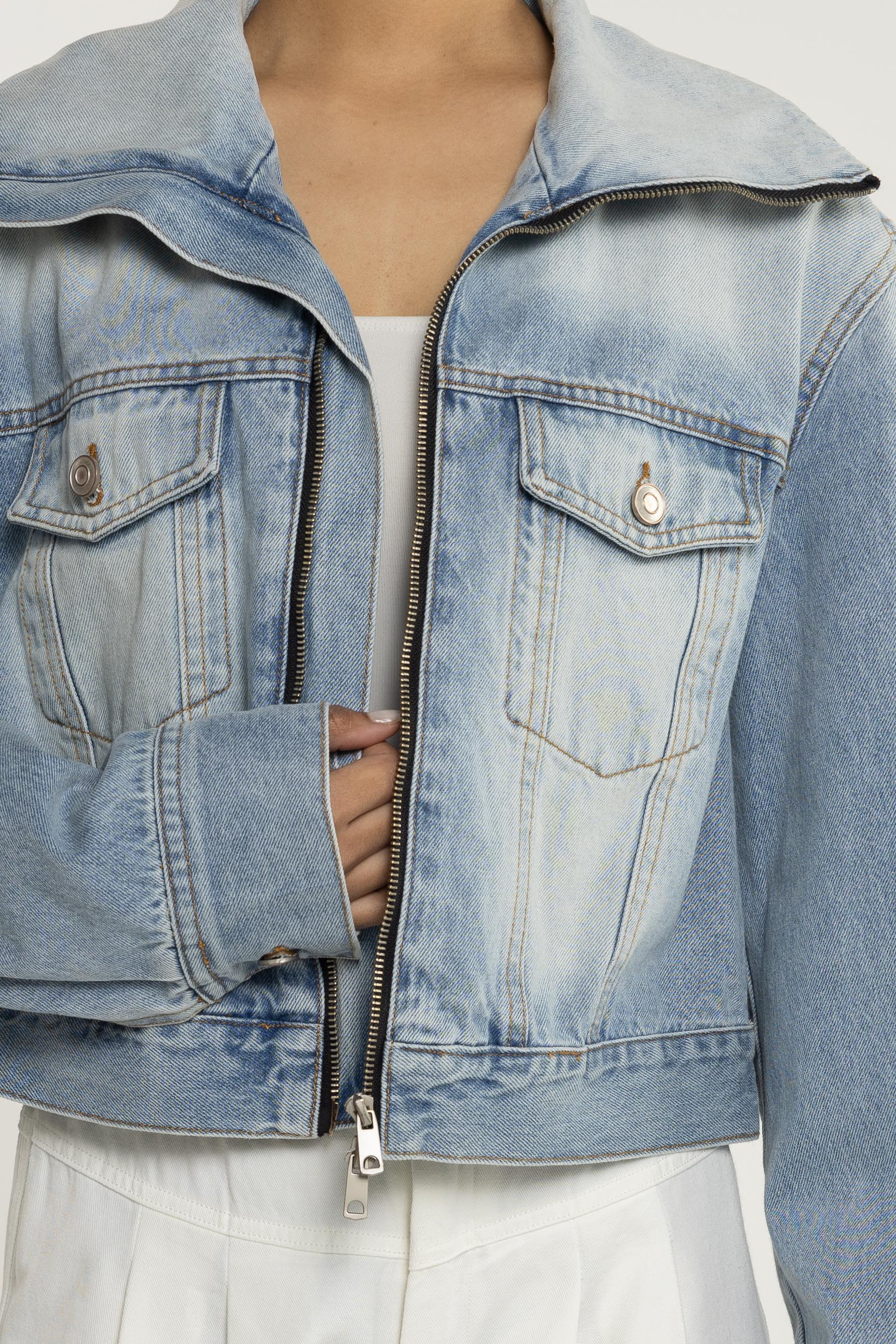 Denim washed jacket. Zip closure front. Two front flap pockets.