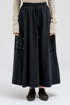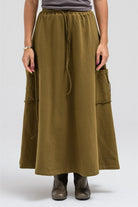 A relaxed-style skirt designed with an elastic waistband and adjustable drawstrings for a comfortable fit. It features functional side pockets that add a casual utility touch, making it both stylish and practical for everyday wear.