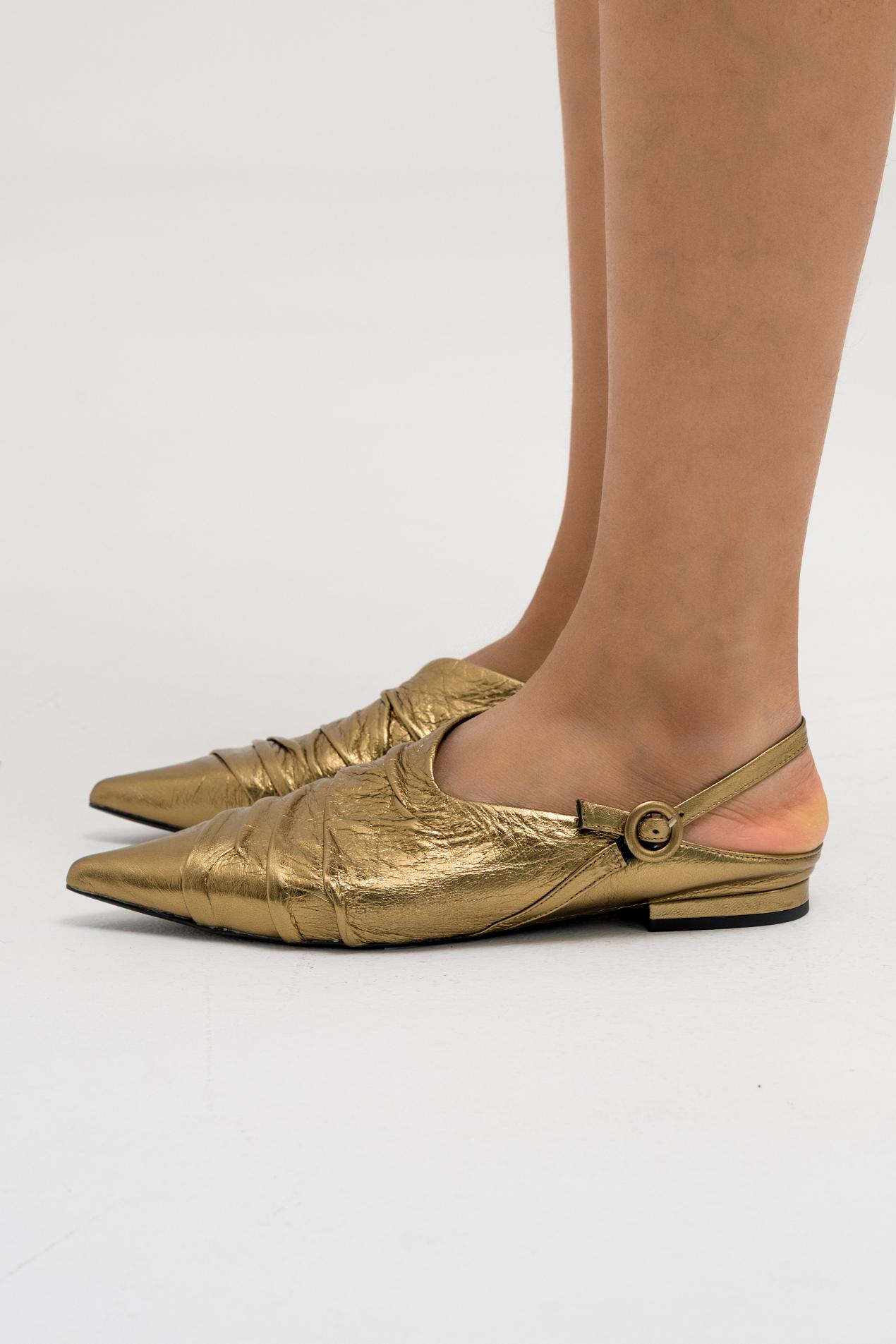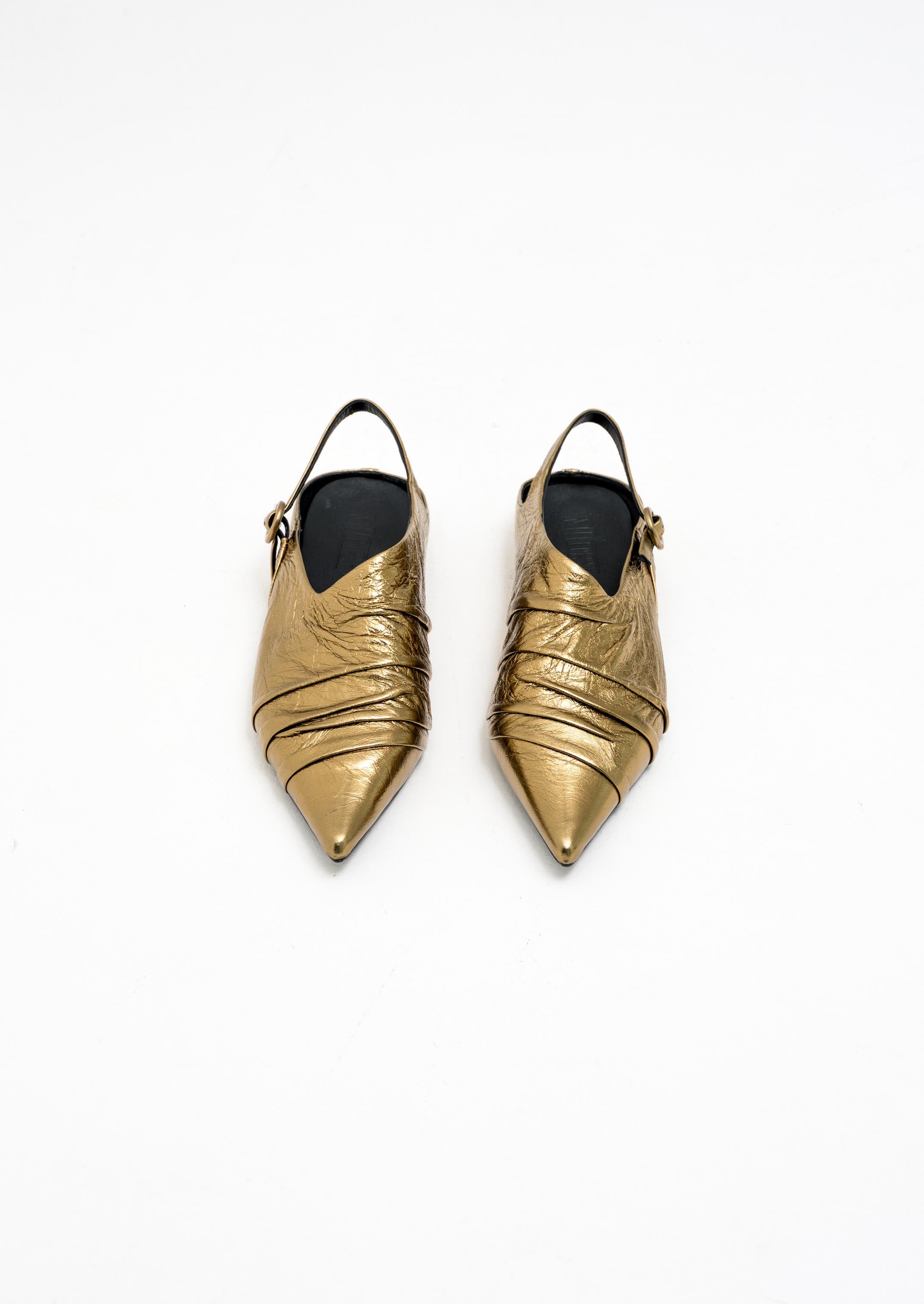 Pointed-toe flats featuring a striking metallic finish. Designed with ruched detailing across the upper for a textured look. Adjustable slingback strap with a buckle for a secure fit and slight .