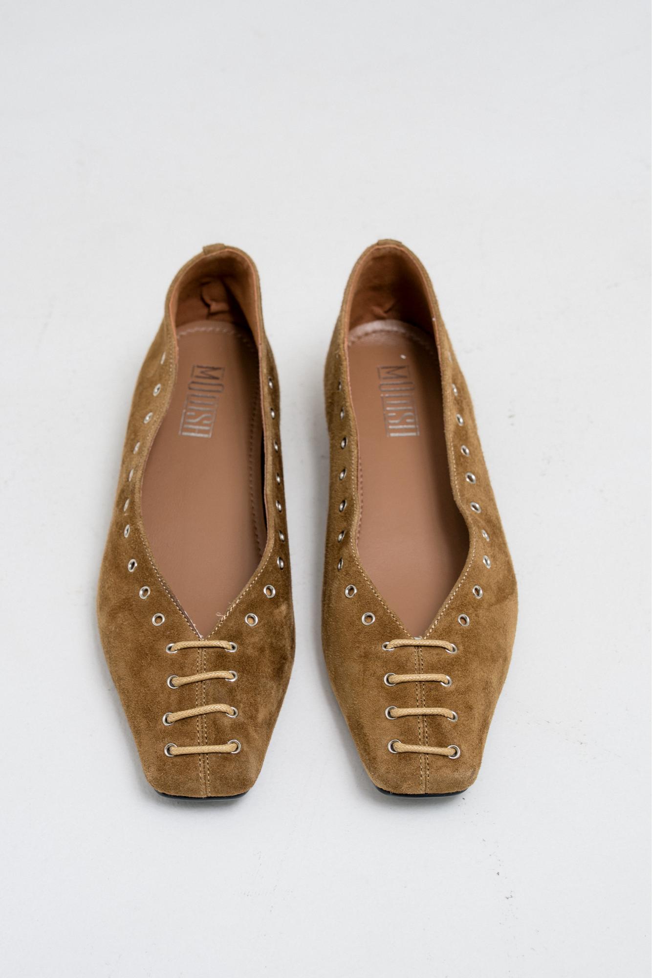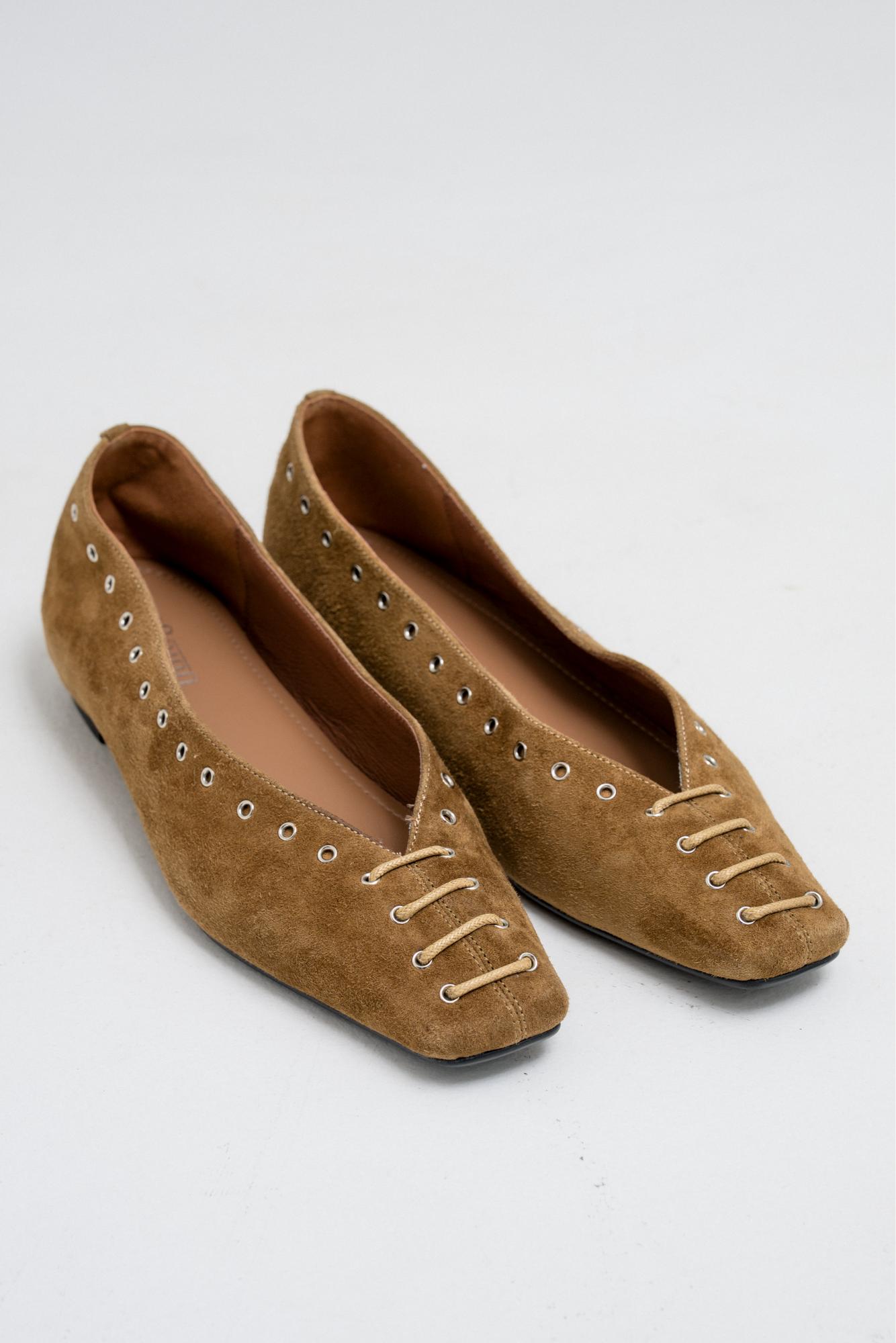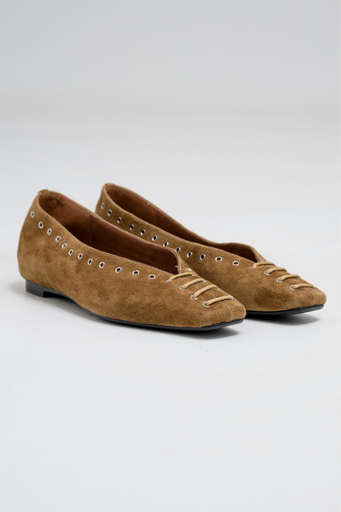 SUEDE METAL EYELET POINTED FLATS Crafted from smooth suede, these flats feature a sleek pointed toe design and are detailed with metallic eyelet accents along the front. The metal hole design adds a modern twist to this classic silhouette.