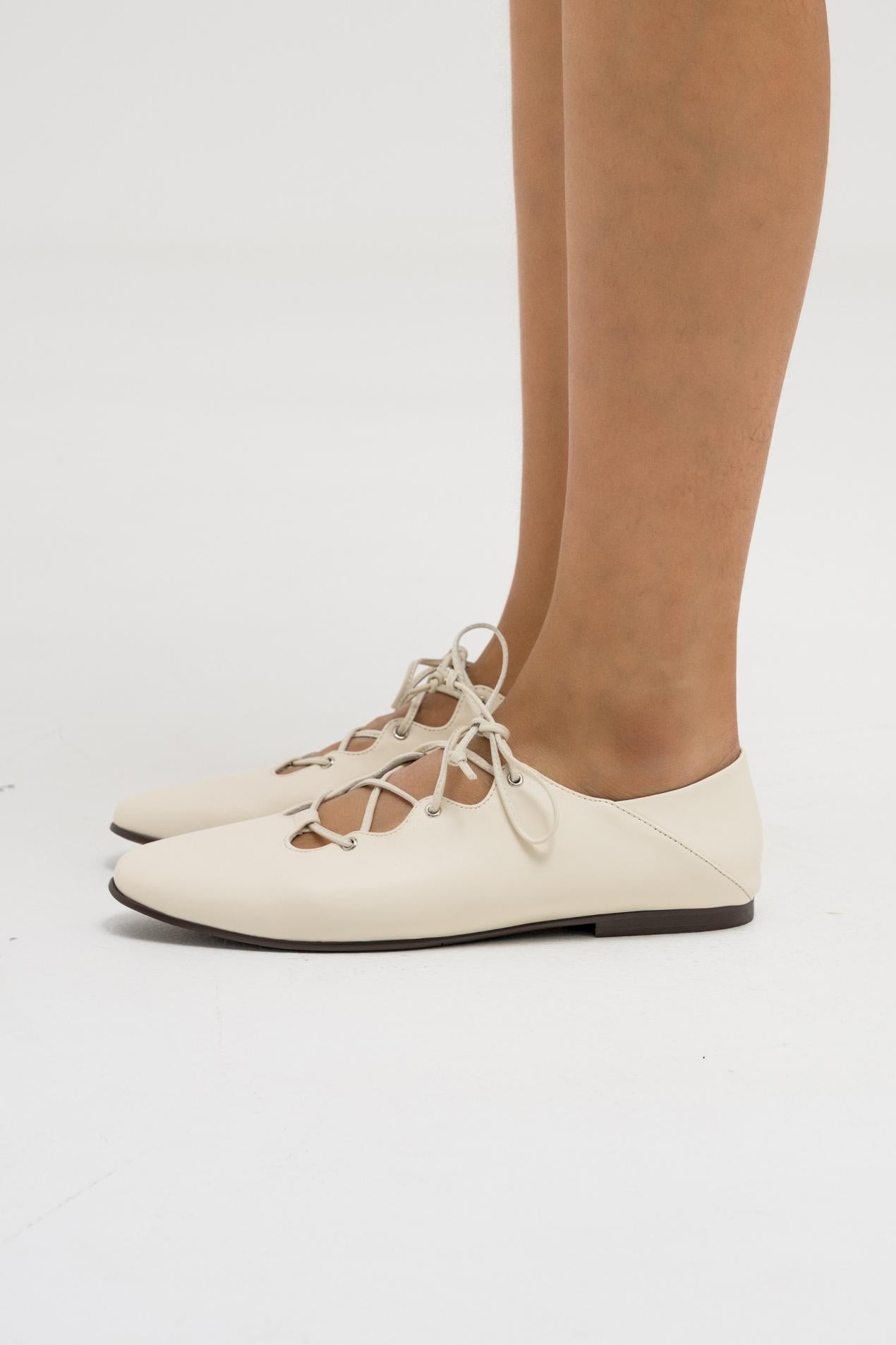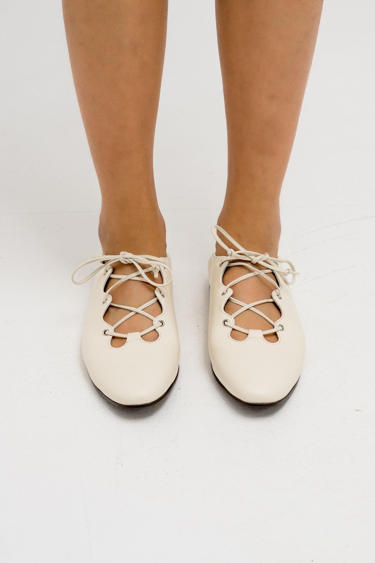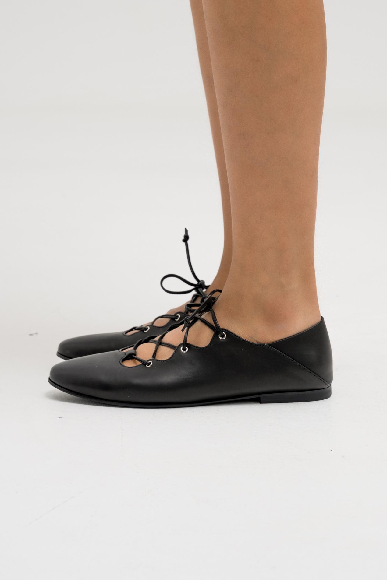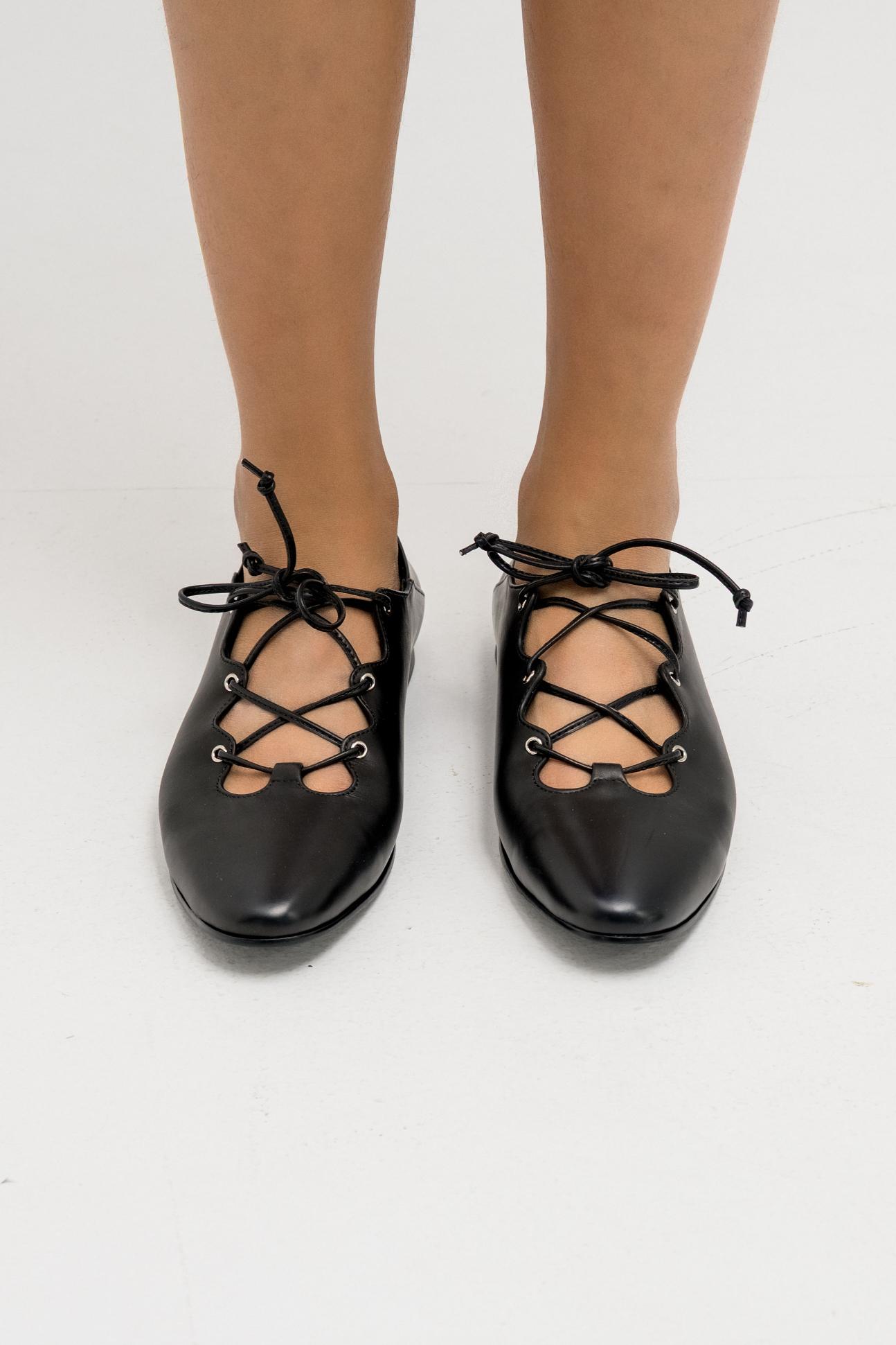 These ballet-style flats feature a soft, rounded pointed toe. What makes them stand out is the lace-up string design—crisscrossed through side cut-outs and tied at the front.