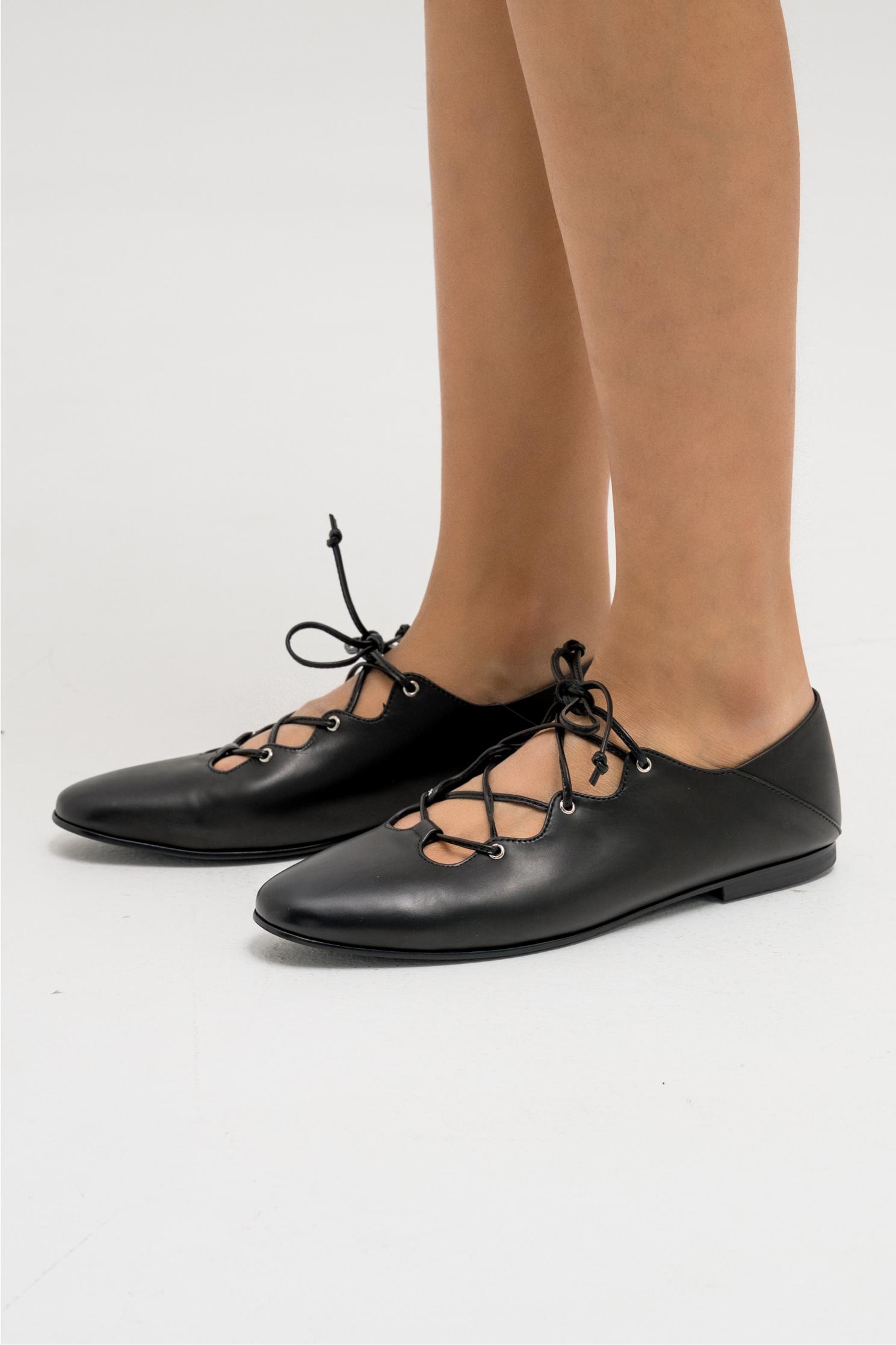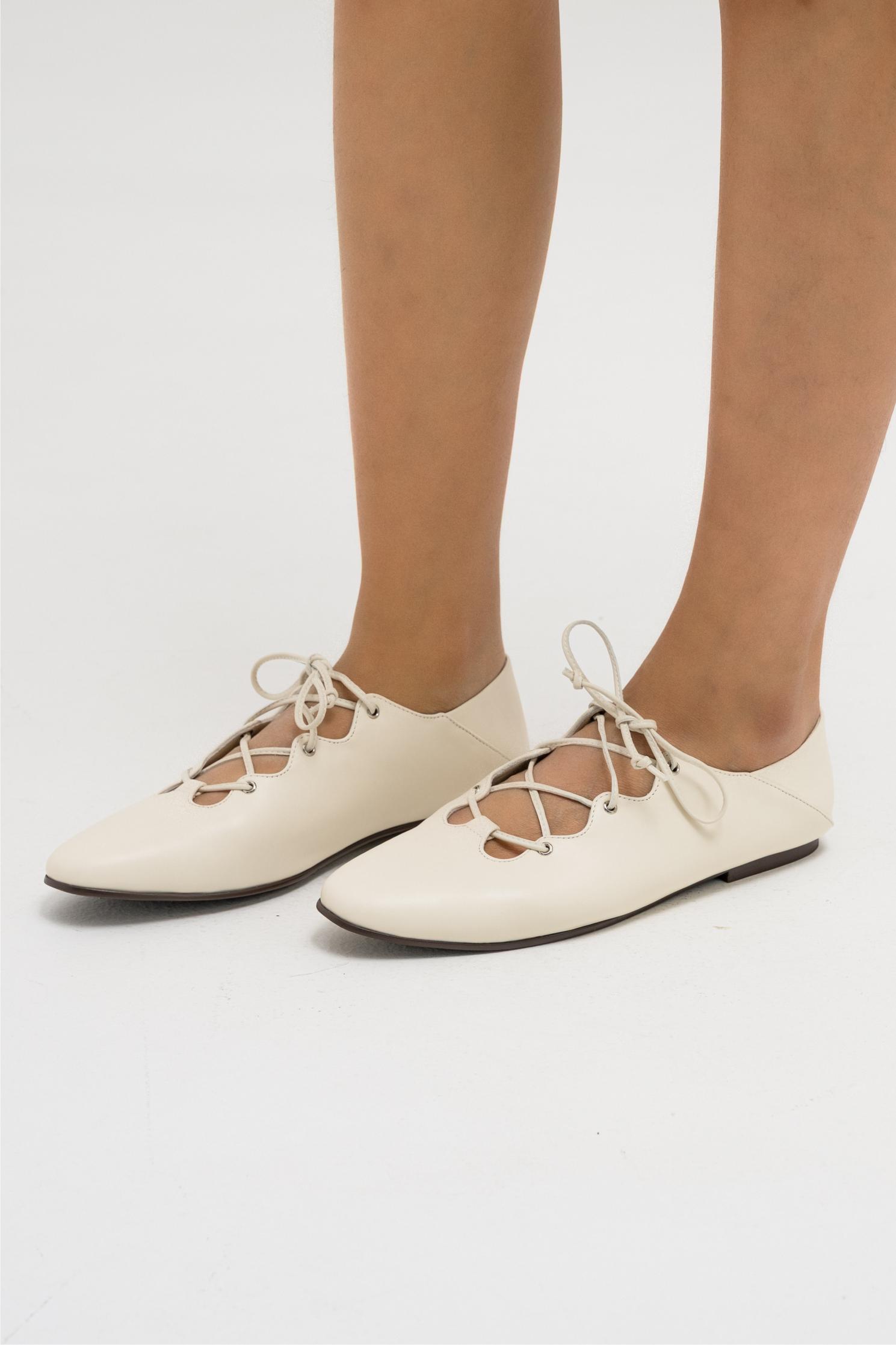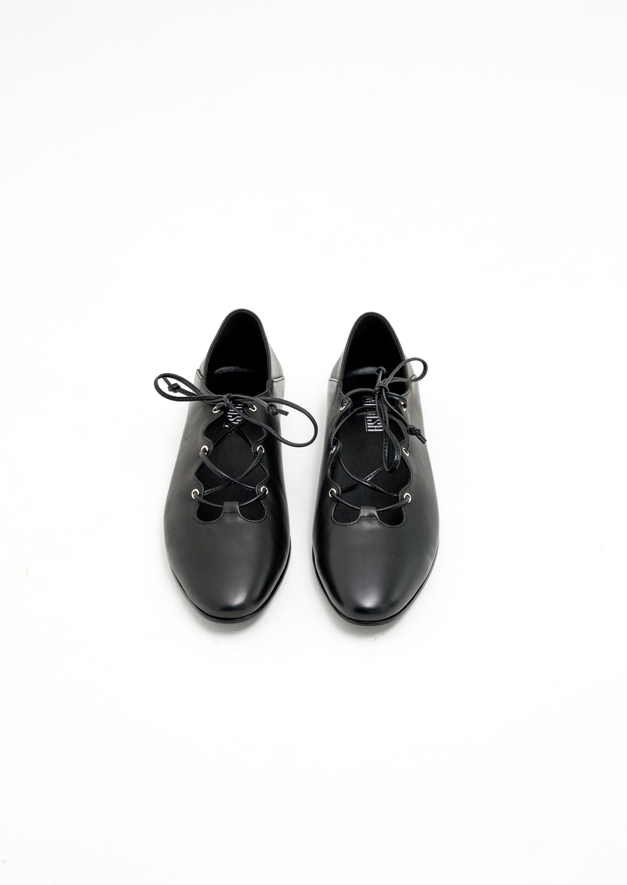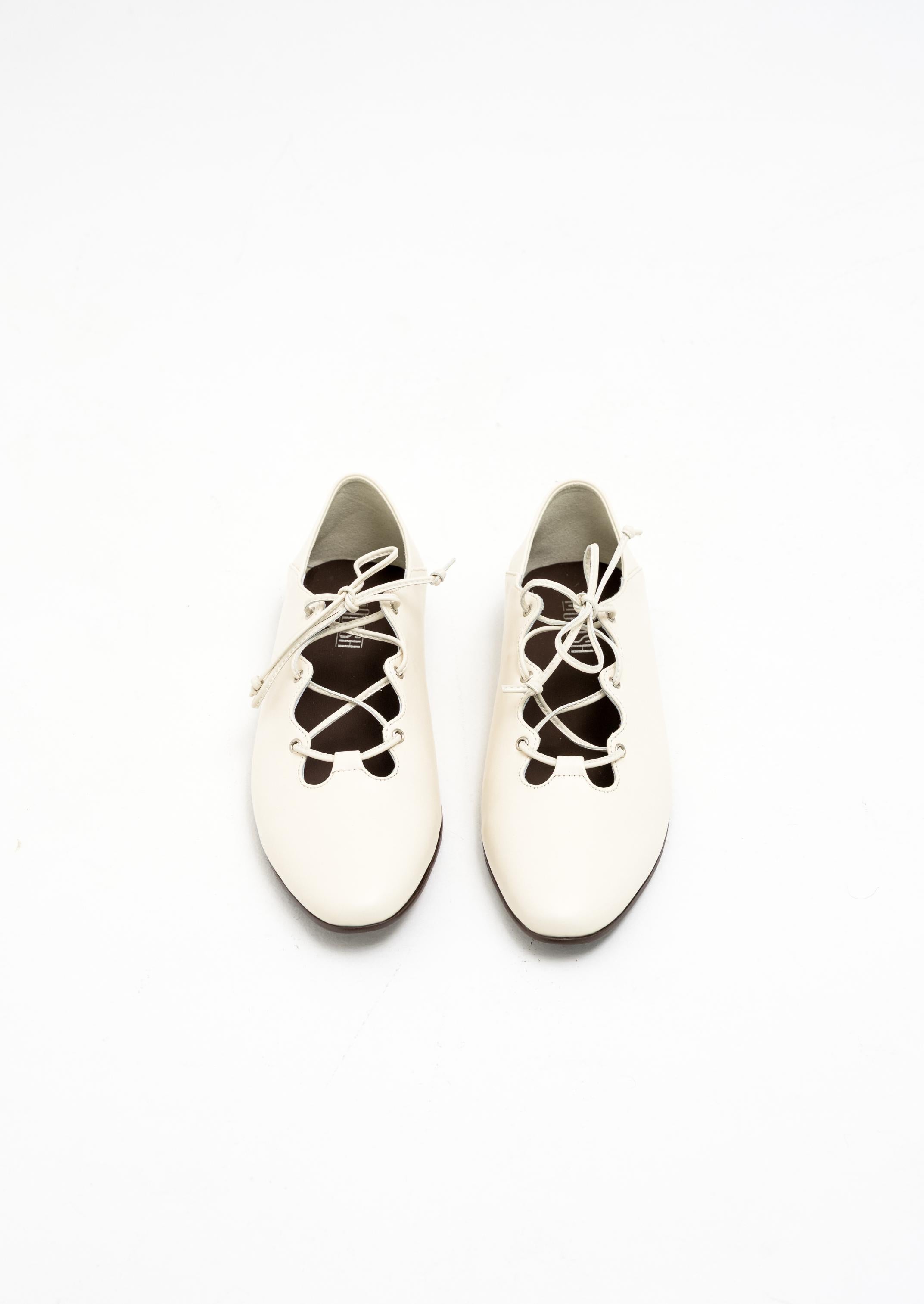 These ballet-style flats feature a soft, rounded pointed toe. What makes them stand out is the lace-up string design—crisscrossed through side cut-outs and tied at the front.
