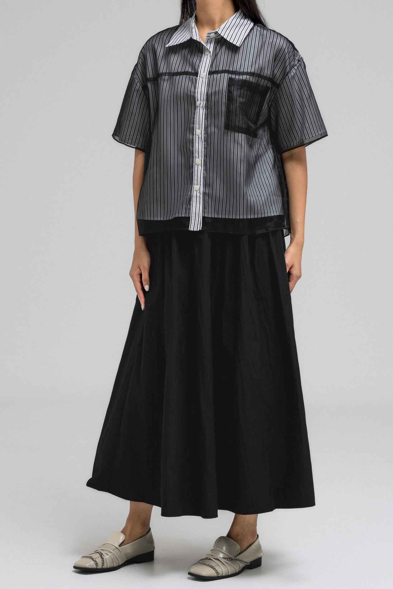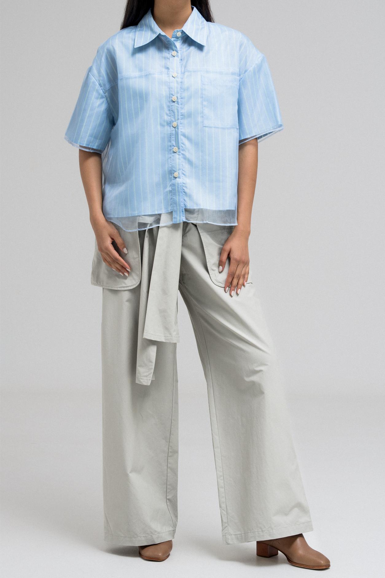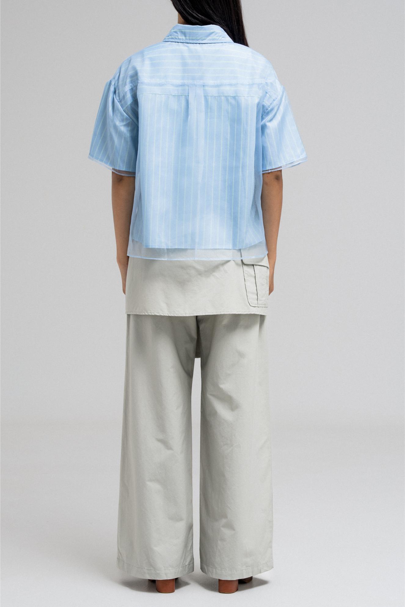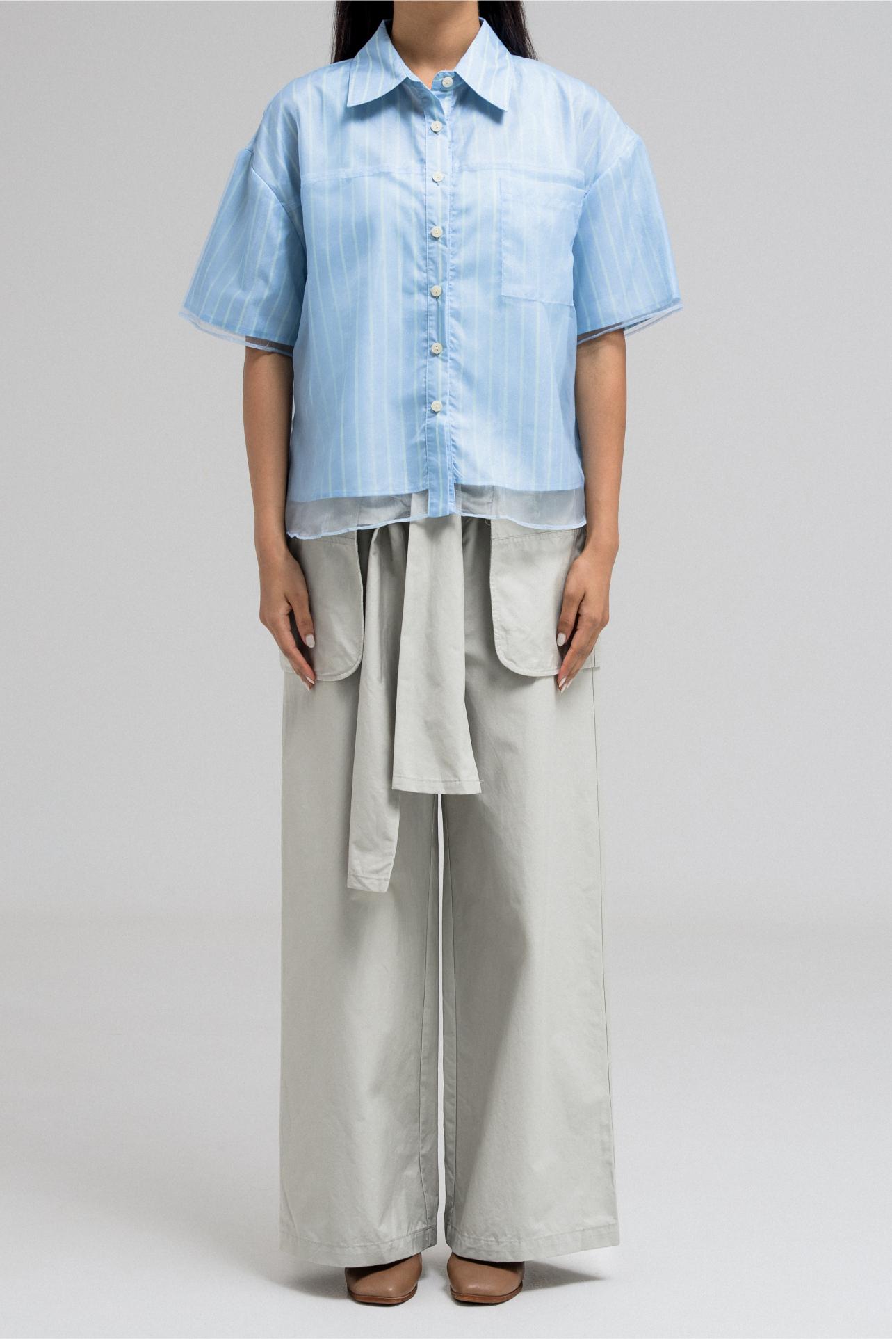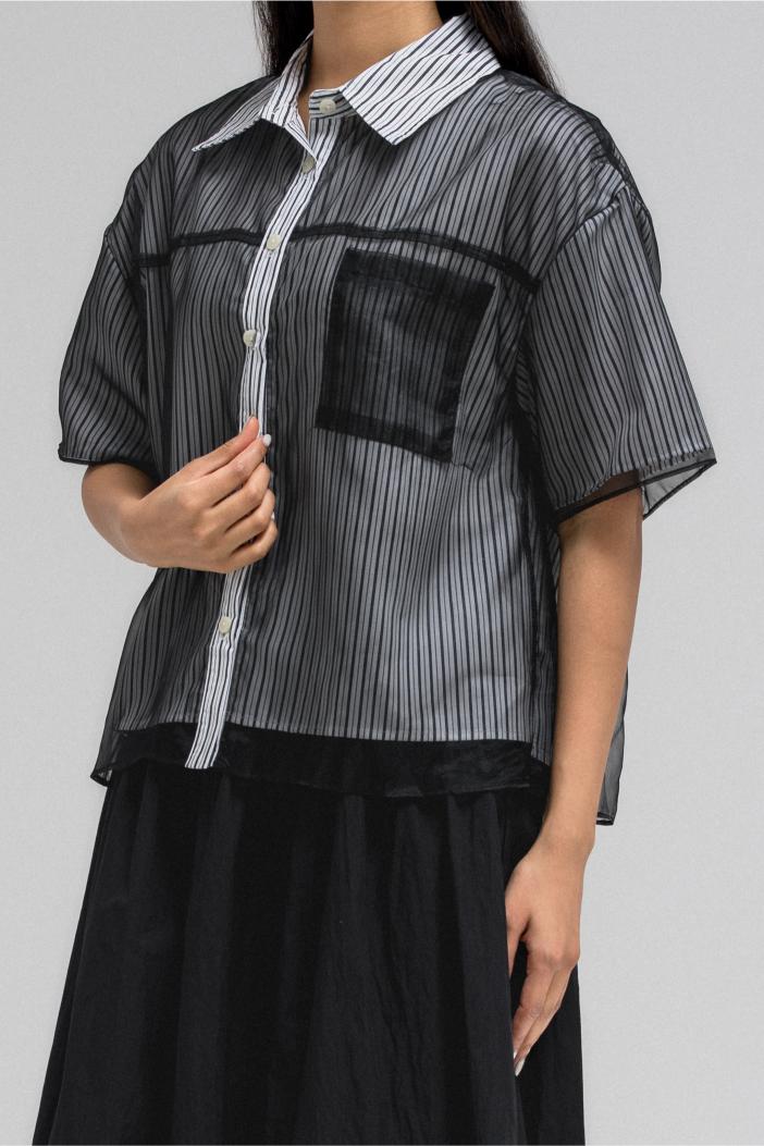 This stylish short-sleeve top features a layered design with a sheer, transparent outer layer that adds a light and airy feel. The inner layer showcases a vertical stripe pattern, giving the top a classic touch. It has a front button closure and a structured collar, while the sheer overlay includes a single chest pocket, subtly blending function with fashion. A perfect mix of casual and chic.