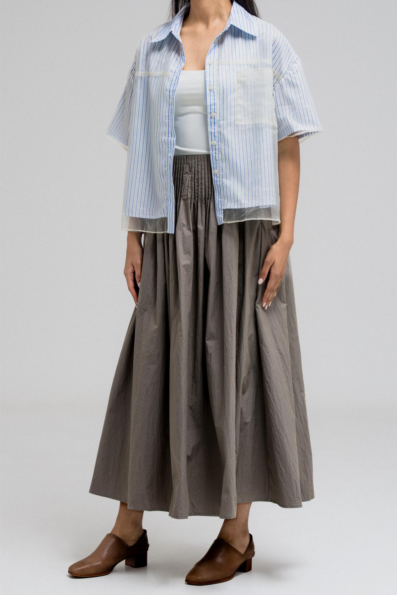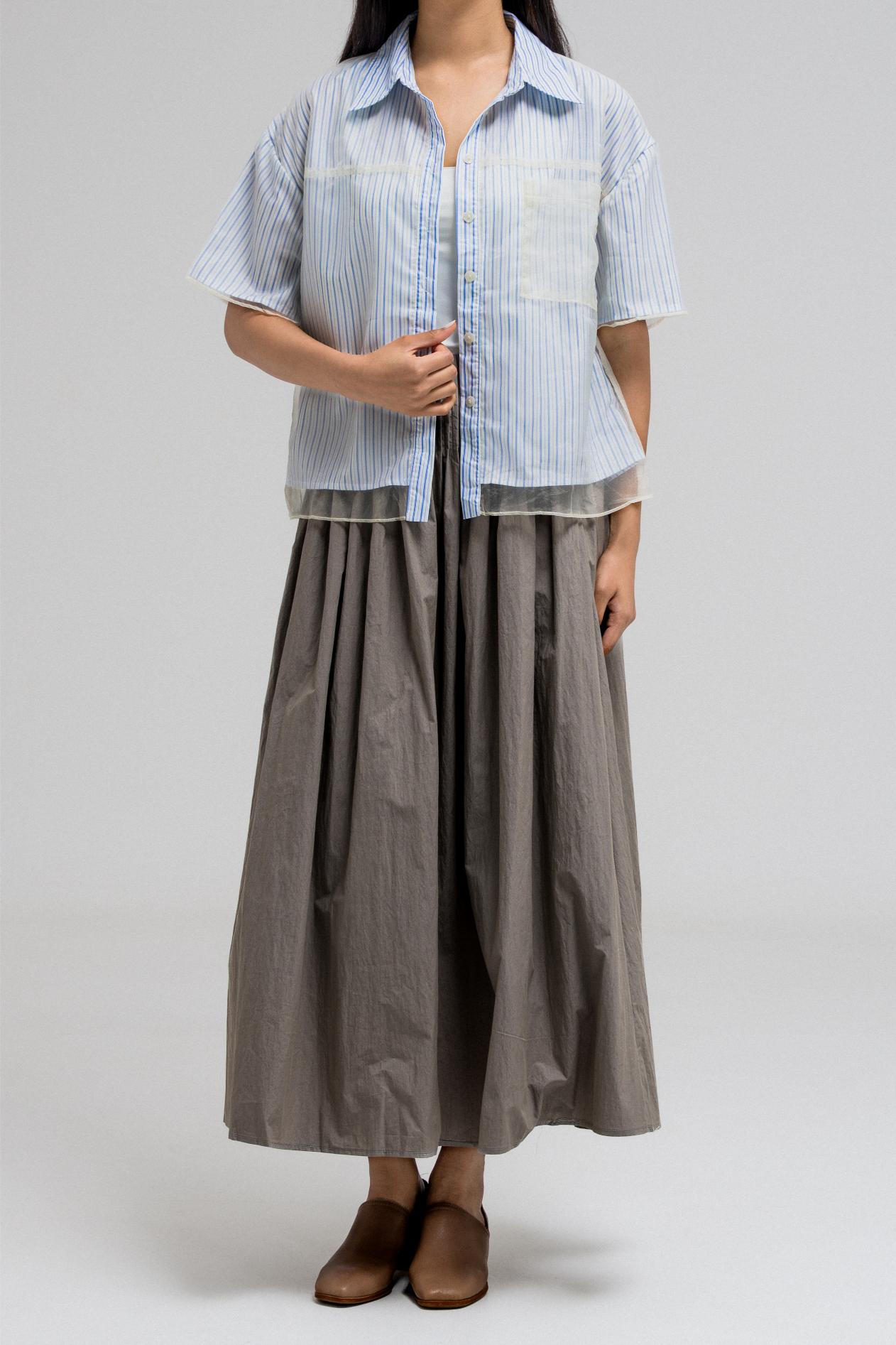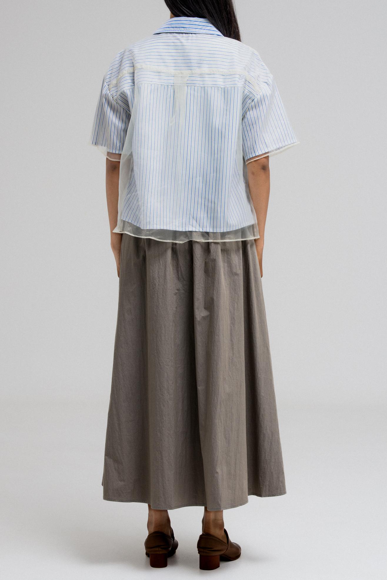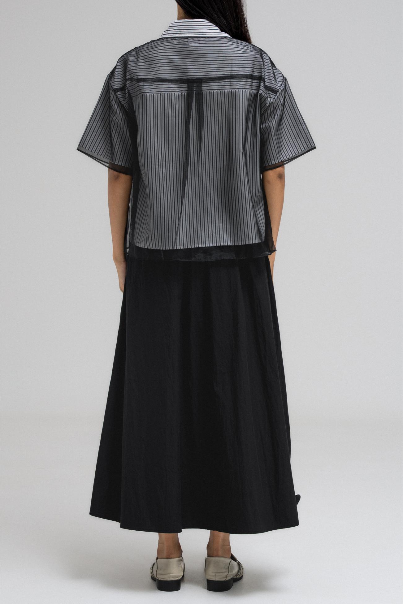 This stylish short-sleeve top features a layered design with a sheer, transparent outer layer that adds a light and airy feel. The inner layer showcases a vertical stripe pattern, giving the top a classic touch. It has a front button closure and a structured collar, while the sheer overlay includes a single chest pocket, subtly blending function with fashion. A perfect mix of casual and chic.