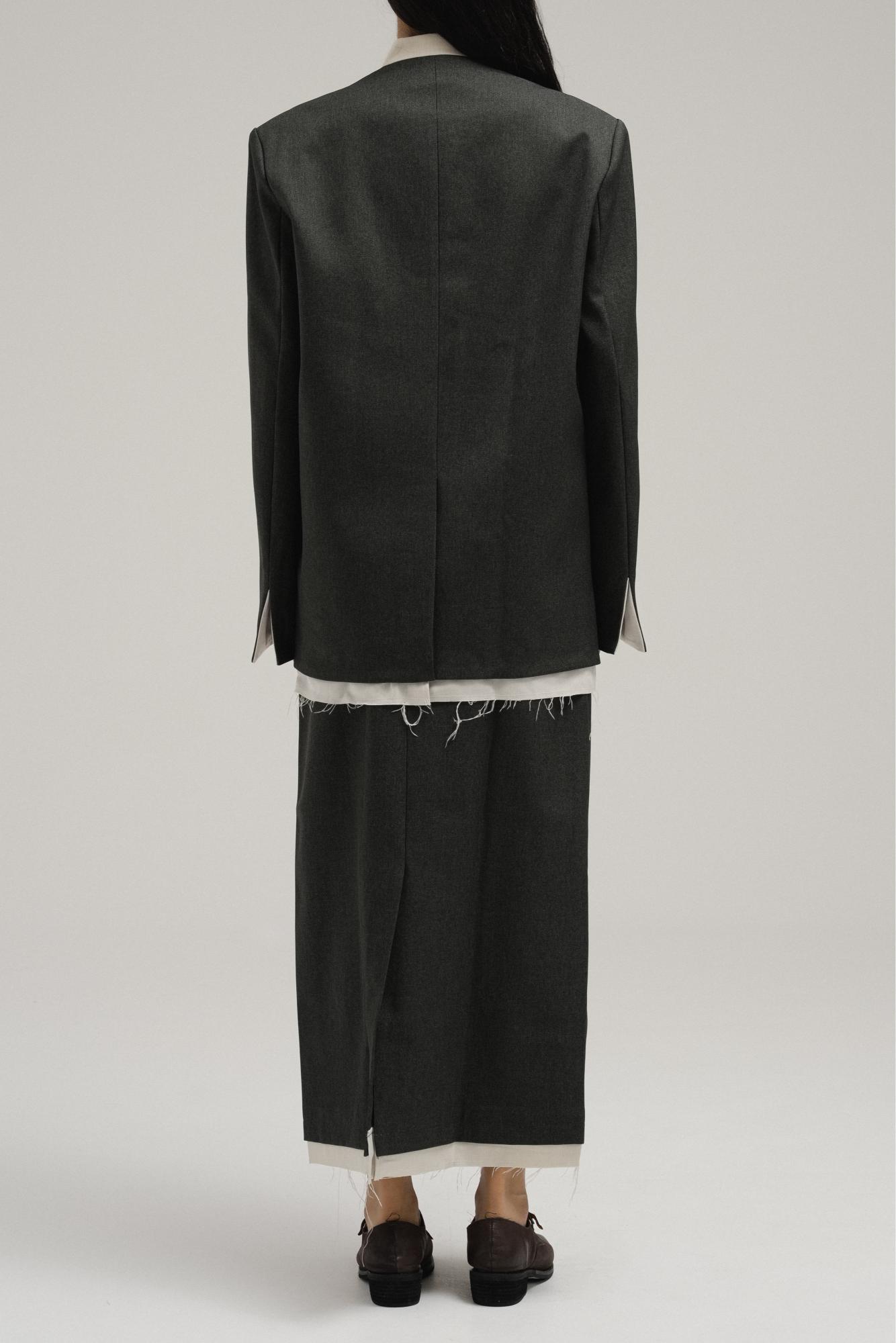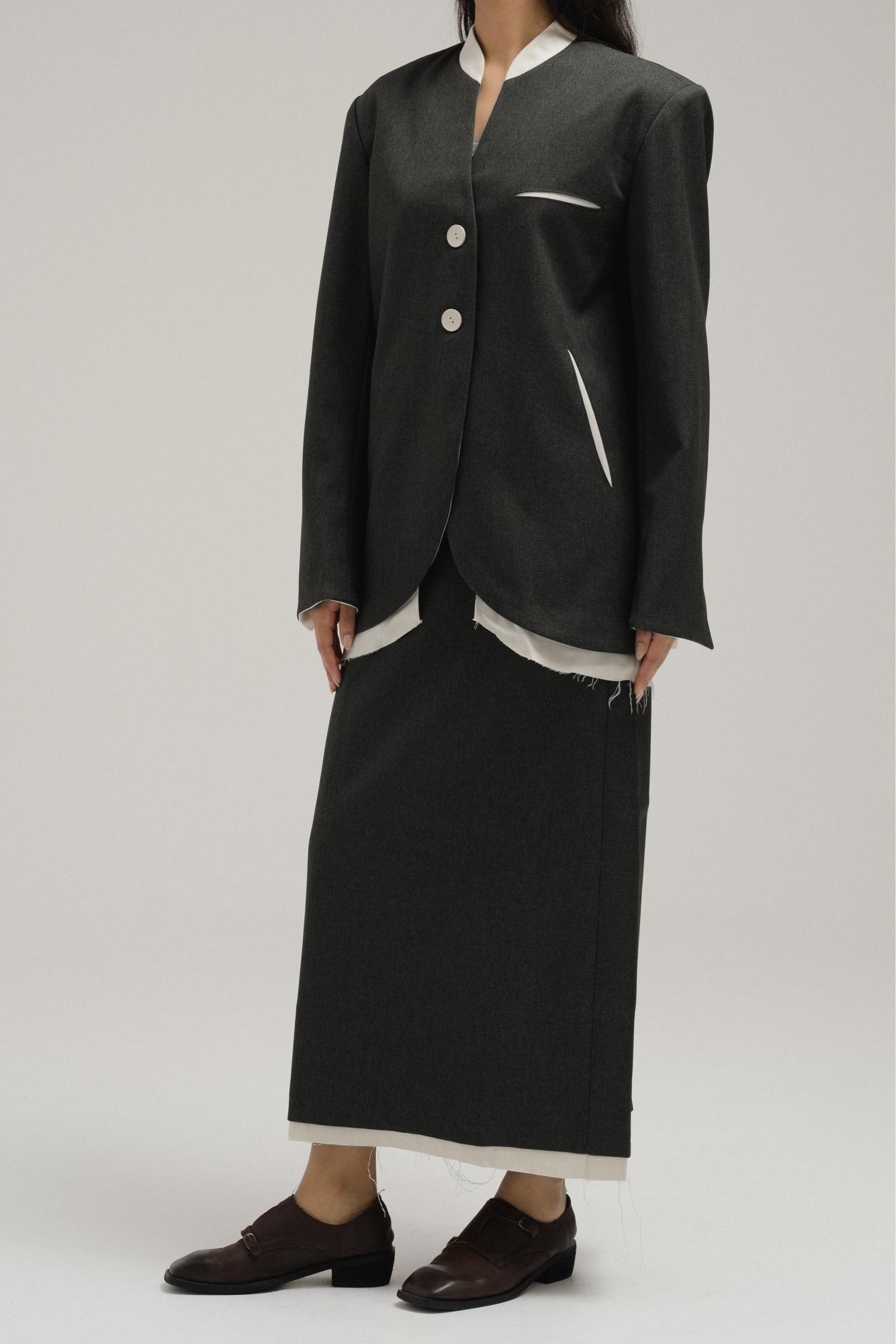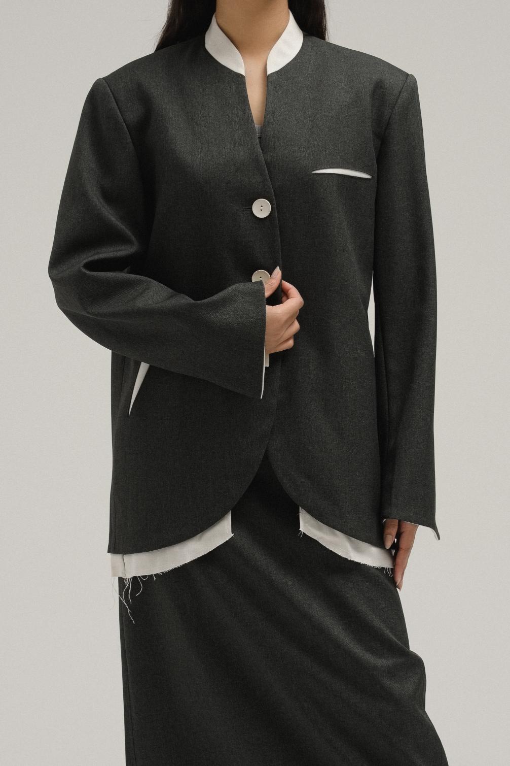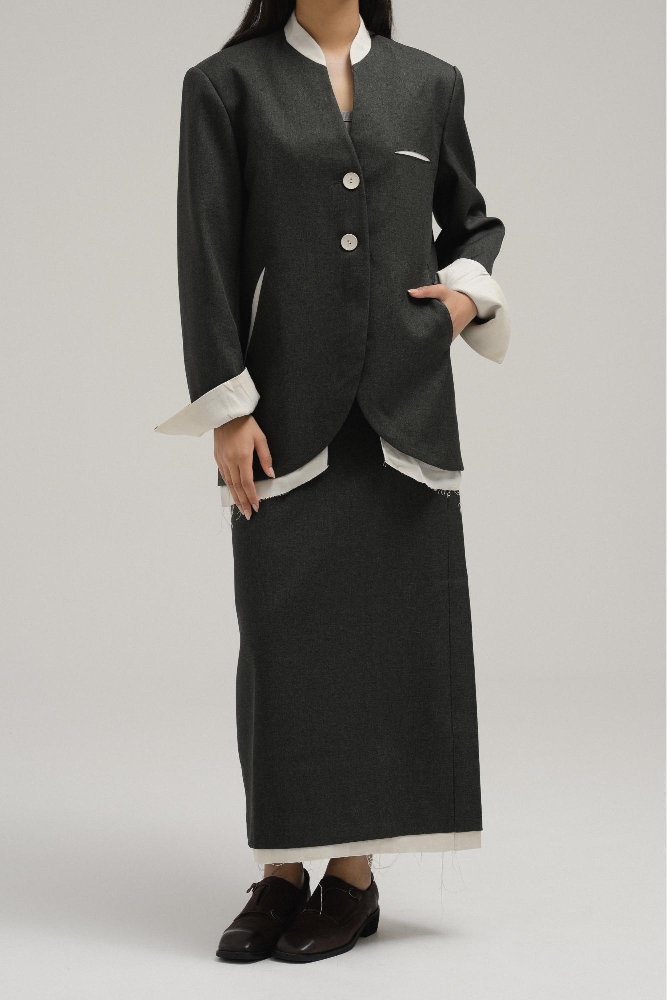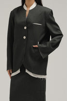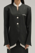 This blazer stands out with its refined design and minimalist details. It features a clean round collarless neckline for a modern, structured look, front button closure, and sharp welt pockets. The hem and pocket edges are finished in a contrast fabric, adding a sleek, tailored accent. Designed to be paired with its matching skirt.
