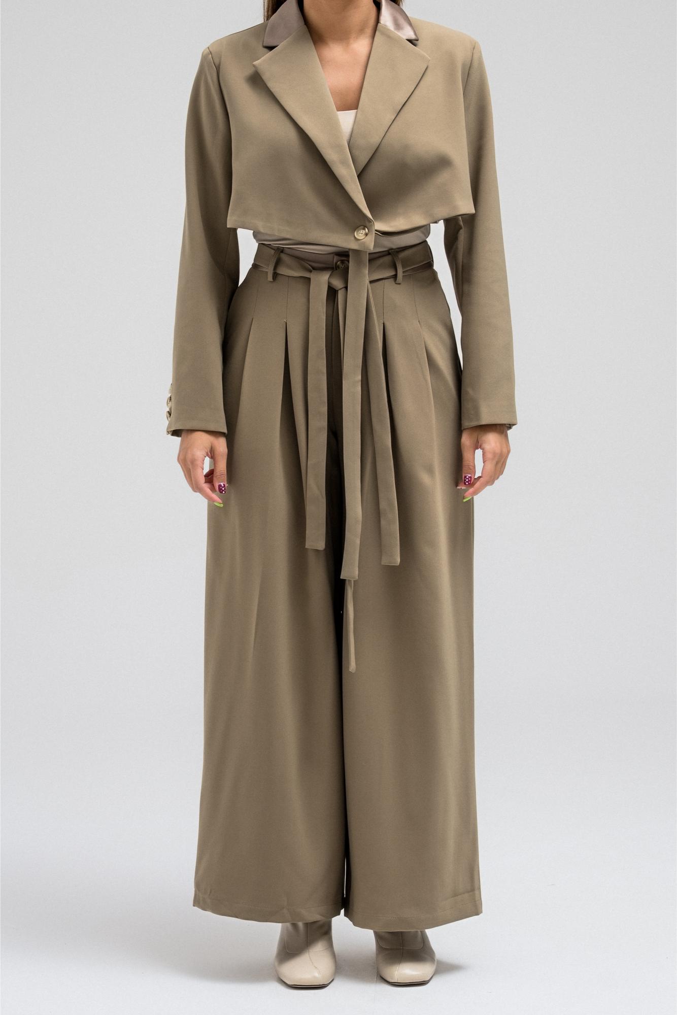 Tailored cropped blazer featuring a sharp notched lapel collar and front button closure. Designed with an attached belt to cinch the waist for a structured silhouette. Pairs perfectly with the matching pants for a coordinated look.