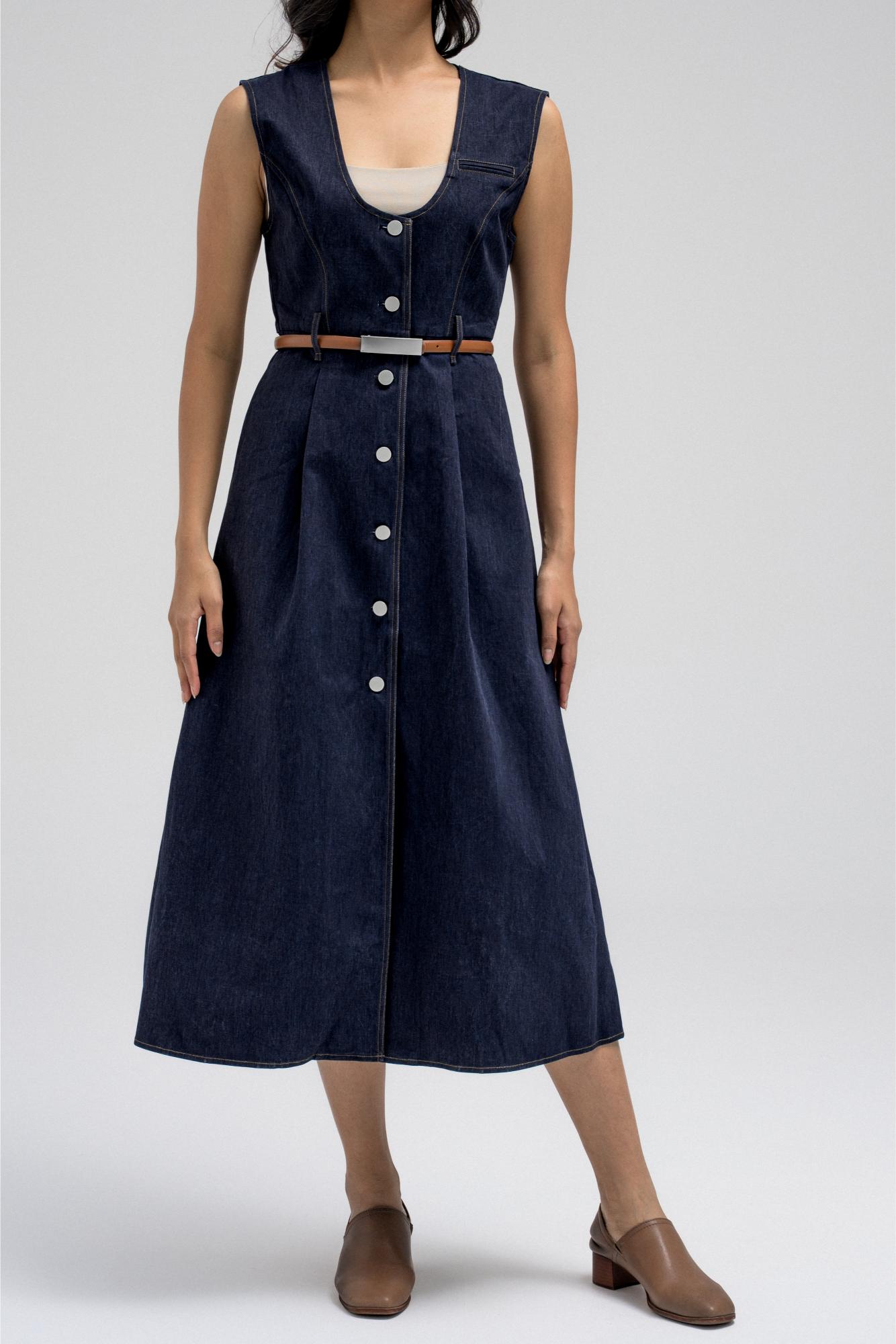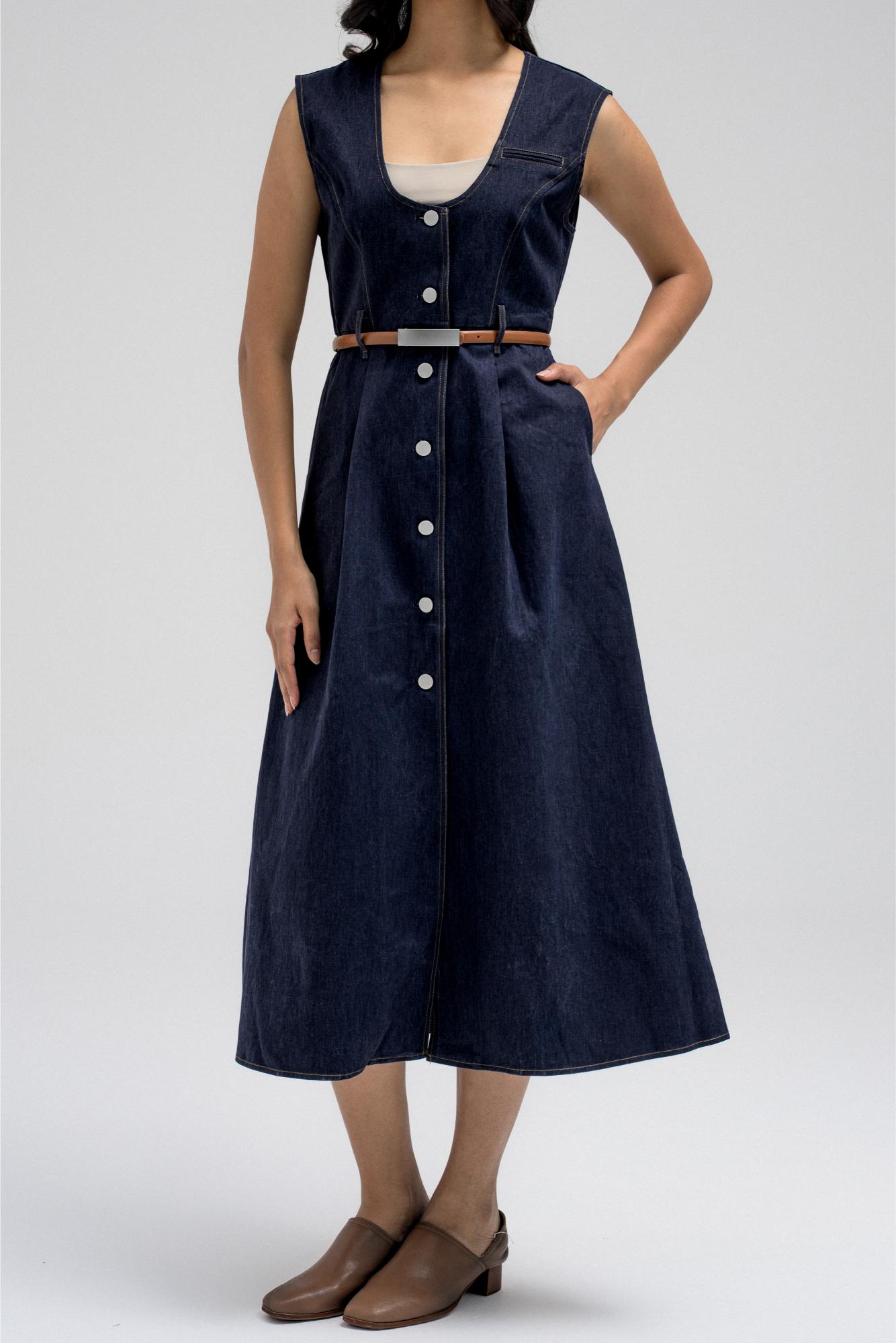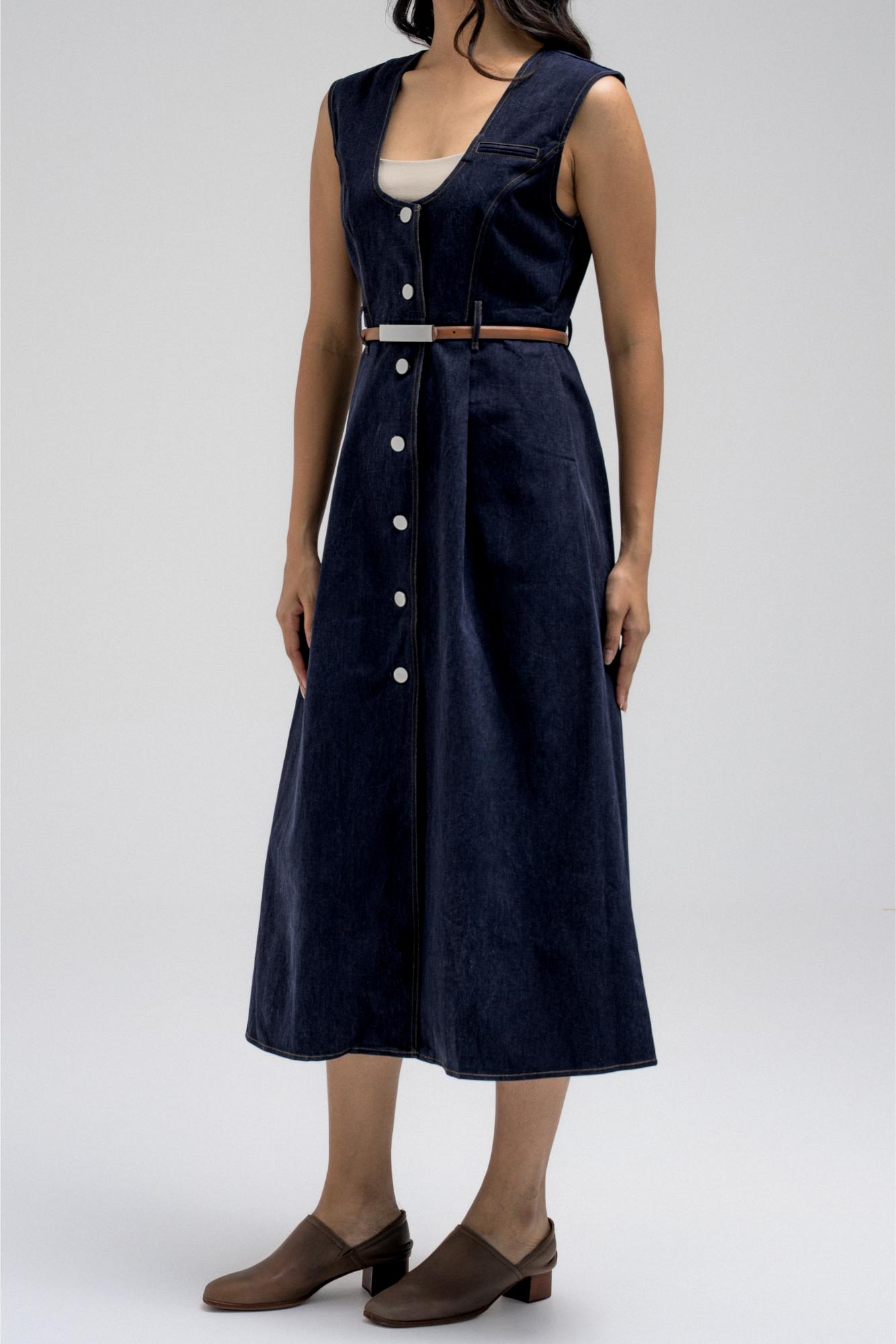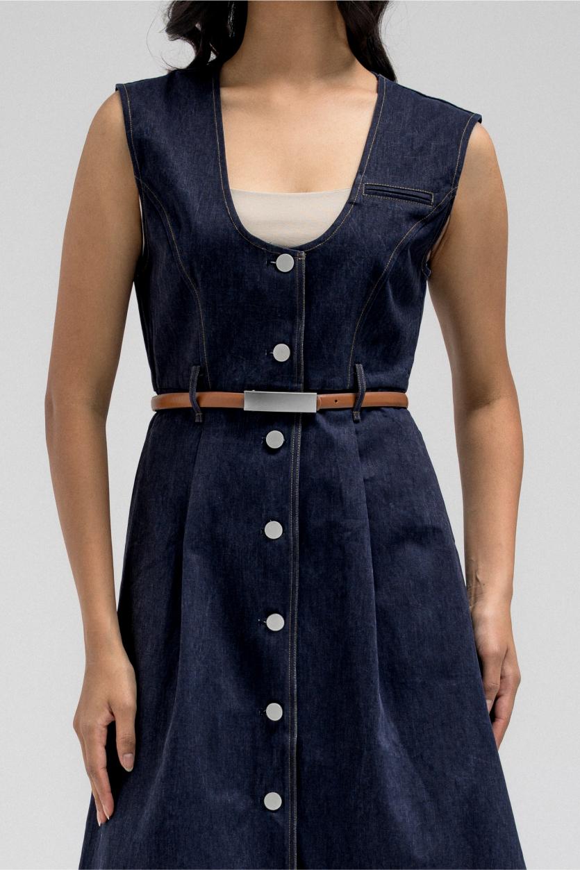 Sleeveless denim dress with a full front button closure and a front slit for ease of movement. Designed with a matching belt buckle to cinch the waist and elevate the silhouette. A versatile piece that can be styled casually or dressed up.