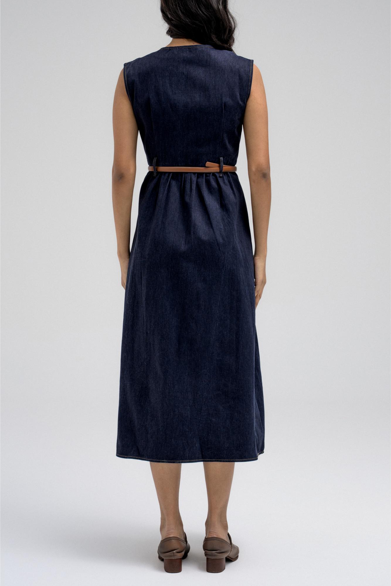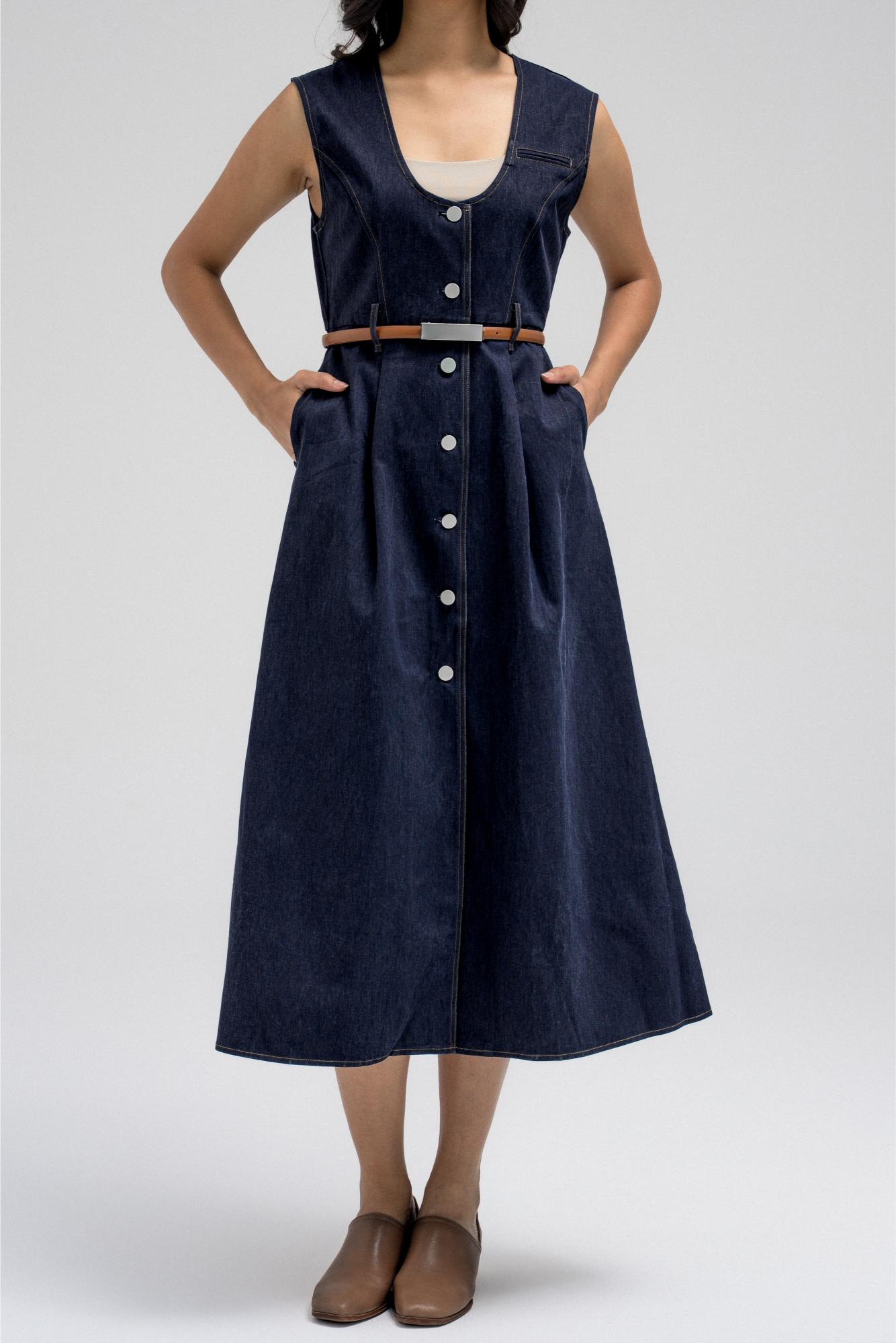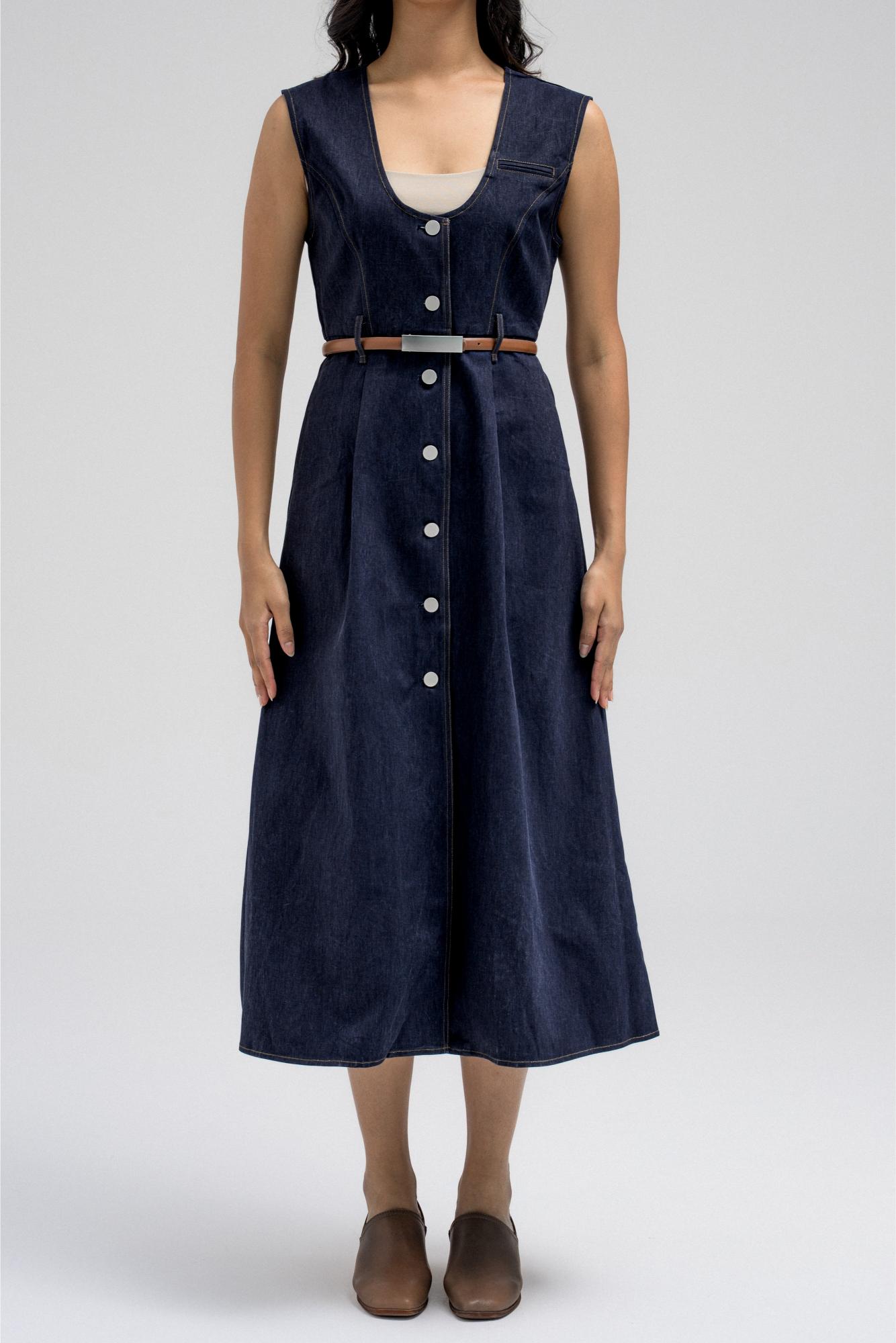 Sleeveless denim dress with a full front button closure and a front slit for ease of movement. Designed with a matching belt buckle to cinch the waist and elevate the silhouette. A versatile piece that can be styled casually or dressed up.