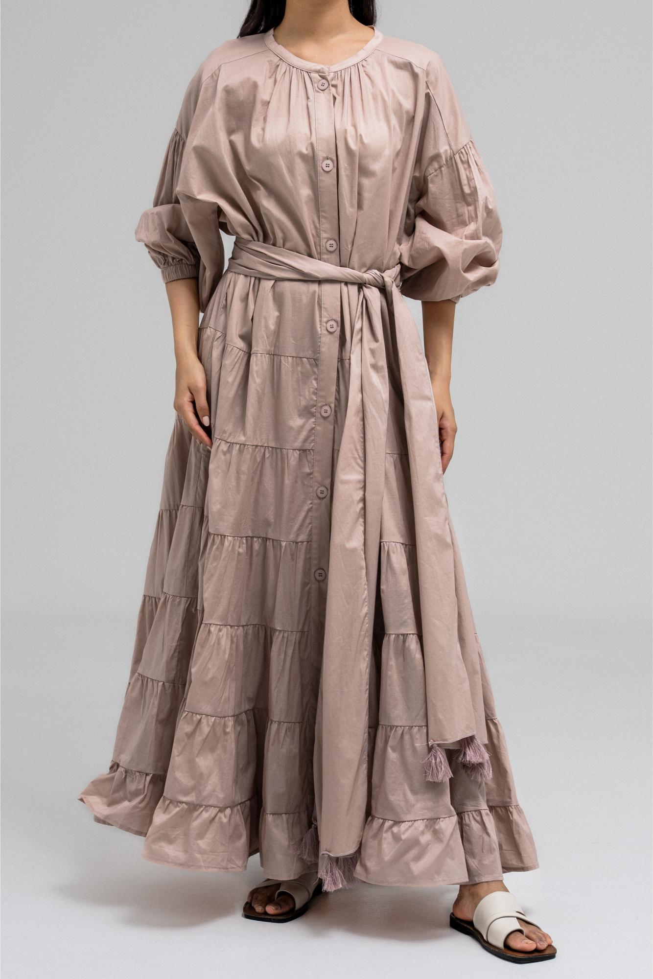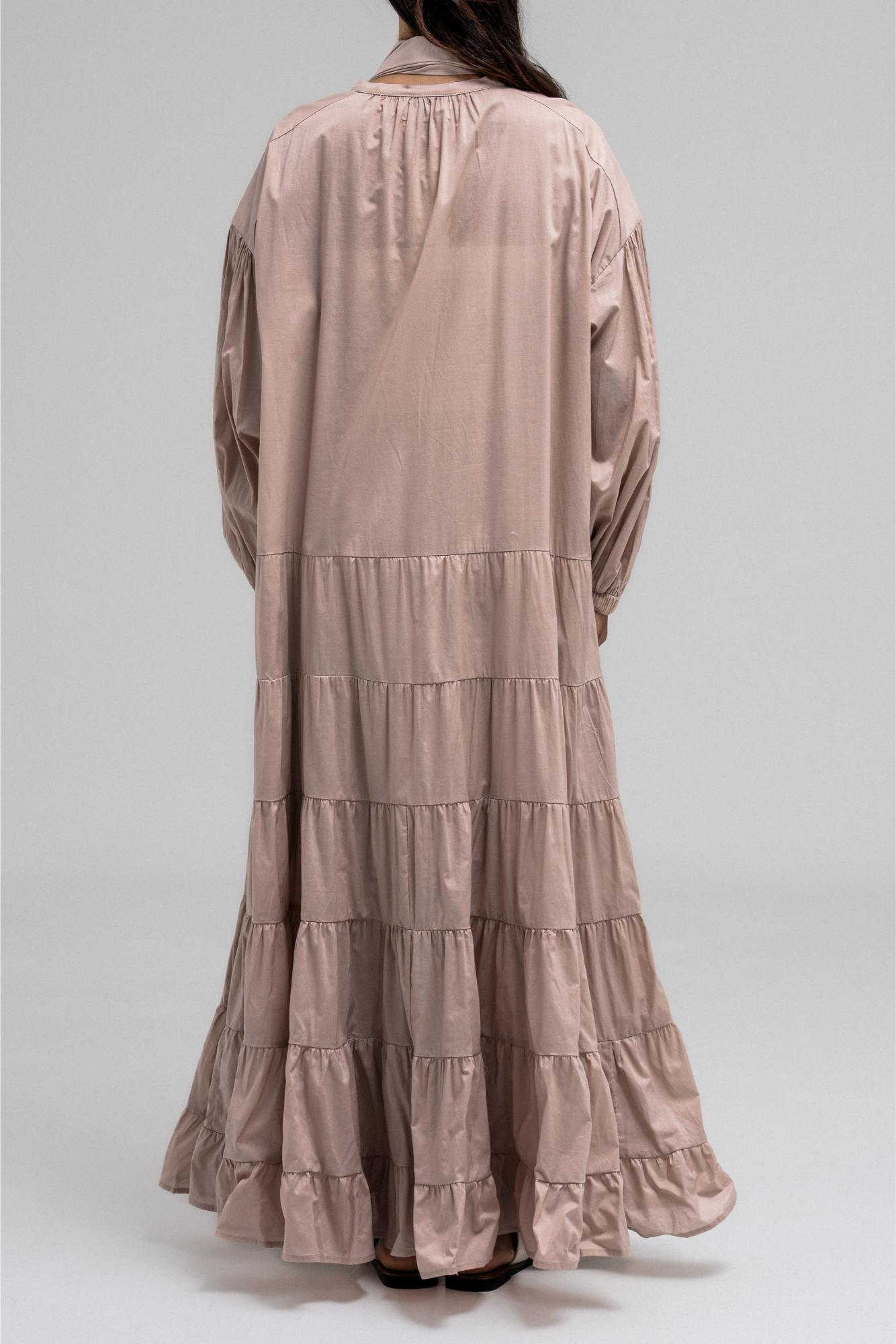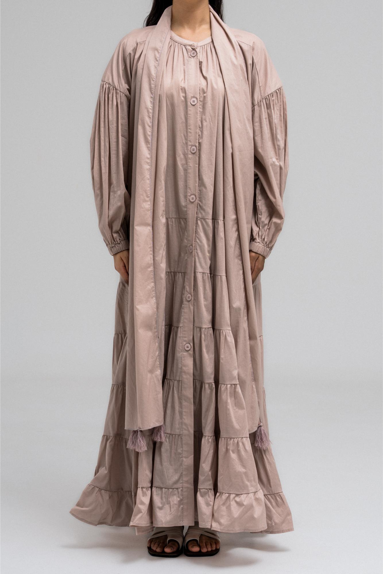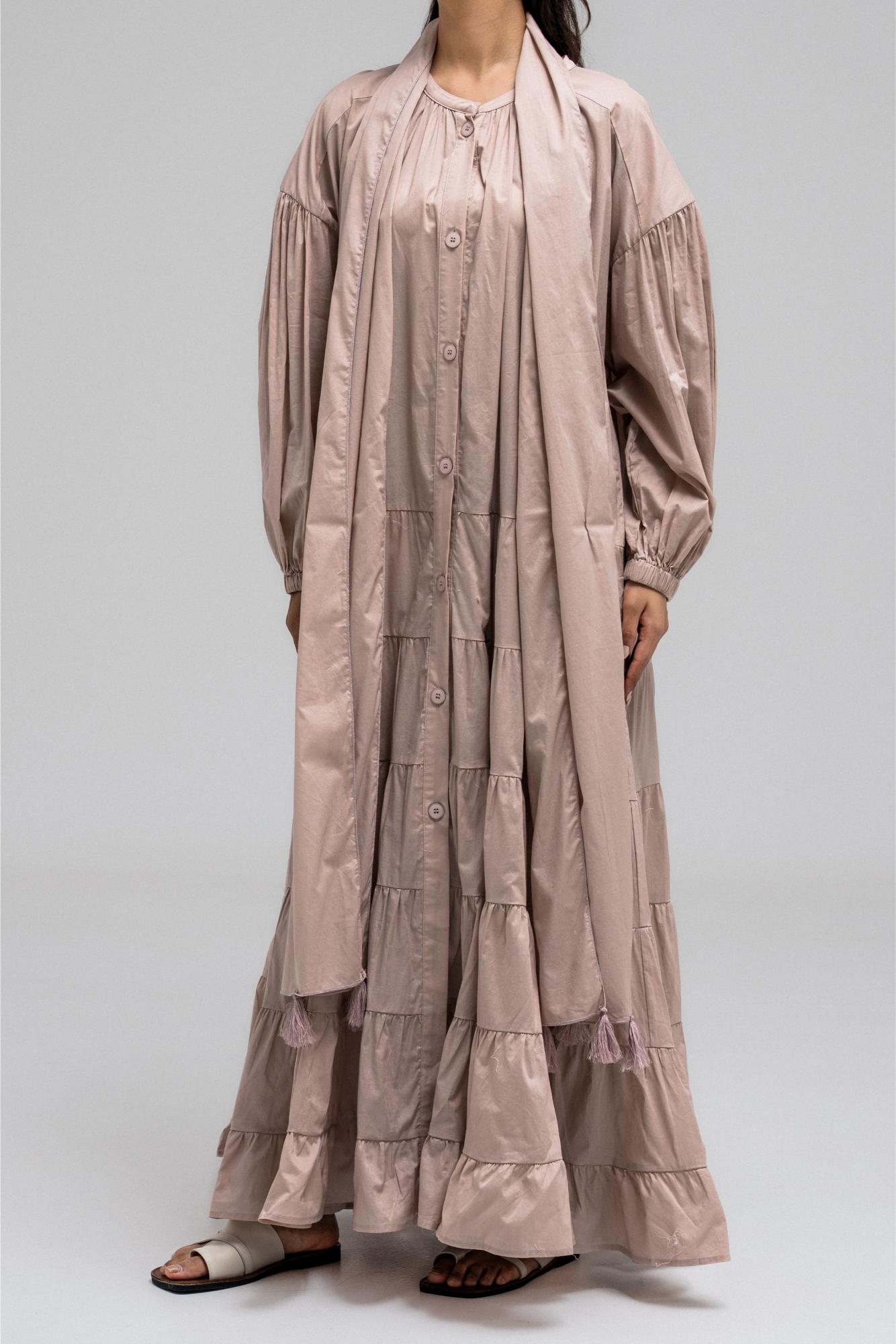 This effortlessly elegant dress features a round neck collar, flowy silhouette, and a ruffled hem for added movement. Designed with side pockets and elastic cuffs for a soft, gathered sleeve look. It comes with a matching long scarf that adds versatility. it can be worn as a waist belt, draped around the neck, or styled freely to elevate your look.
