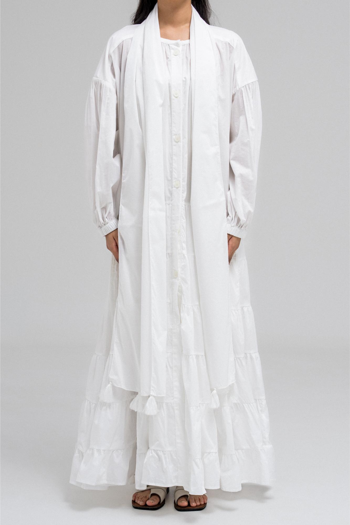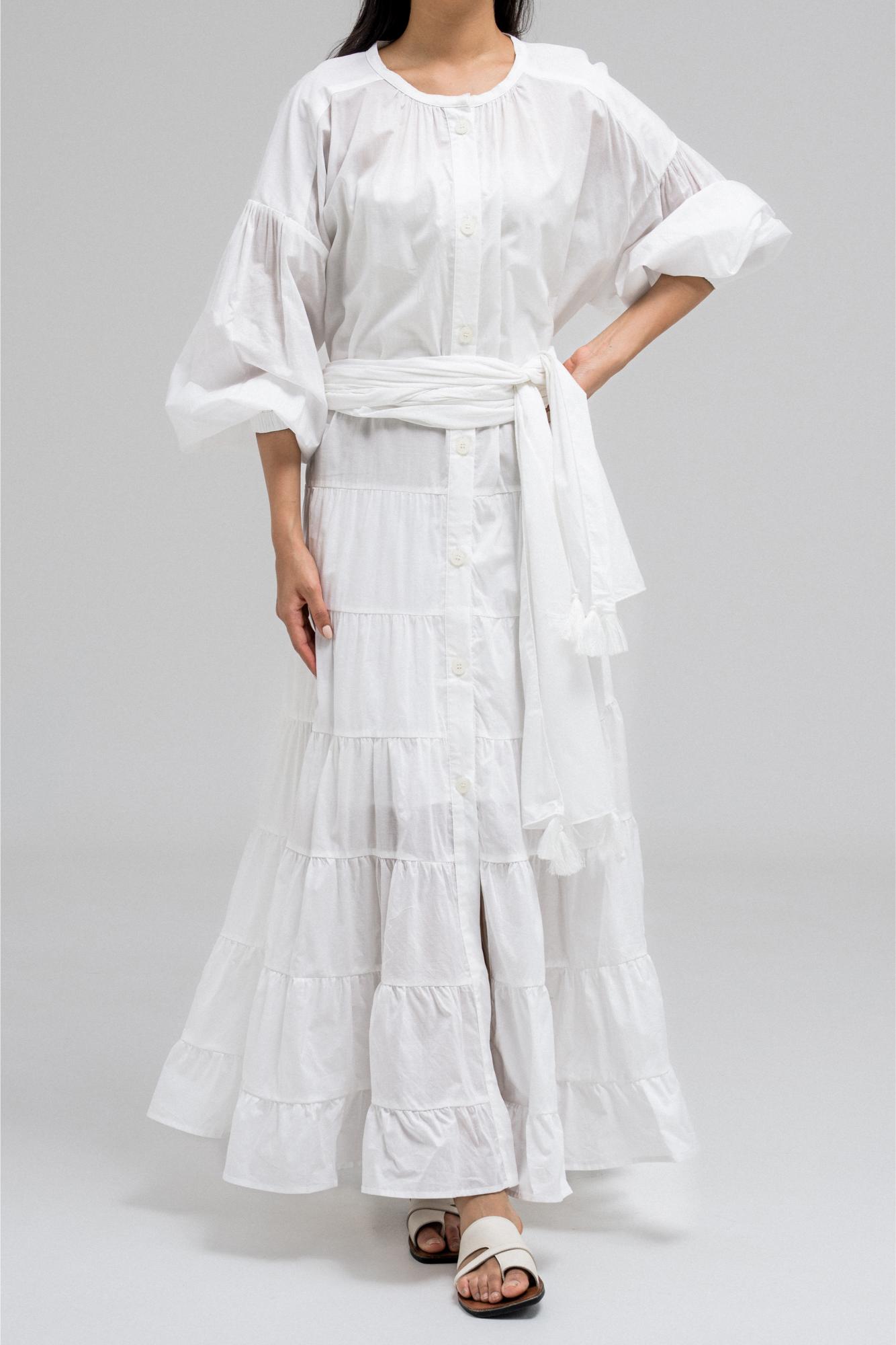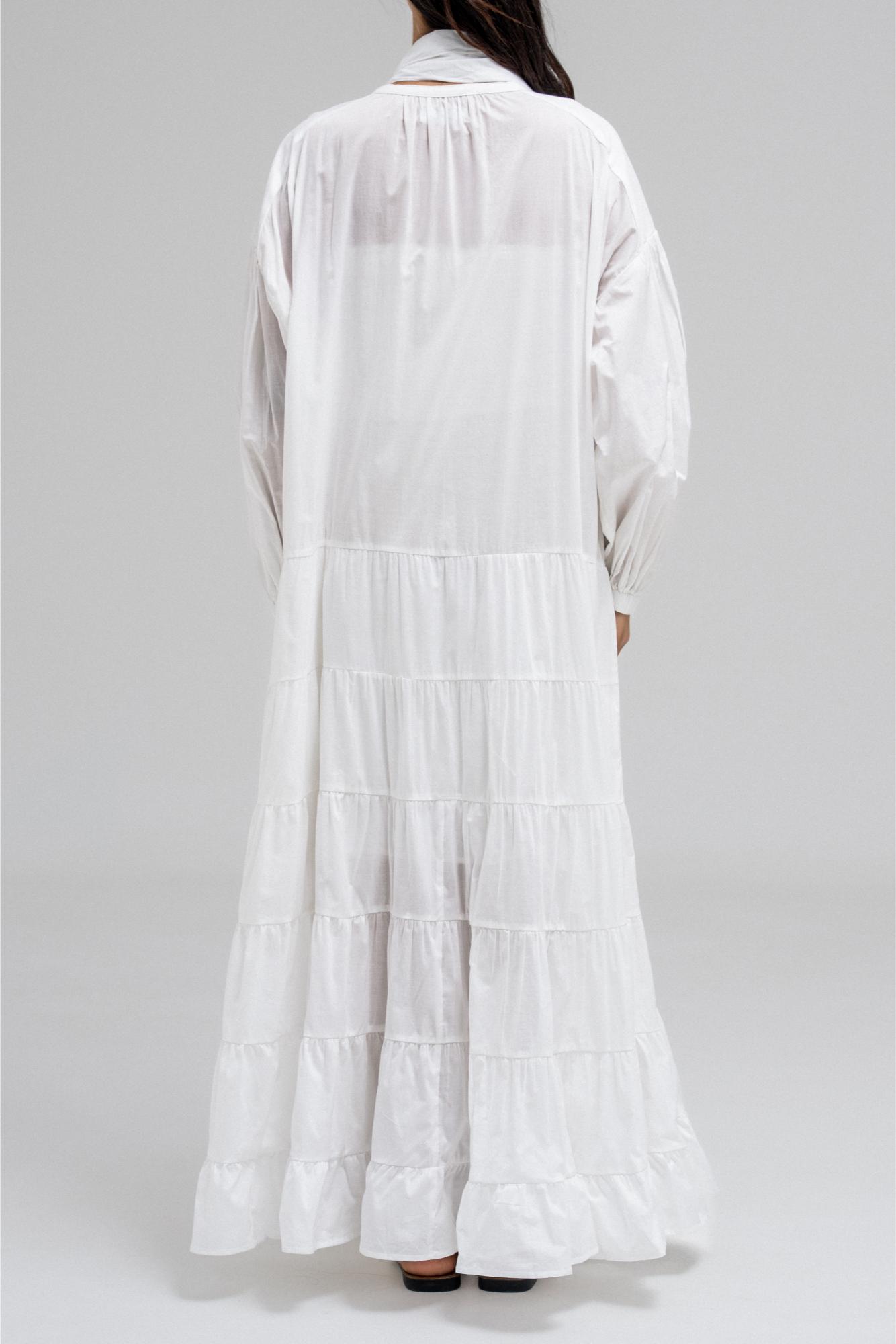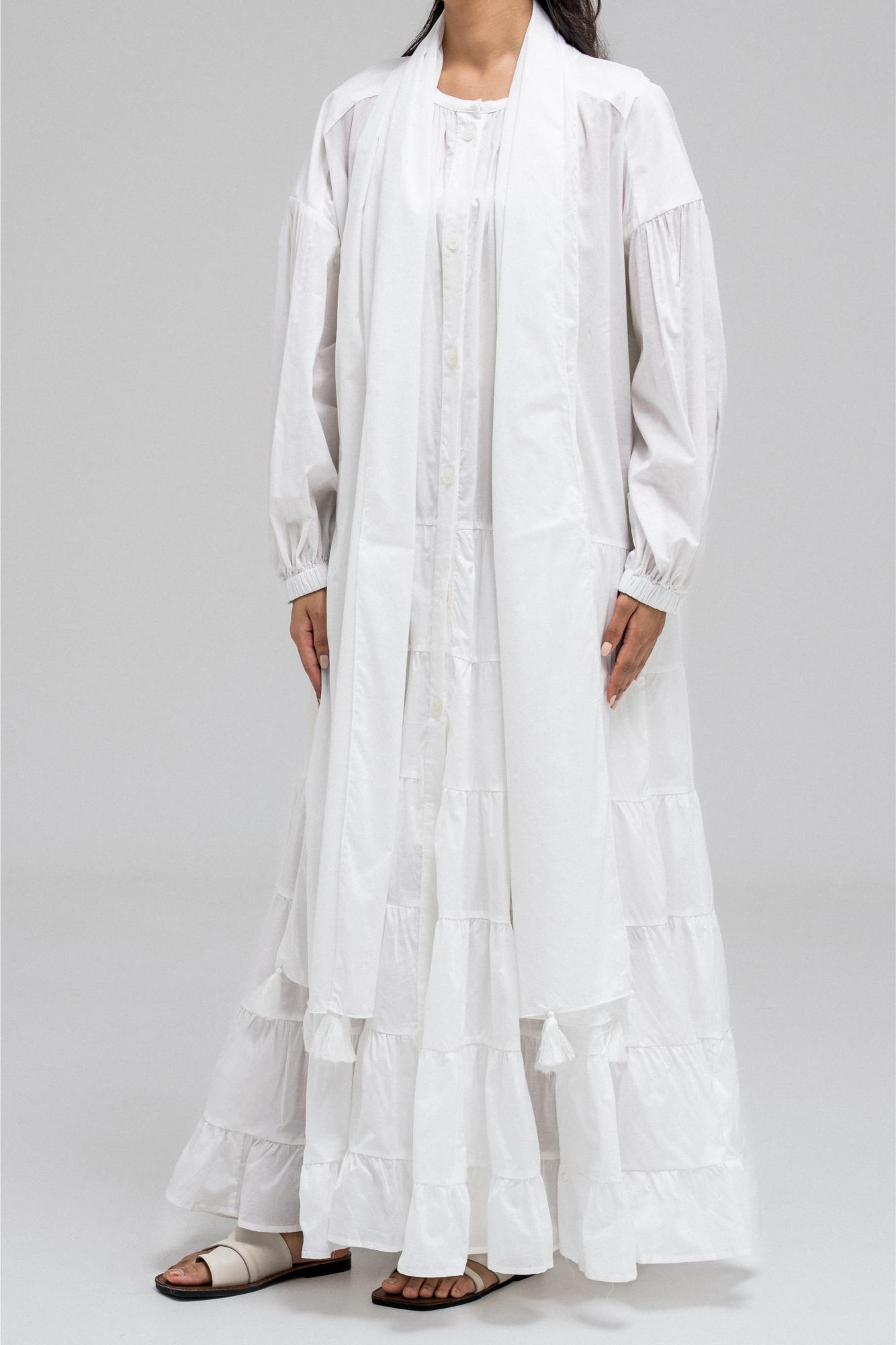 This effortlessly elegant dress features a round neck collar, flowy silhouette, and a ruffled hem for added movement. Designed with side pockets and elastic cuffs for a soft, gathered sleeve look. It comes with a matching long scarf that adds versatility. it can be worn as a waist belt, draped around the neck, or styled freely to elevate your look.
