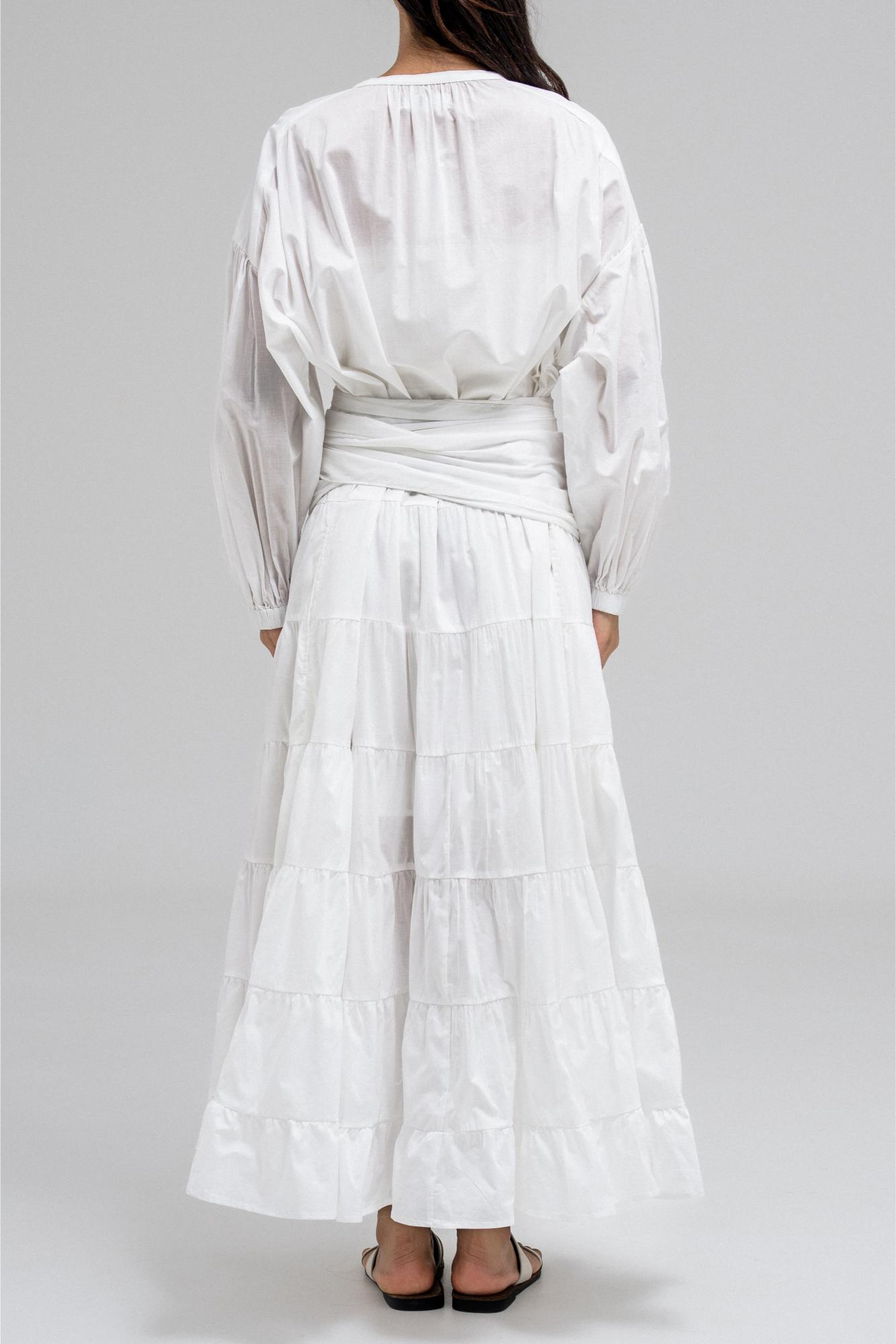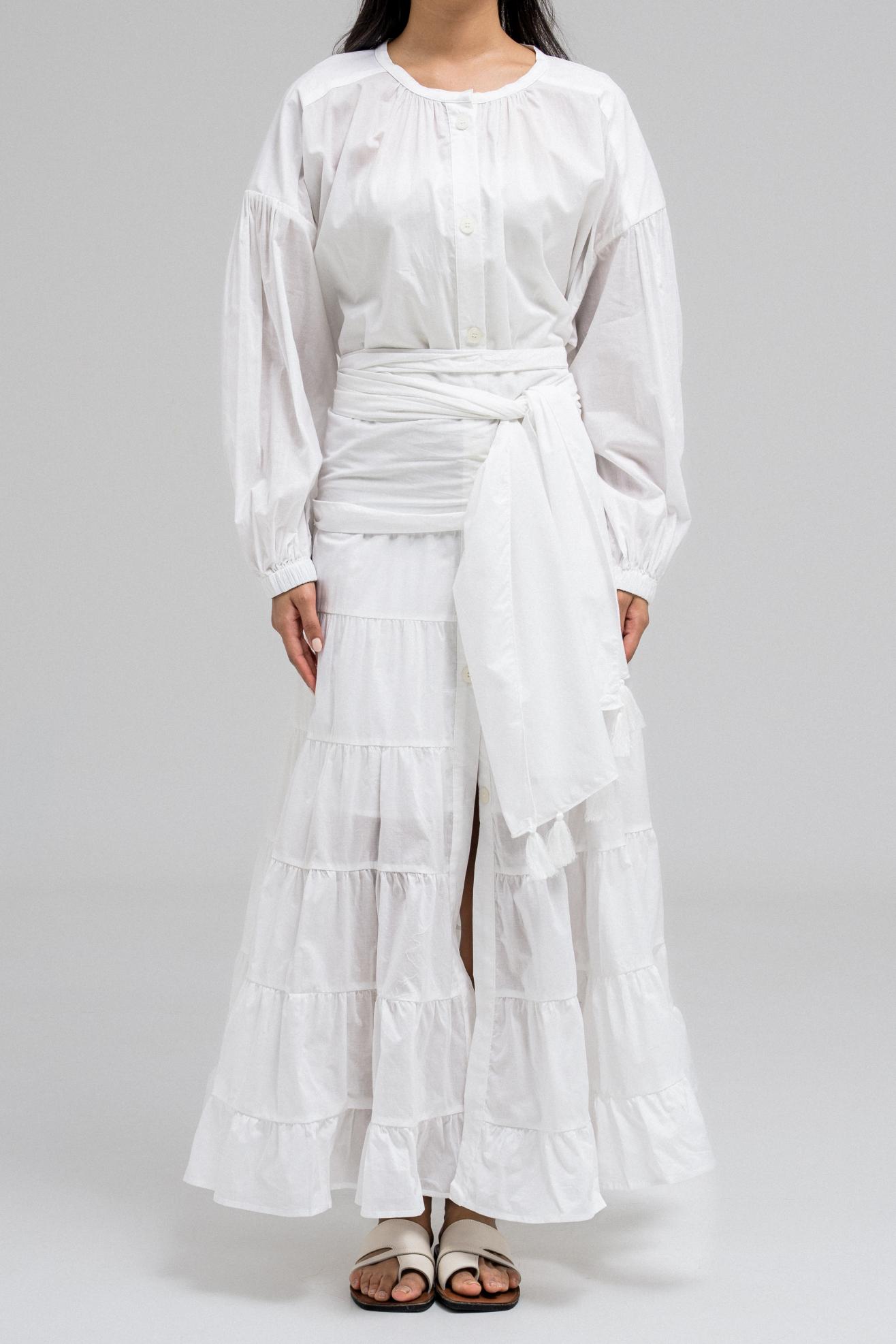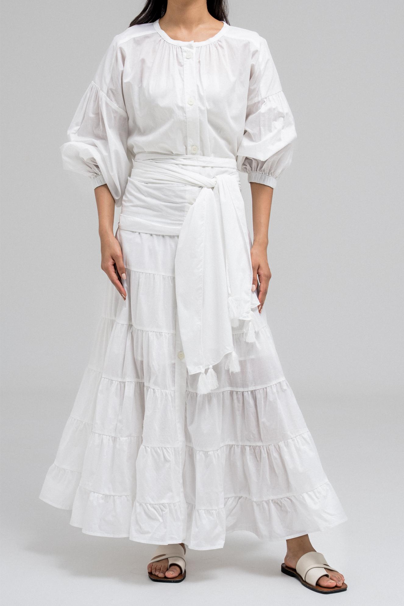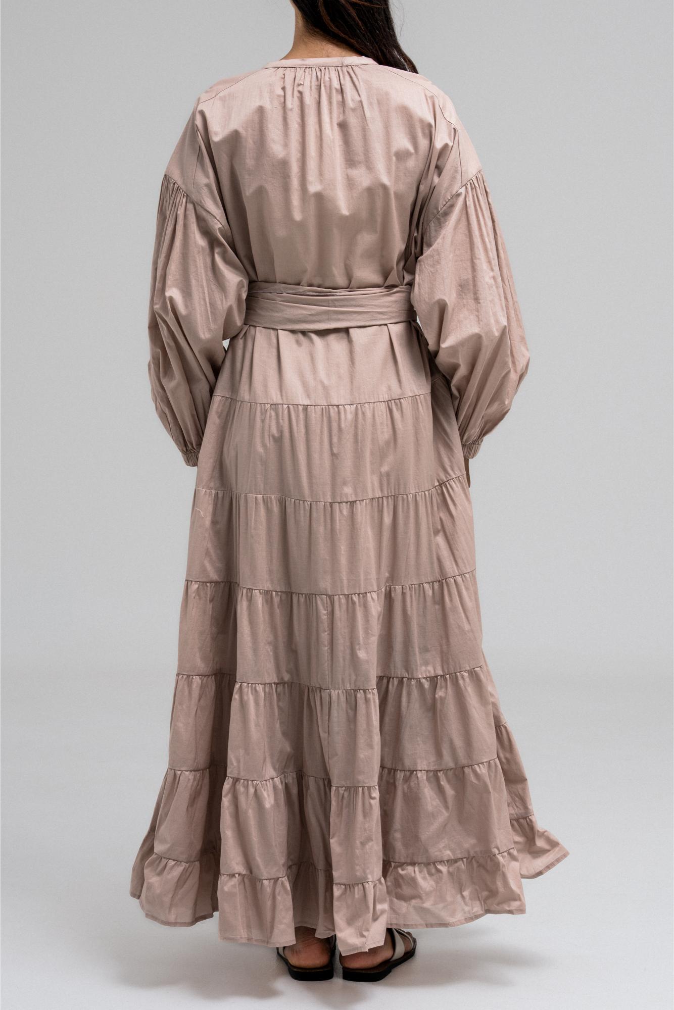 This effortlessly elegant dress features a round neck collar, flowy silhouette, and a ruffled hem for added movement. Designed with side pockets and elastic cuffs for a soft, gathered sleeve look. It comes with a matching long scarf that adds versatility. it can be worn as a waist belt, draped around the neck, or styled freely to elevate your look.