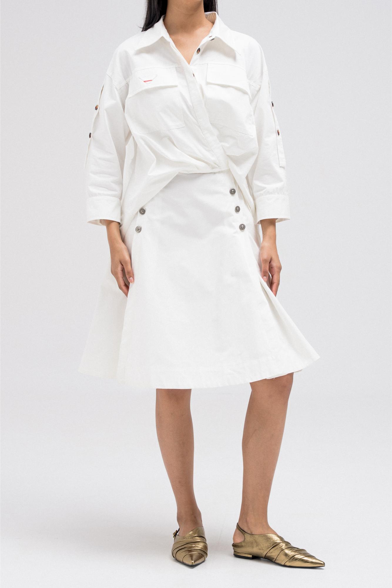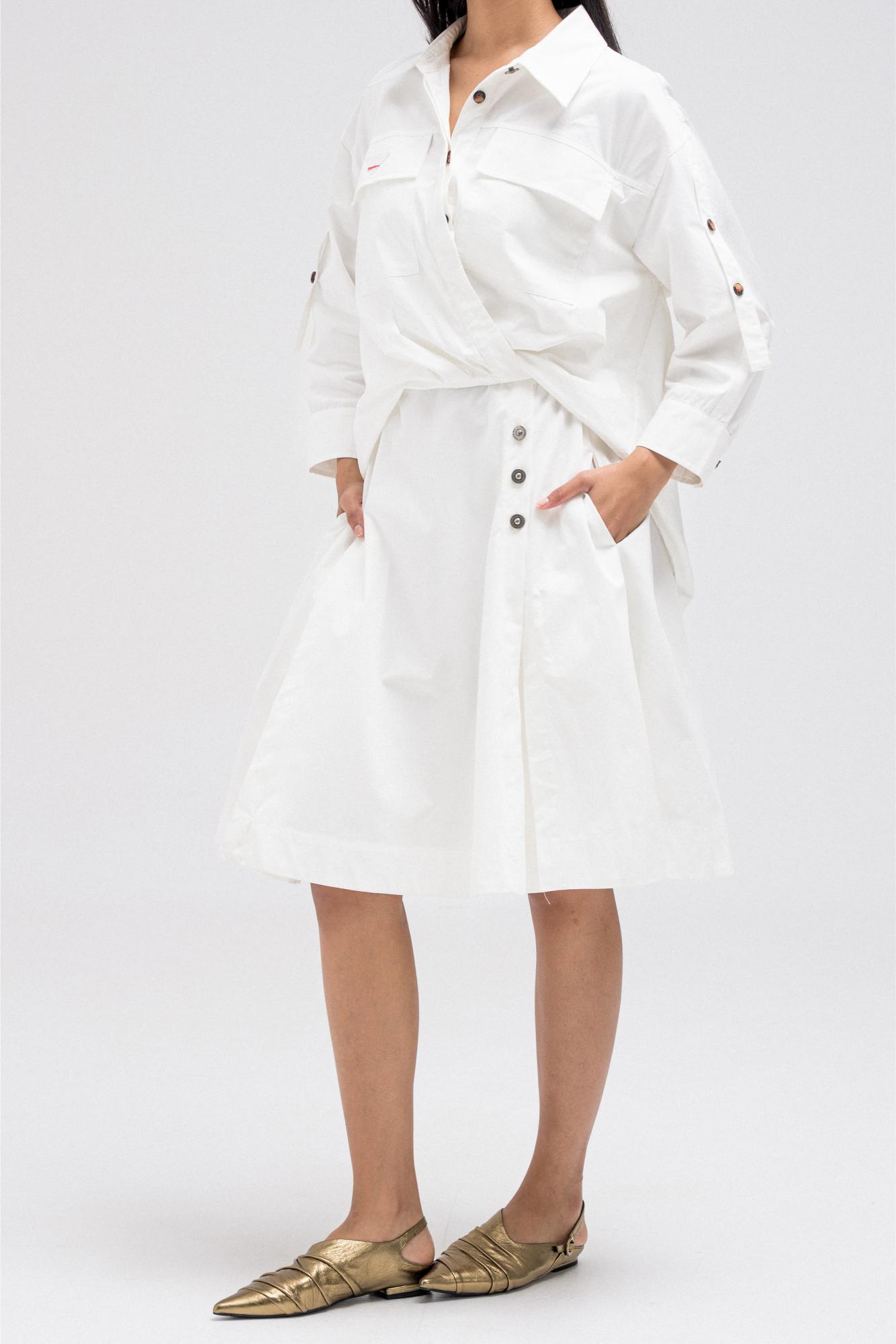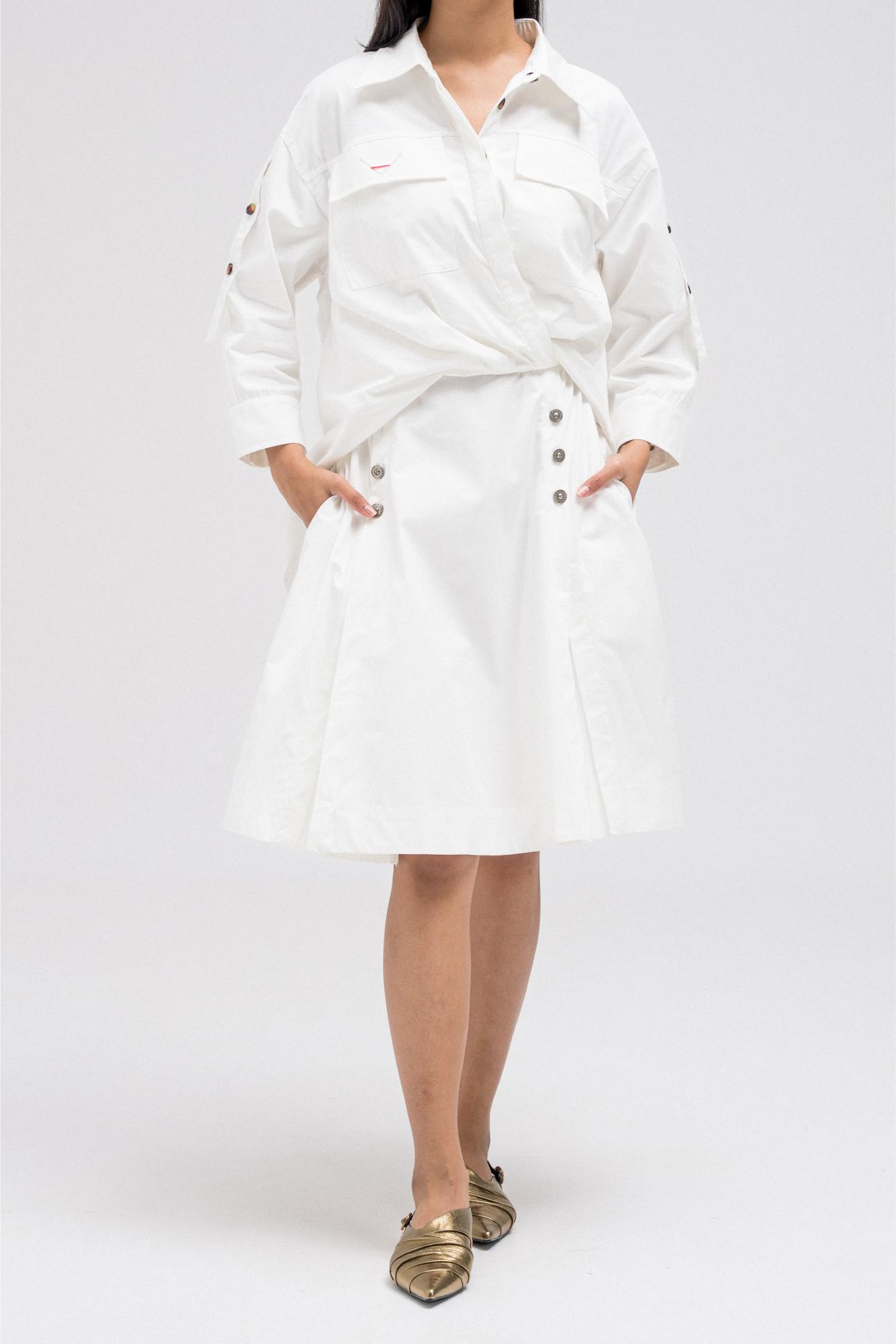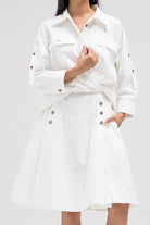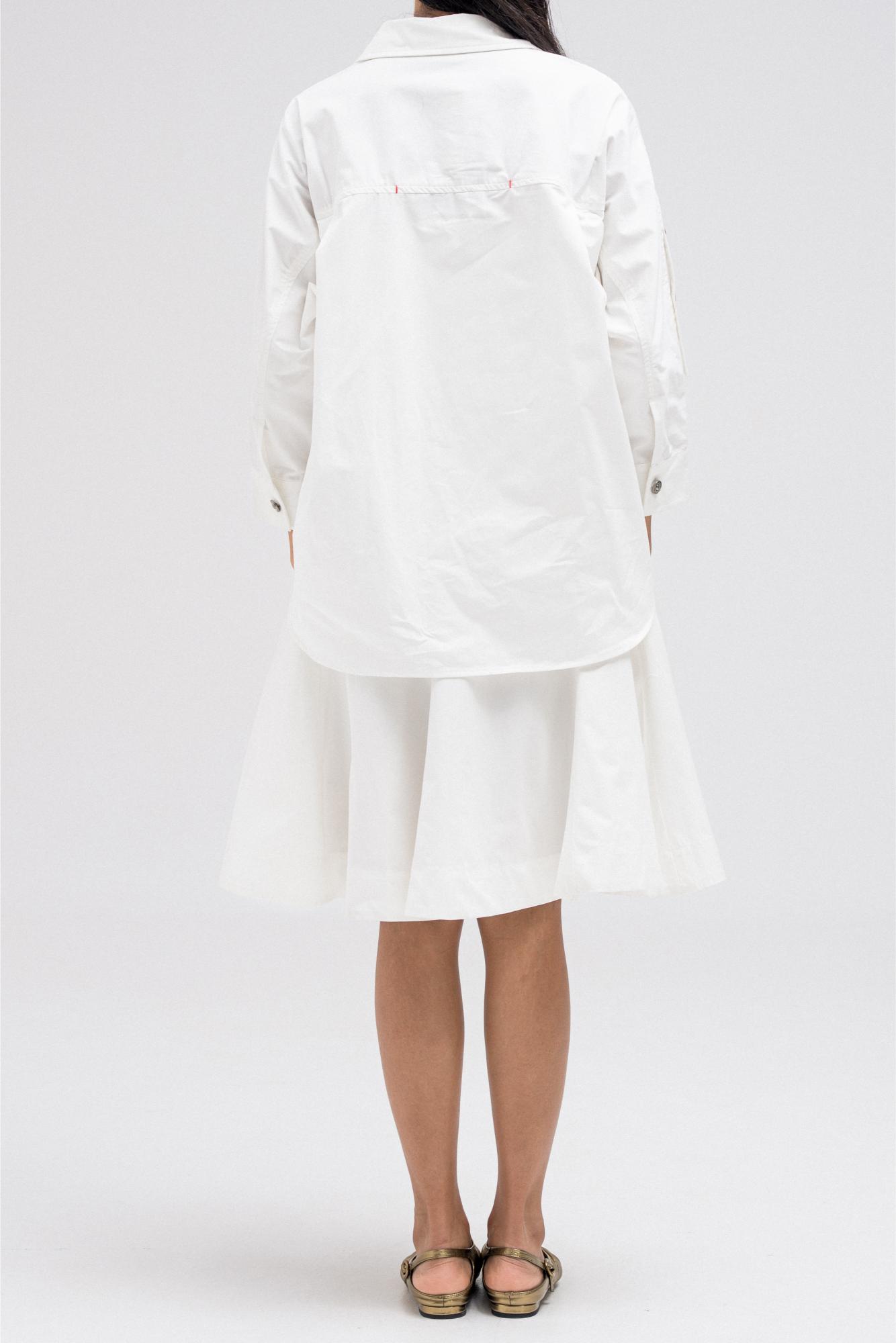 This shirt-style dress is designed as a single piece while giving the illusion of a styled, layered outfit. The upper features a classic button-down shirt silhouette with structured details, while the lower part mimics a skirt layered underneath for a modern, fashion-forward look. At the back, the dress reveals a longer shirt-style panel combined with an elasticated skirt waistband, adding comfort and flow while enhancing the layered effect. A unique statement piece that blends structure and ease effortlessly.