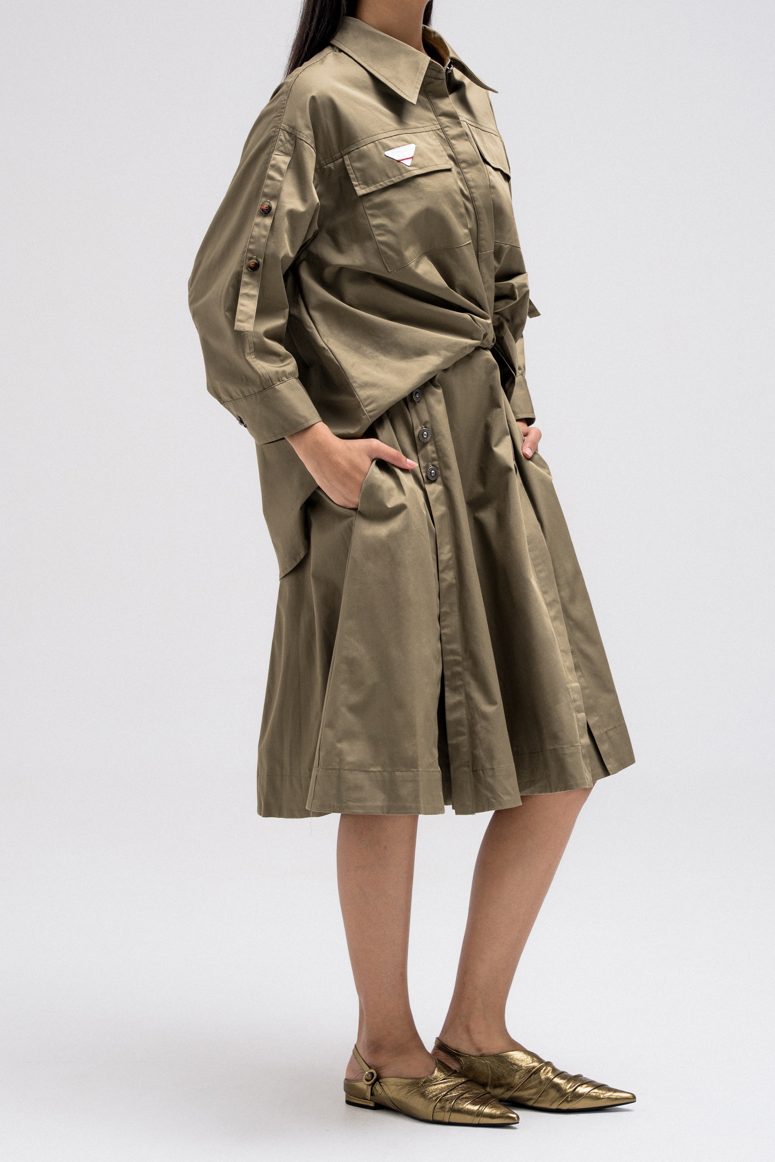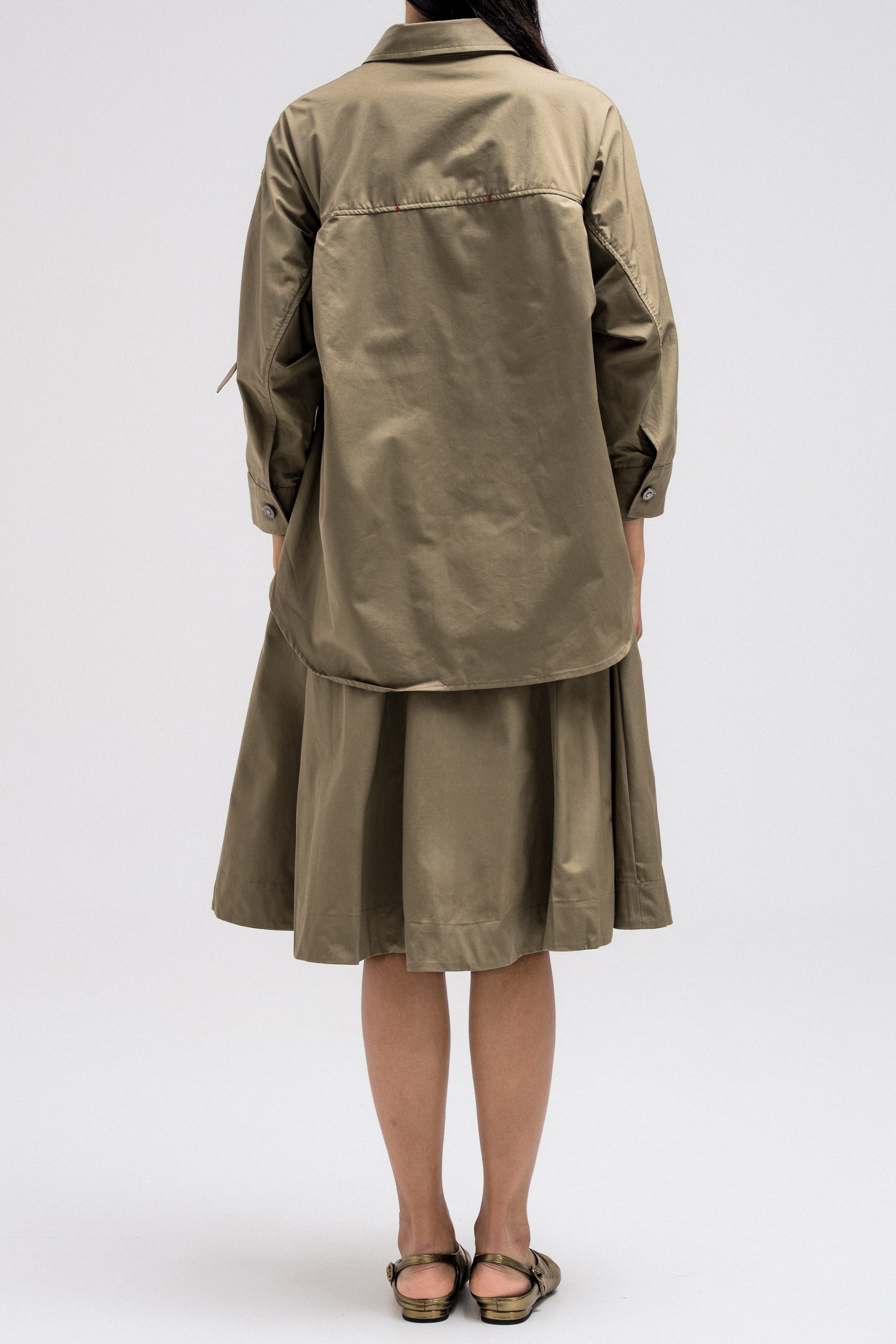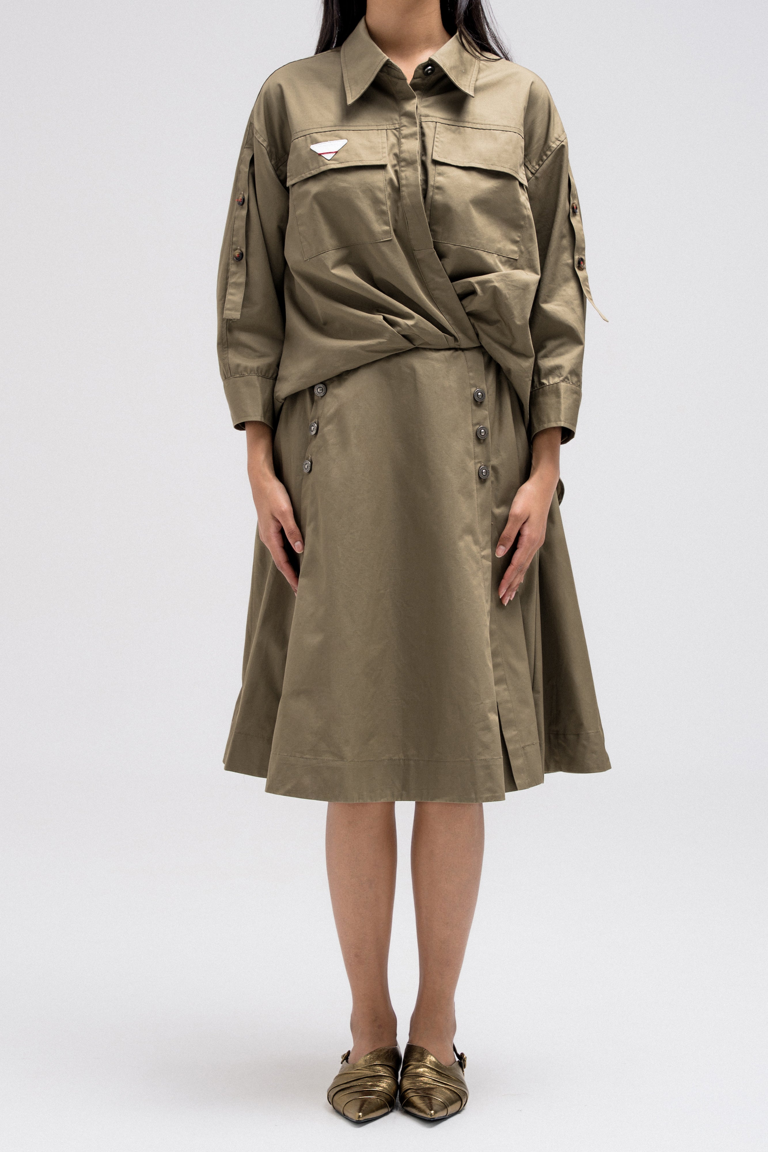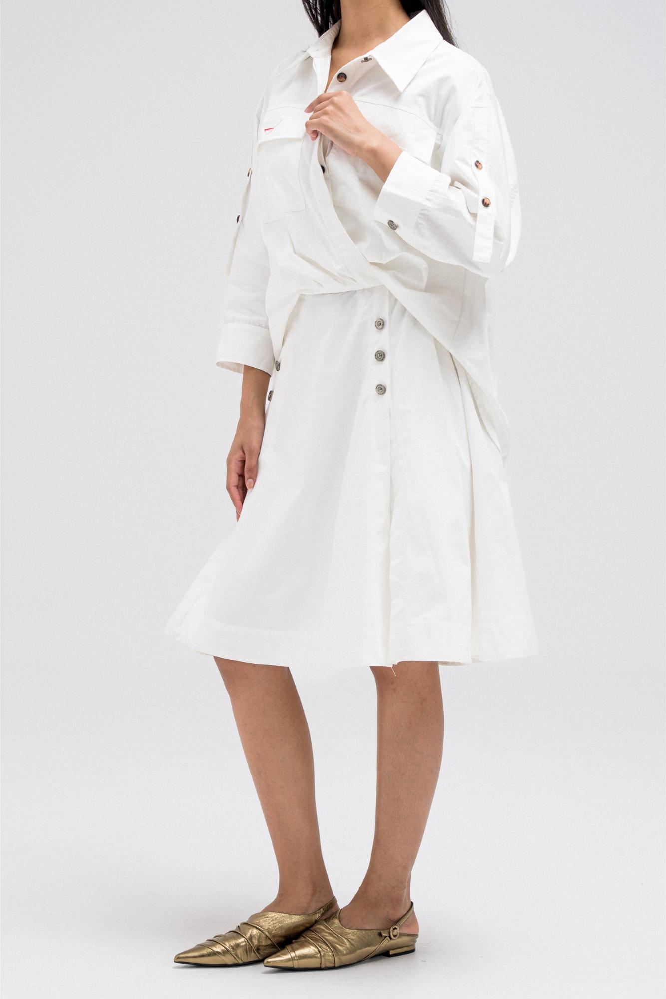 This shirt-style dress is designed as a single piece while giving the illusion of a styled, layered outfit. The upper features a classic button-down shirt silhouette with structured details, while the lower part mimics a skirt layered underneath for a modern, fashion-forward look. At the back, the dress reveals a longer shirt-style panel combined with an elasticated skirt waistband, adding comfort and flow while enhancing the layered effect. A unique statement piece that blends structure and ease effortlessly.
