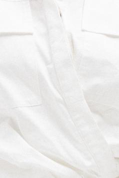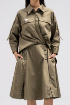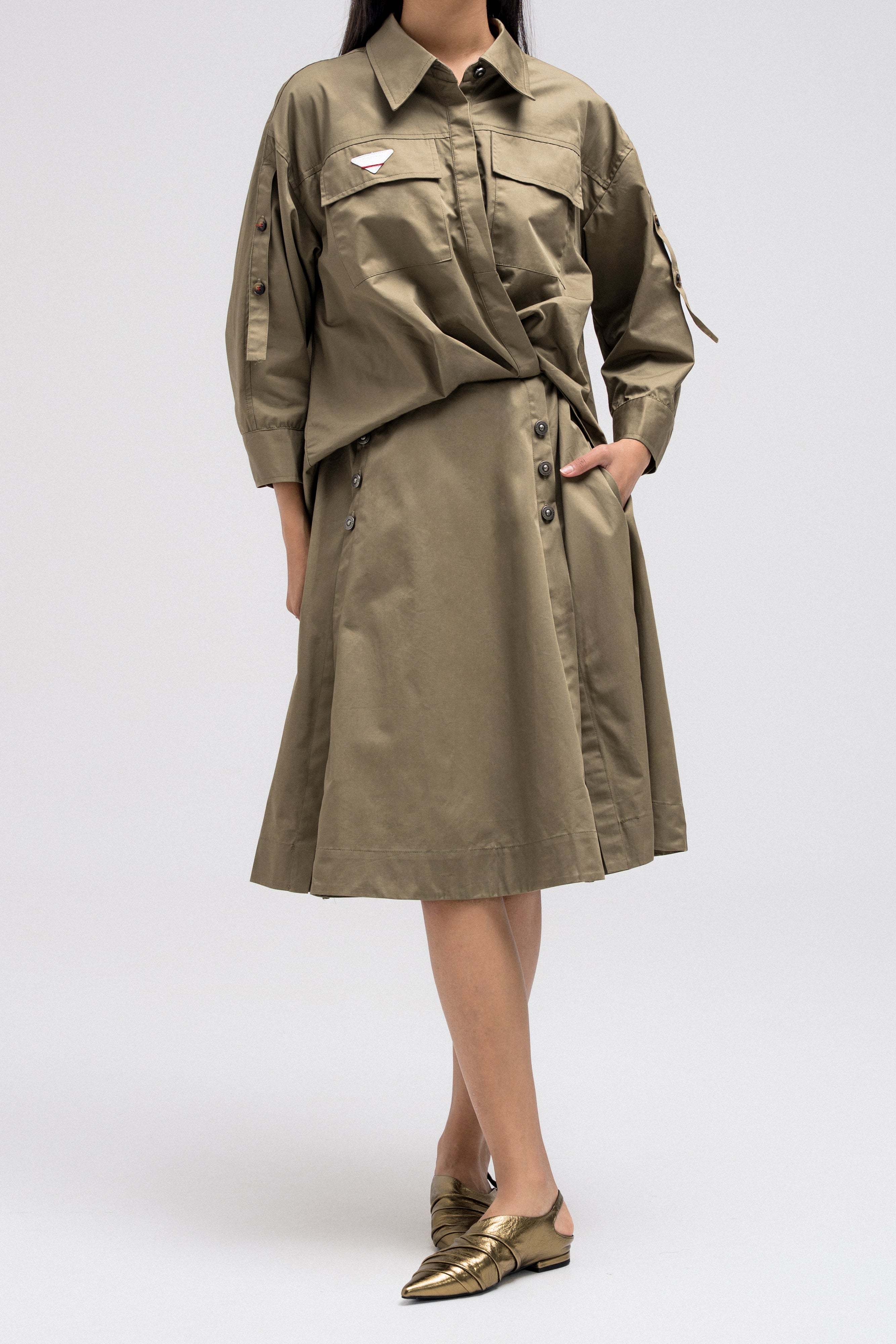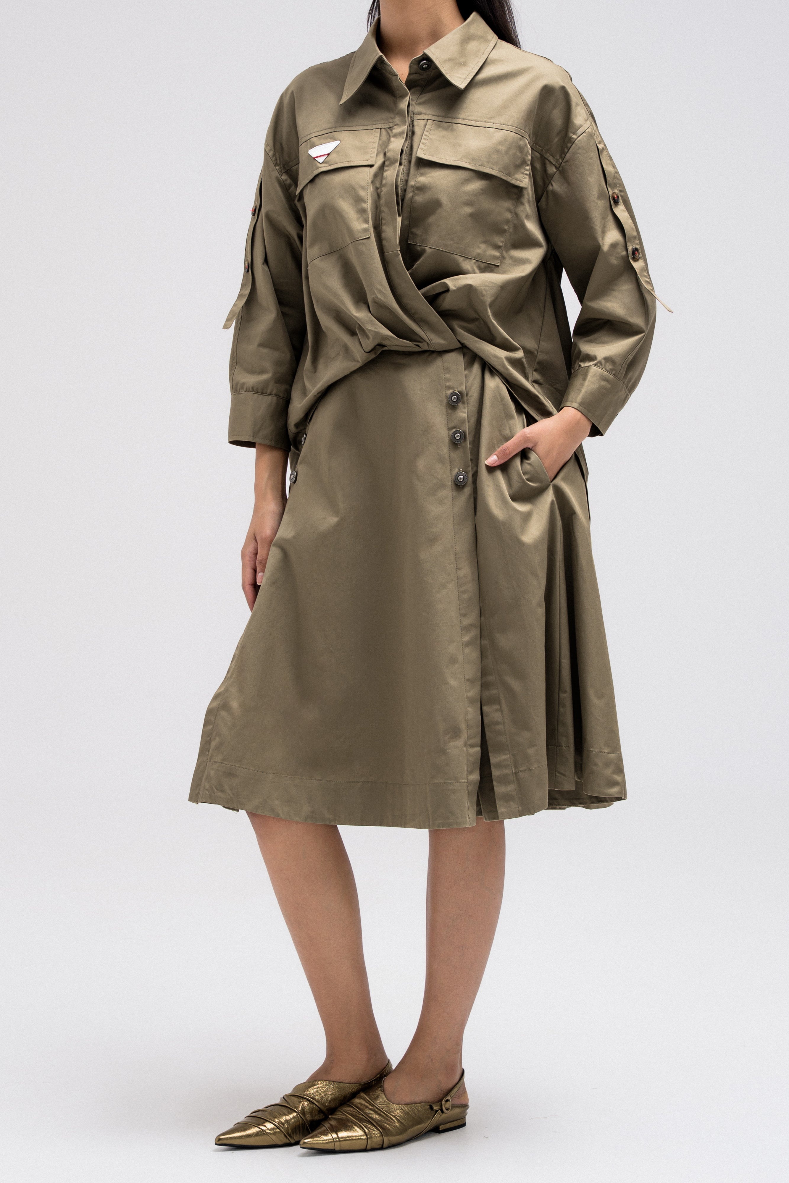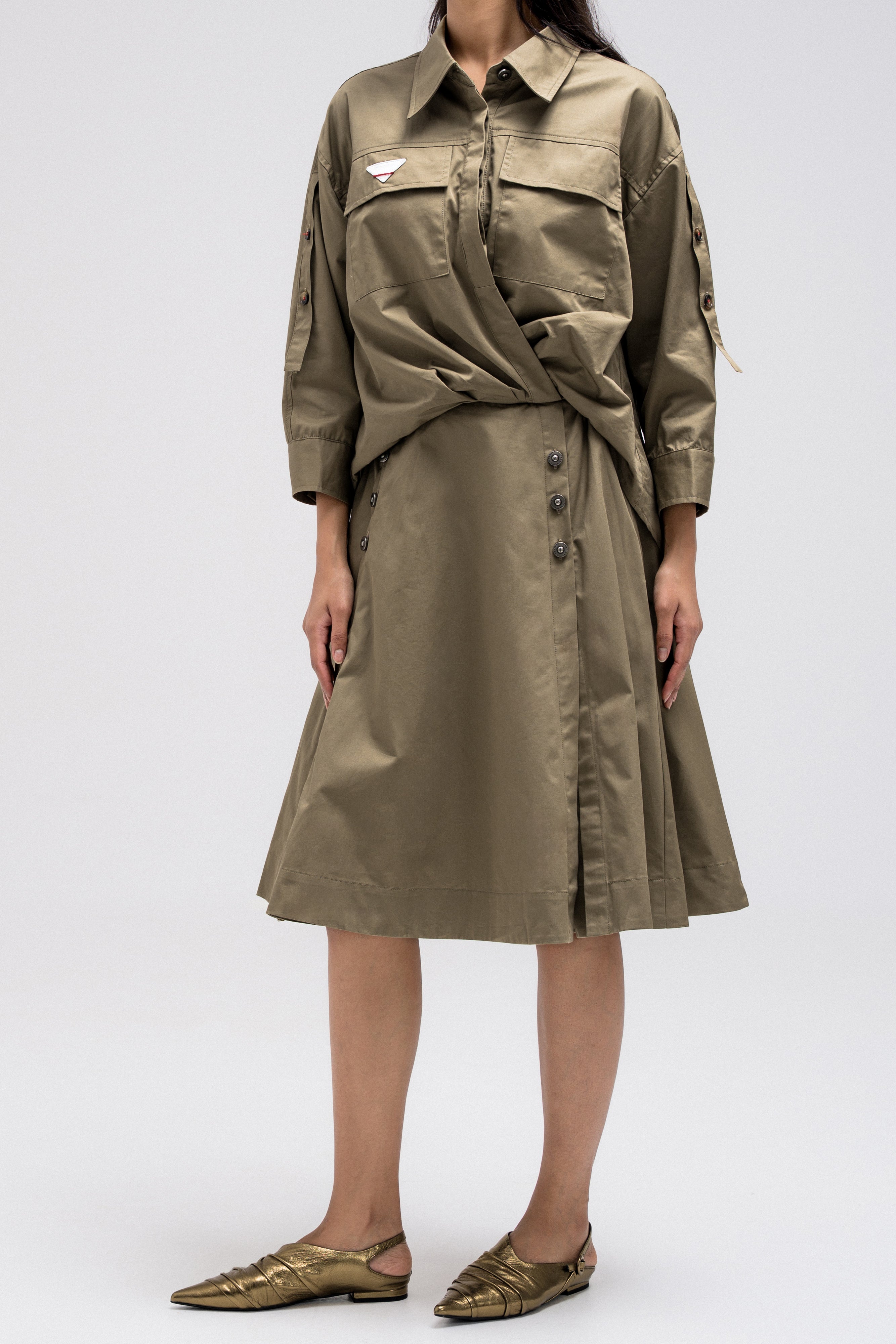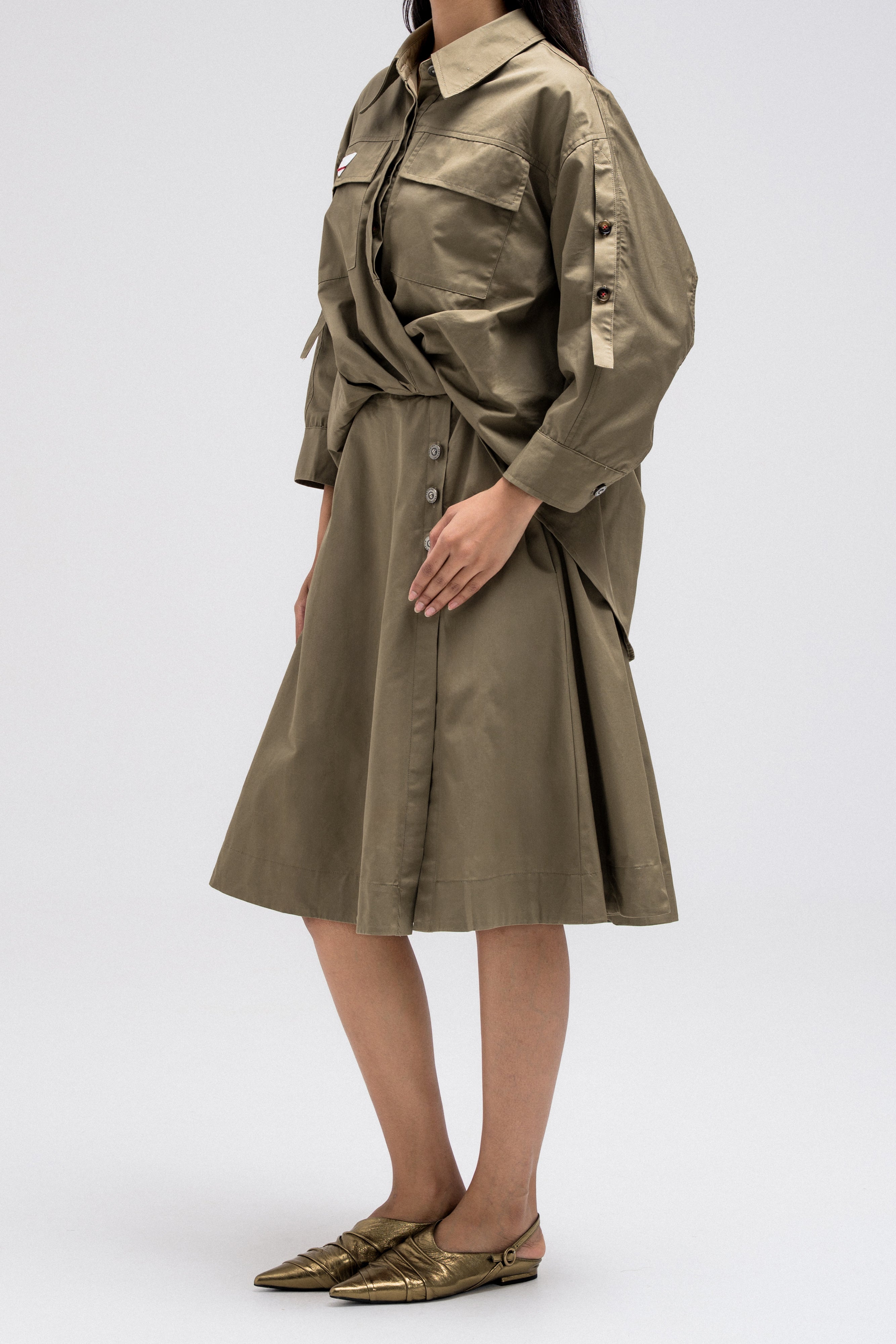 This shirt-style dress is designed as a single piece while giving the illusion of a styled, layered outfit. The upper features a classic button-down shirt silhouette with structured details, while the lower part mimics a skirt layered underneath for a modern, fashion-forward look. At the back, the dress reveals a longer shirt-style panel combined with an elasticated skirt waistband, adding comfort and flow while enhancing the layered effect. A unique statement piece that blends structure and ease effortlessly.