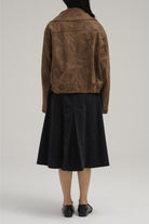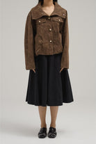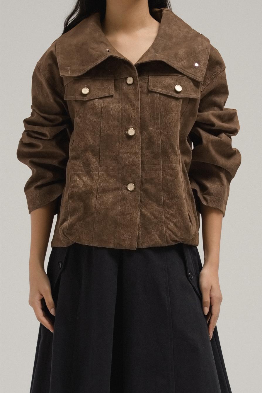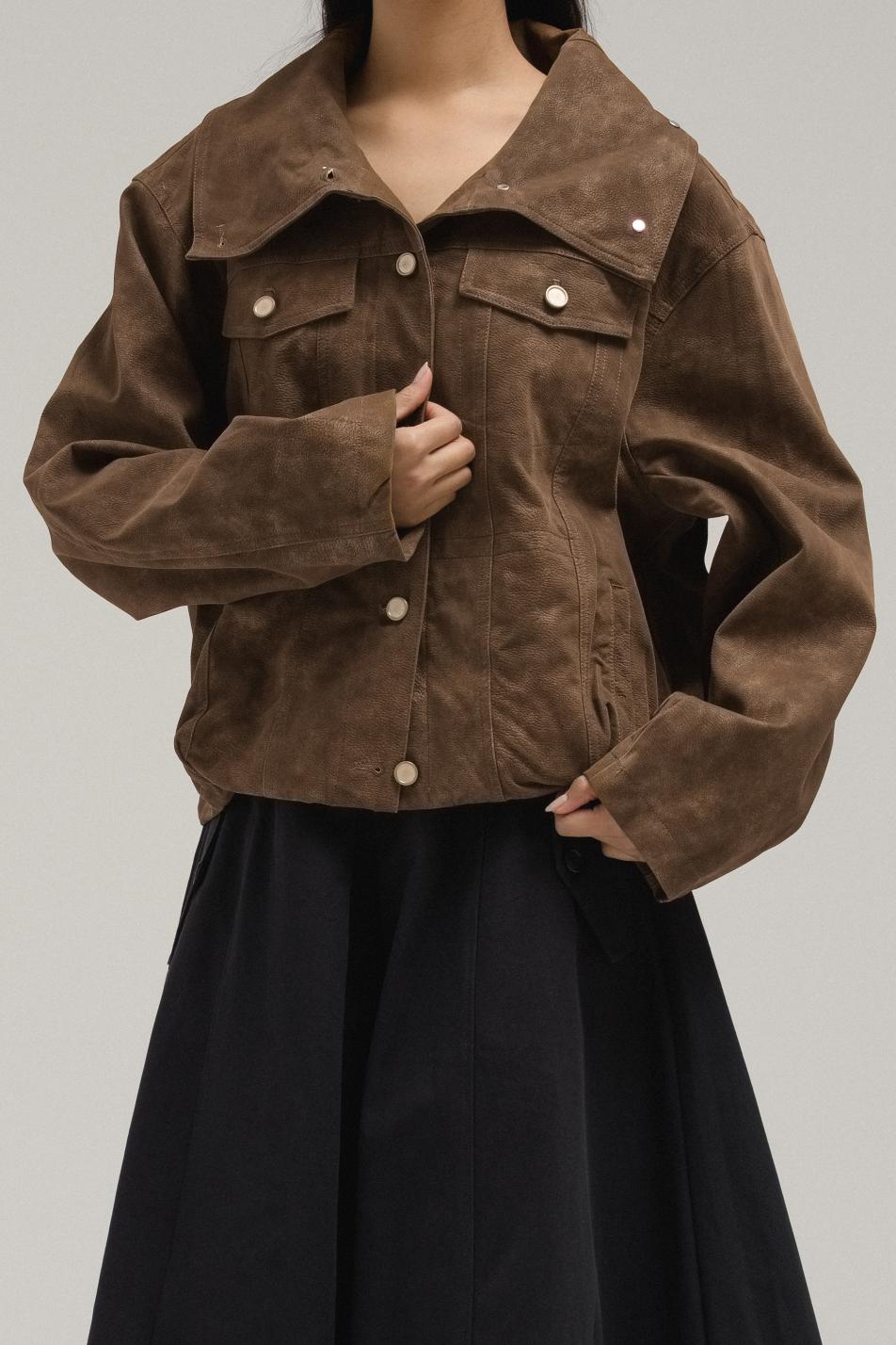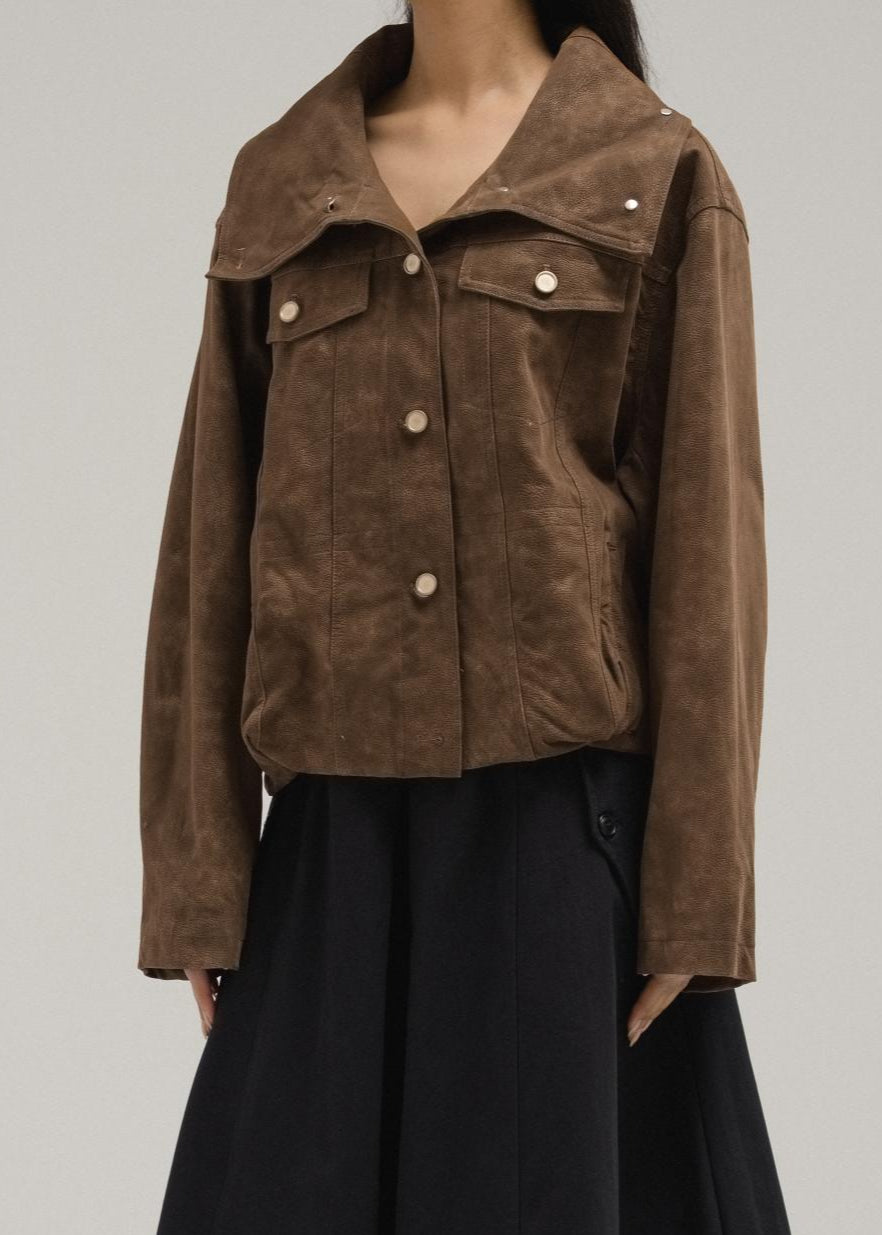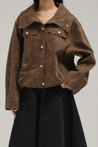 Crafted from soft suede, this jacket blends minimal structure with timeless ease. It comes with a wide-point collar, snap-button front closure, and subtle flap accents across the chest. Slightly cropped with a boxy fit, it’s a versatile layering piece for casual to semi-polished outfits.